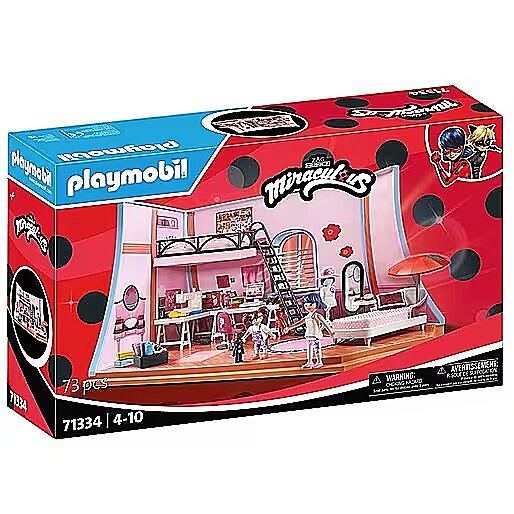 Technical_details - With the PLAYMOBIL sets from the Miraculous series, the magical world of the series around the superhero Marinette comes to life! This set includes a replica of Marinette's loft - true to her home in the series. It is fully equipped with a desk, chair, computer, bed, standing mirror, chaise longue, sewing machine, dressing mannequin and much more. The base plate and side walls are realistically printed. By operating the side crank, the sewing machine needle moves up and down. With Marinette and Manon Chamack, two PLAYMOBIL figures that match the series are included in this set with 73 pieces. Item no.: 100035547 Kind of construction toy EAN 4008789713346 Manufacturer no. 71334 Miraculous series Parts 73 pieces Contents/equipment figures: 1x Marinette, 1x Manon. Accessories: Loft with stairs and bed, 2 desks, 1 swivel chair, 2 controllers, 1 table lamp, 1 computer with keyboard, 1 sewing machine with pedal, 1 box, 2 boxes with lids, 2 pens, 2 hair ties, 1 standing mirror with table, 1 Brush, 1 chaise longue with umbrella, 1 pillow, 2 hero dolls, 1 dressing doll with wig and hat, 2 fabrics, 3 balls of thread, 1 tape measure, 1 scissors Age recommendation from 4 years to 10 years Target group kindergarten children, school children Material: Plastic Warnings Warning: Not suitable for children under 36 months! Caution: Danger of suffocation due to small parts that can be swallowed!