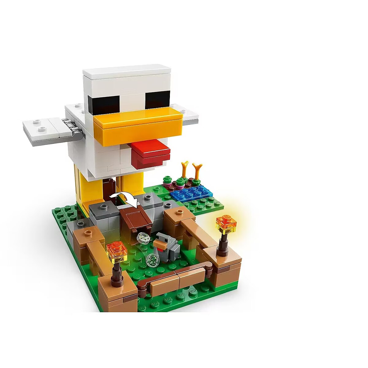 Description - Blocks Minecraft 21585 Chicken Farm Take care of chickens and grow crops with the LEGO Minecraft Chicken Farm set (21585) for girls and boys aged 7 and up. This kids building set challenges players to look after an adult chicken and a baby chicken alongside a Chicken Lover minifigure, while also dealing with a fox (which likes to eat adult chickens) and a baby zombie (which likes to ride chickens). The toy chicken coop is shaped like a chicken and features movable wings, a front pen, and an opening gate. The giant chicken lays eggs at the back and dispenses seeds from its beak into a container that tips forward when the chickens need feeding. Fun accessories include torches, hay, a smoker furnace, two eggs, two sets of seeds, a chicken drumstick, a feather, and an axe. This set makes a great gift idea for Minecraft players, LEGO builders, and fans of gaming-themed decorations. The LEGO Builder app is included, allowing kids to zoom in, rotate models in 3D, and track their progress with easy-to-follow digital instructions. The set contains 233 pieces.