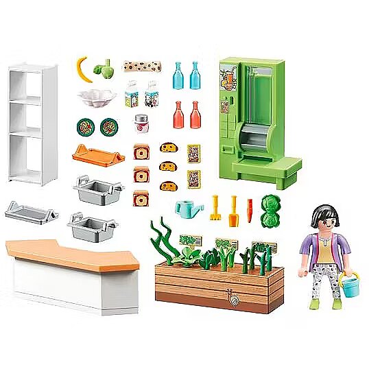 Description - PLAYMOBIL Lunch Kiosk with a PLAYMOBIL figure, counter, fruit, snacks and fillable bottle machine. As soon as the school bell sounds, everyone rushes to the Lunch Kiosk. What delicious food from the school garden will be available today? Get your drinks at the fillable bottle vending machine. With the PLAYMOBIL set School Kiosk, children aged 4 years and up can recreate exciting adventures and everyday situations. The toy set includes a PLAYMOBIL figure, a sales counter, various types of fruit and snacks, and a functioning bottle machine that can be filled with bottles. A great birthday gift or any-day treat for creative children. The Lunch Kiosk can be played with on its own or combined with the other school sets in the PLAYMOBIL City Life series (sold separately).