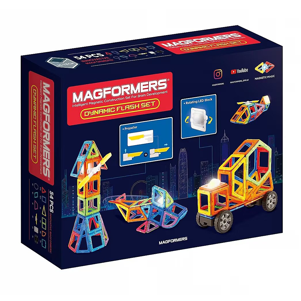 Description - Magformers jest globalnym producentem niezwykłych i oryginalnych klocków magnetycznych, wykonanych z wysokiej jakości materiałów. Każdy klocek zawiera neodymowe magnesy, które silnie się ze sobą przyciągają. Dynamic Flash to produkt, który świetnie sprawdzi się wśród najmłodszych. 54 elementy znajdujących się w opakowaniu pozwala na złożenie wielu trójwymiarowych konstrukcji. Można układać je samodzielnie lub czerpać inspirację z podręcznika dołączonego do zestawu.