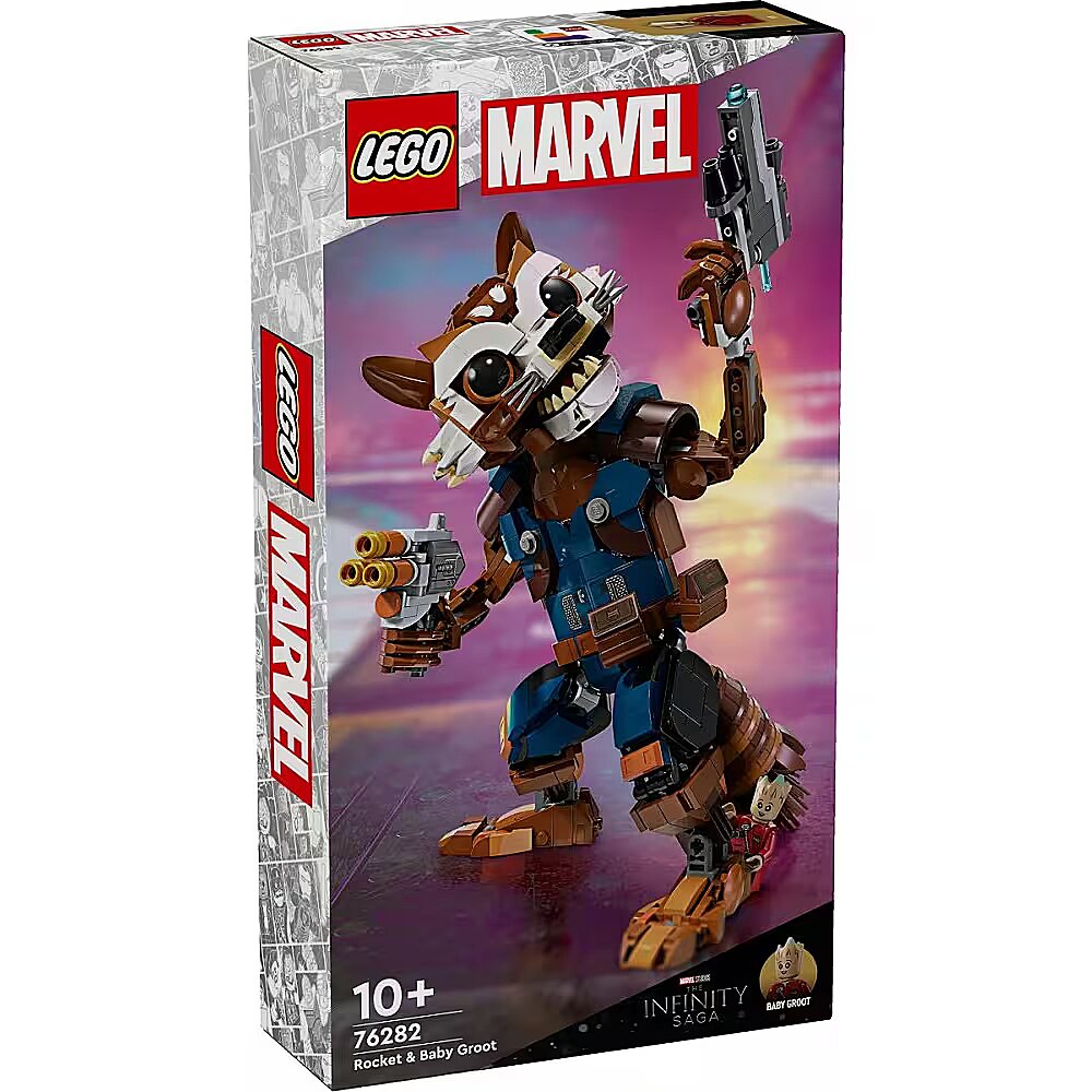 Description - Take Marvel film action to the next level with LEGO Marvel Rocket & Baby Groot (76282). This buildable toy for boys and girls aged 10+ is jointed, authentically detailed and stands over 22 cm (8.5 in.) tall. More than just a kids' construction toy, this Rocket action figure is a realistic recreation of an iconic character from Marvel Studios Guardians of the Galaxy. The posable, buildable model captures the heros rebellious attitude and love of weapons. All joints (except the elbows) are movable for maximum play-and-display possibilities. The character holds a spring shooter and blaster in his hands. On his shoulder sits his cute companion, Baby Groot. If youre looking for trendy buildable toys for young Super Heroes, LEGO Marvel Rocket & Baby Groot is the perfect choice for kids who want to showcase their Super Hero style. For added digital fun, builders can zoom in, rotate models in 3D and track their progress using the fun, intuitive LEGO Builder app. Rocket action figure for kids Take Marvel movie action to the next level with the LEGO Marvel Rocket & Baby Groot buildable toy for boys and girls aged 10 and up 2 Marvel characters This buildable toy features 2 Guardians of the Galaxy: Rocket, holding a spring shooter and a blaster, and a Baby Groot minifigure that attaches to Rockets shoulder Posable action figure Kids dynamically adjust the jointed build-and-play Rocket model as they role-play missions with the Guardians of the Galaxy and imaginative adventures of their own Many ways to play and display This buildable LEGO Marvel toy is fun to construct and delivers endless play-and-display possibilities LEGO gift for movie lovers Fans of action movies and Marvel Studios Guardians of the Galaxy can enjoy endless playtime fun with this authentically detailed, fully jointed Rocket action figure 3D building instructions Kids can download the LEGO Builder app for an immersive building experience, withdigital tools to zoom in and rotate models in 3D, save sets and track progress LEGO Marvel range The extensive choice of LEGO Marvel building toys and models is designed to inspire all young Super Heroes with endless hands-on, creative adventures 566-piece buildable toy This Rocket action figure stands over 8.5 in. (22 cm) tall