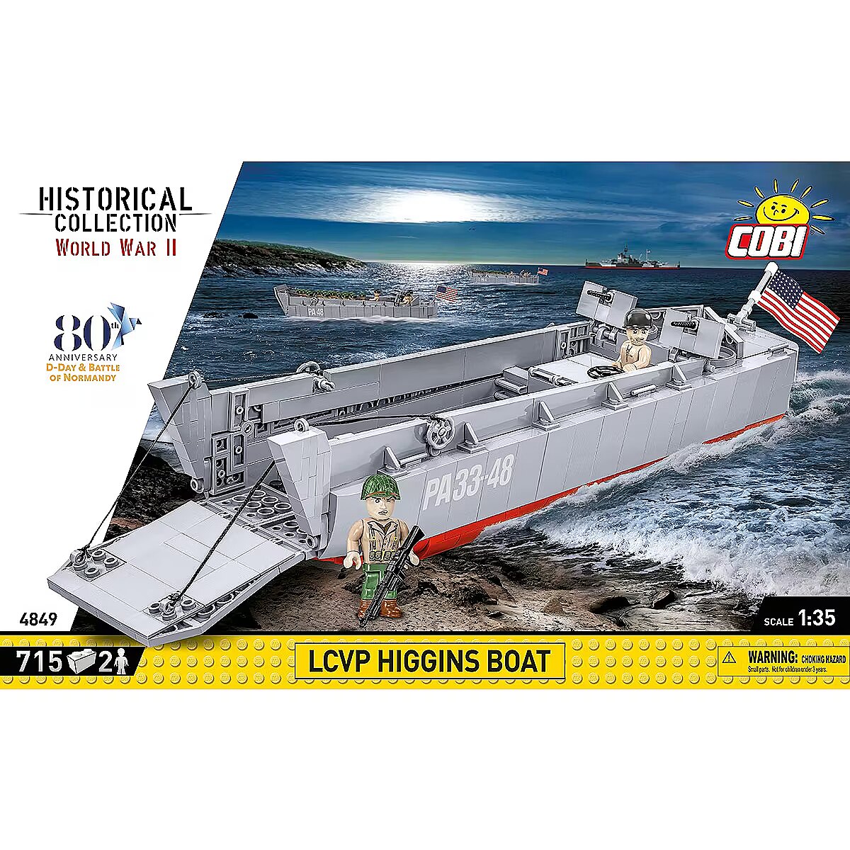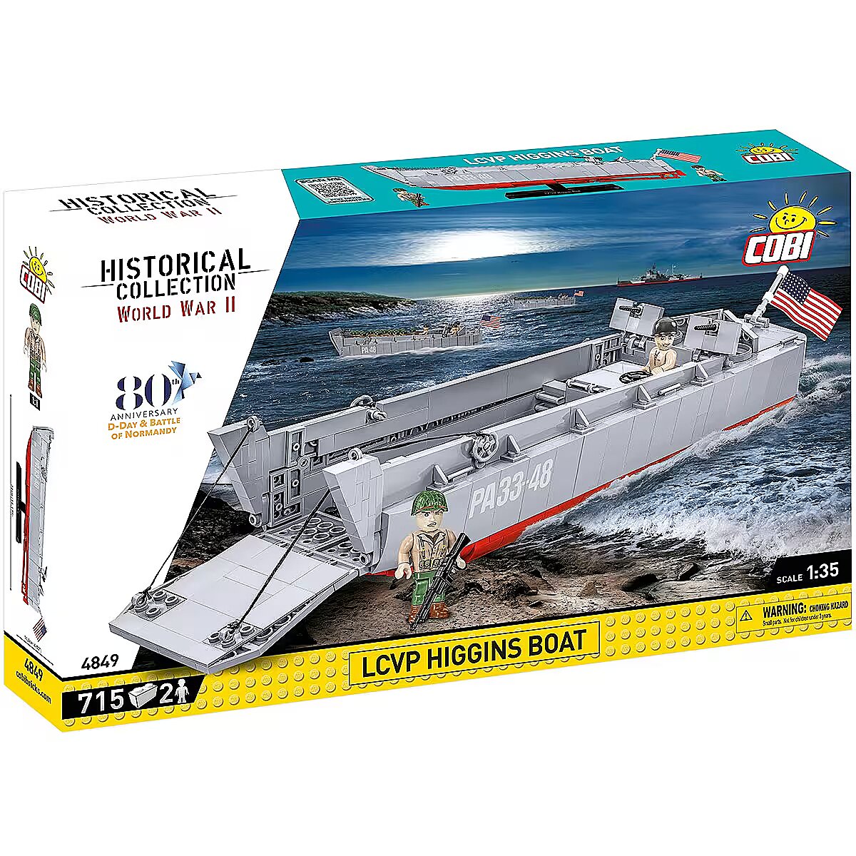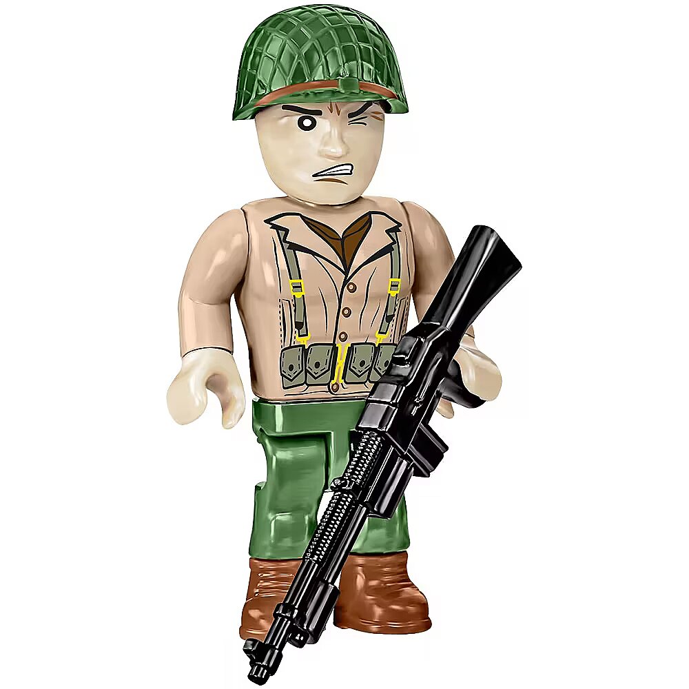 Description - Especially on the occasion of the upcoming 80th anniversary of D-Day we have created an official collector's set with a special logo of the anniversary that will take place in 2024. The set will keep alive the memory of this extremely important event, which had a huge impact on the course of World War II. The Higgins Boat model made of COBI construction blocks faithfully reflects its historical inspiration, maintaining the popular 1:35 scale. The block boat is a completely new structure, designed from scratch. The model is 36cm long. It has an opening ramp and a detailed full hull. The set includes movable elements such as two machine guns with covers and a mechanism for lowering and raising the front ramp based on a cable system. We didnt forget about such details as the rudder, turbines and the opening hatch with the outline of the engine underneath, either. The set uses permanent prints only. To display this beautiful model we designed a special brick display stand with a plate containing the name of the boat. The set also includes two figures depicting an American infantry soldier and a sailor from the boat crew. A large US flag printed on both sides flies on the Higgins Boat, as well. This is a special D-Day anniversary set intended for enthusiasts of history, military technology and block modeling! Build history, piece by piece, with COBI! Landing Craft, Vehicle, Personnel (LCVP) or the Higgins Boat was a type of landing craft used during World War II and later to transport and land supplies, small vehicles and soldiers. They were used on a massive scale during D-Day (June 6, 1944) and in Operations Torch in North Africa, Husky, Shingle and Avalanche in Italy, as well as in combat in the Pacific in the Battle of Guadalcanal, the Gilbert Islands, the Philippines, Iwo Jima and Okinawa. The Higgins Boat was designed by Andrew Higgins. Various manufacturers produced over 20,000 of these units. Most of the structure was built mainly of plywood, which made the boat very cheap and easy to build, extremely light, but at the same time it did not provide any protection against gunfire. Thanks to the flat bottom, a special lowered front ramp and the drive cover, it could reach any shore, even very shallow ones. The barge could carry a 36-person army platoon on board. In the case of transporting a small vehicle such as an off-road vehicle, it could also accommodate about 12 soldiers or 3.6 tons of cargo. The landing craft reached speeds of up to 12 knots (14 mph, 22 km/h). The boat was also armed with two machine guns operated by two gunners. 715 high-quality elements Produced in the EU by a company with over 20 years of tradition The blocks meet the safety standards of products for children Fully compatible with other brands of construction blocks Blocks with prints do not scratch or smear and do not fade during play or under the influence of temperature Clear and intuitive instructions based on illustrations and step-by-step directions Special set in connection with the 80th anniversary of D-Day (June 6, 1944) 2 figures of American soldiers Display stand Name plate