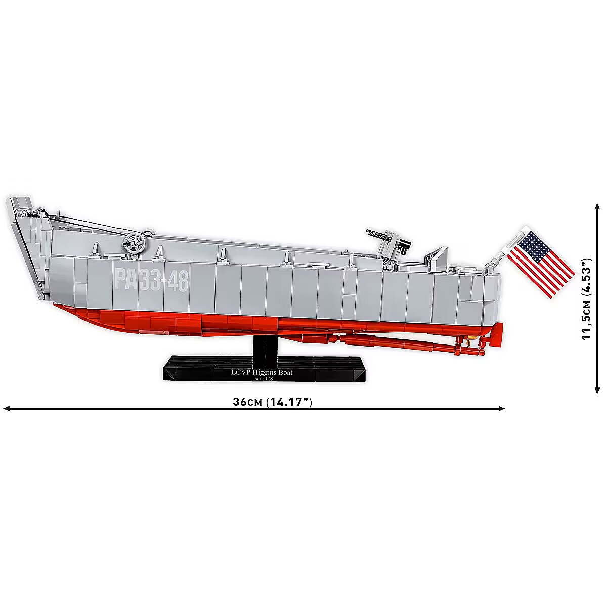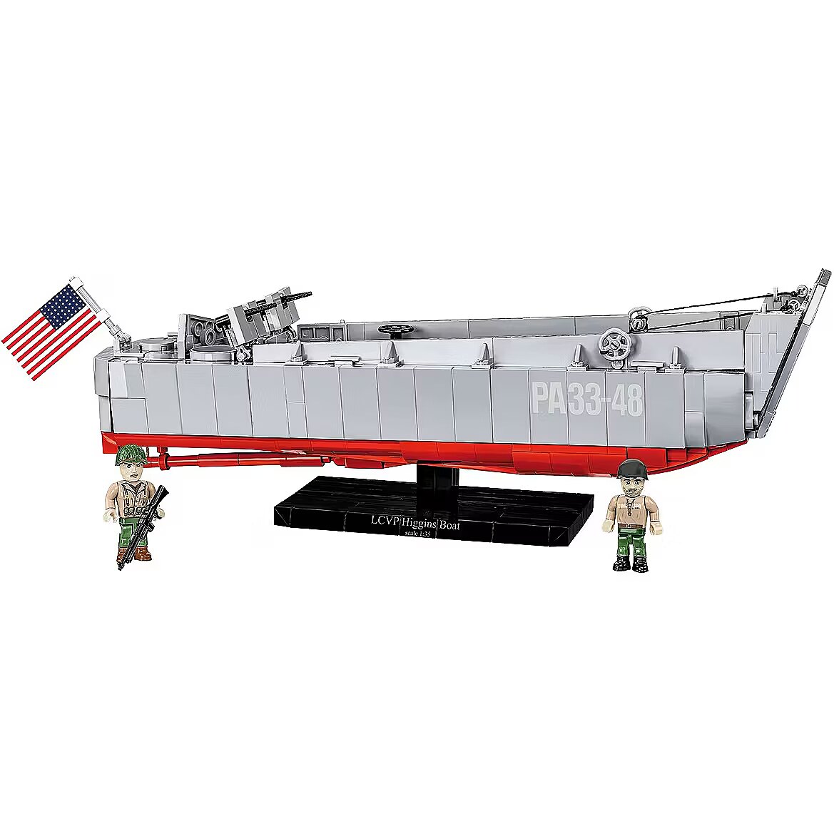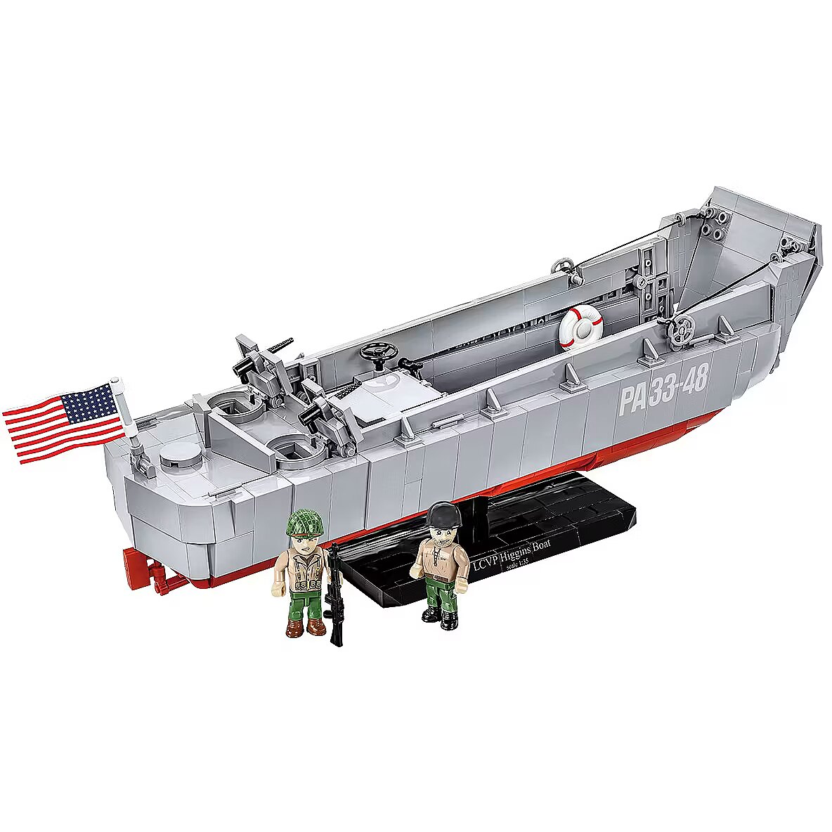 Description - Especially on the occasion of the upcoming 80th anniversary of D-Day we have created an official collector's set with a special logo of the anniversary that will take place in 2024. The set will keep alive the memory of this extremely important event, which had a huge impact on the course of World War II. The Higgins Boat model made of COBI construction blocks faithfully reflects its historical inspiration, maintaining the popular 1:35 scale. The block boat is a completely new structure, designed from scratch. The model is 36cm long. It has an opening ramp and a detailed full hull. The set includes movable elements such as two machine guns with covers and a mechanism for lowering and raising the front ramp based on a cable system. We didnt forget about such details as the rudder, turbines and the opening hatch with the outline of the engine underneath, either. The set uses permanent prints only. To display this beautiful model we designed a special brick display stand with a plate containing the name of the boat. The set also includes two figures depicting an American infantry soldier and a sailor from the boat crew. A large US flag printed on both sides flies on the Higgins Boat, as well. This is a special D-Day anniversary set intended for enthusiasts of history, military technology and block modeling! Build history, piece by piece, with COBI! Landing Craft, Vehicle, Personnel (LCVP) or the Higgins Boat was a type of landing craft used during World War II and later to transport and land supplies, small vehicles and soldiers. They were used on a massive scale during D-Day (June 6, 1944) and in Operations Torch in North Africa, Husky, Shingle and Avalanche in Italy, as well as in combat in the Pacific in the Battle of Guadalcanal, the Gilbert Islands, the Philippines, Iwo Jima and Okinawa. The Higgins Boat was designed by Andrew Higgins. Various manufacturers produced over 20,000 of these units. Most of the structure was built mainly of plywood, which made the boat very cheap and easy to build, extremely light, but at the same time it did not provide any protection against gunfire. Thanks to the flat bottom, a special lowered front ramp and the drive cover, it could reach any shore, even very shallow ones. The barge could carry a 36-person army platoon on board. In the case of transporting a small vehicle such as an off-road vehicle, it could also accommodate about 12 soldiers or 3.6 tons of cargo. The landing craft reached speeds of up to 12 knots (14 mph, 22 km/h). The boat was also armed with two machine guns operated by two gunners. 715 high-quality elements Produced in the EU by a company with over 20 years of tradition The blocks meet the safety standards of products for children Fully compatible with other brands of construction blocks Blocks with prints do not scratch or smear and do not fade during play or under the influence of temperature Clear and intuitive instructions based on illustrations and step-by-step directions Special set in connection with the 80th anniversary of D-Day (June 6, 1944) 2 figures of American soldiers Display stand Name plate