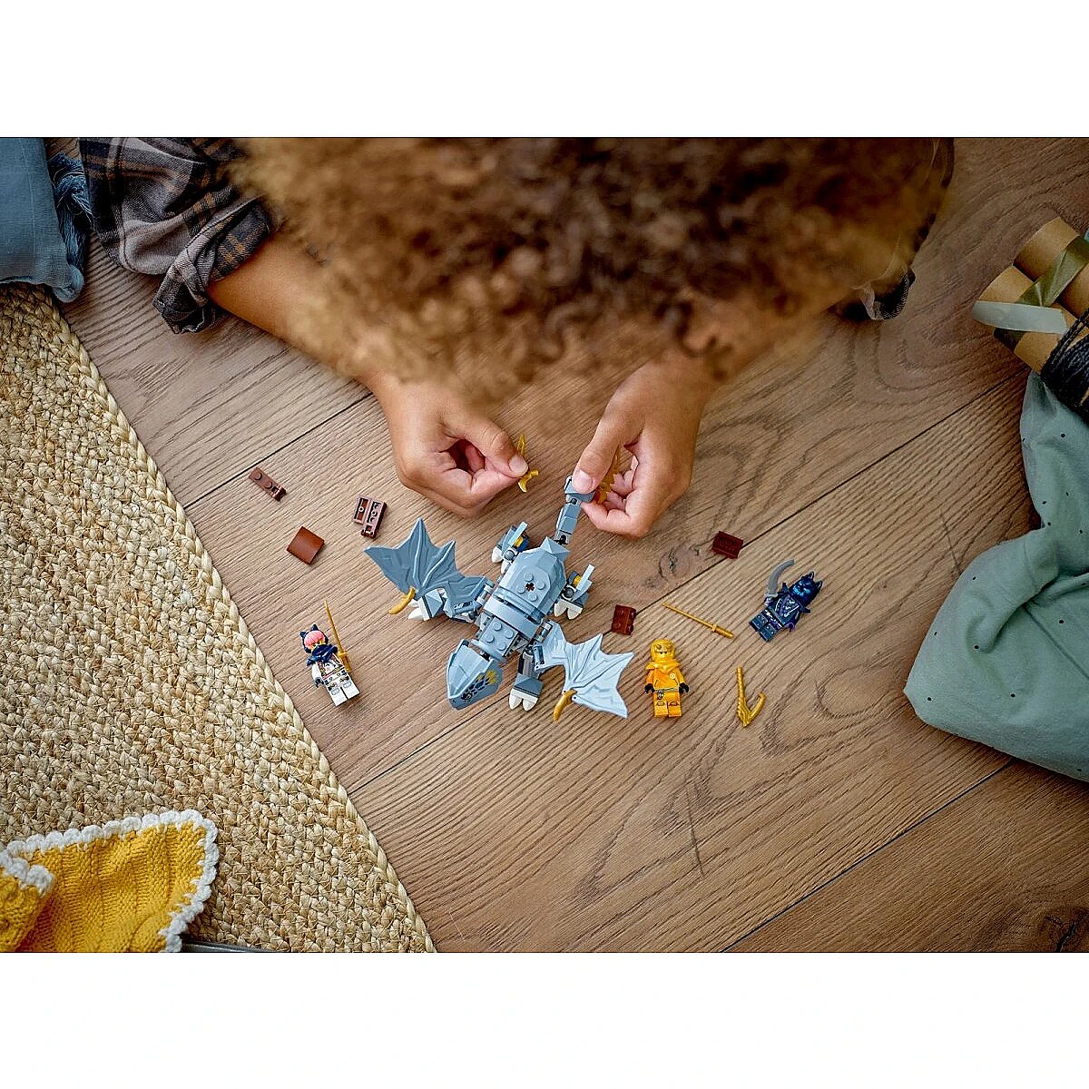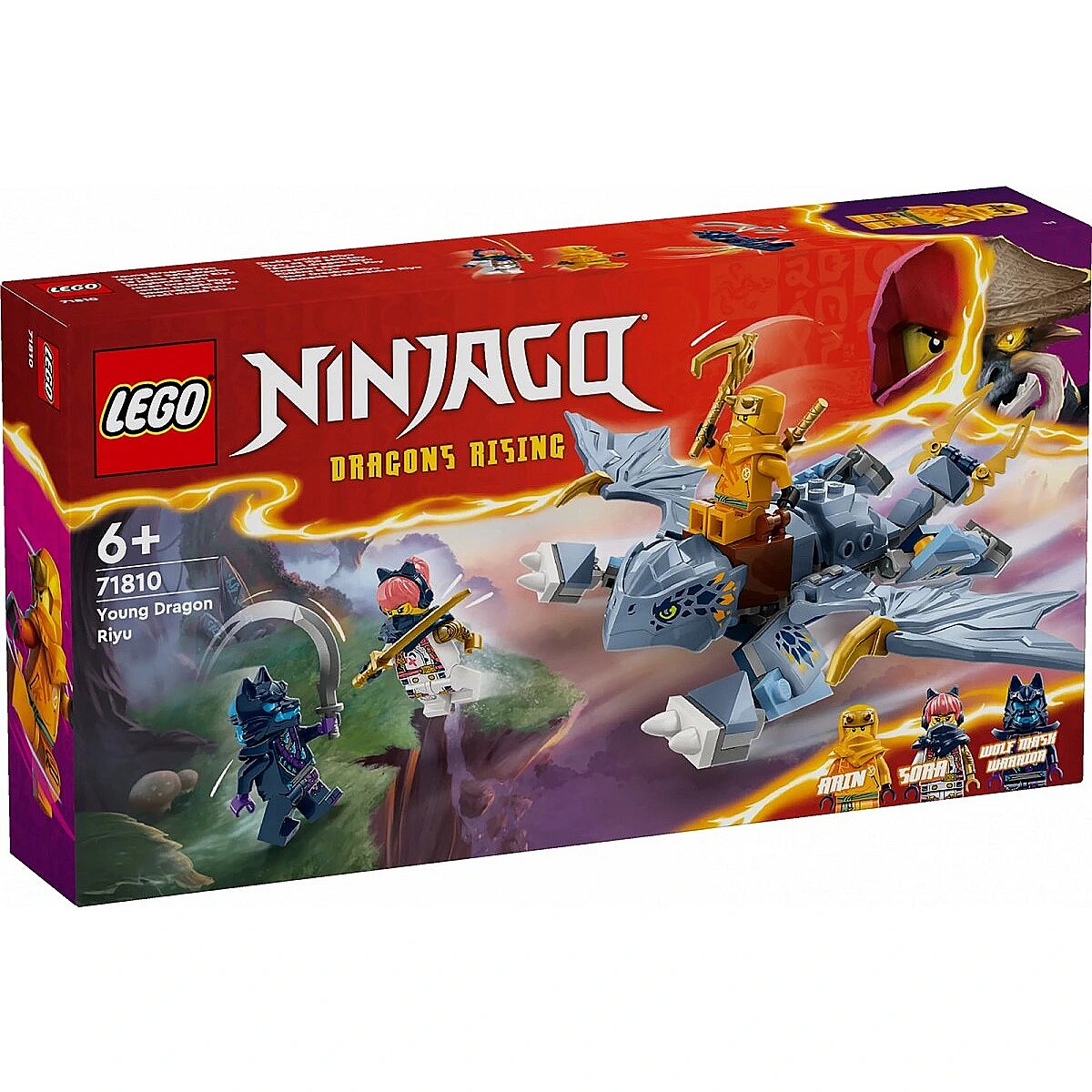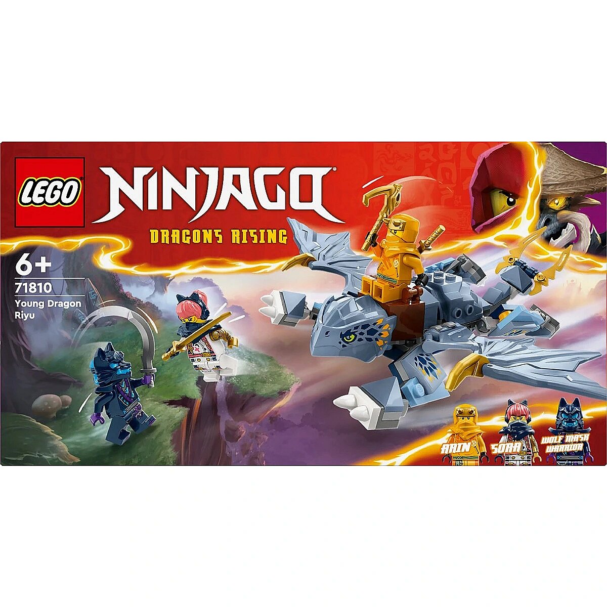 Description - Boys and girls aged 6+ can recreate aerial adventures from season 2 of the NINJAGO Dragons Rising TV show with this Young Dragon Riyu (71810) playset. This kids dragon toy features a Young Riyu model with posable wings and legs, a posable tail, and a saddle so that minifigures can ride on his back. This ninja toy comes with 3 minifigures: Arin armed with a climbing hook and katana sword accessory, Sora with a katana sword accessory, and a villainous Wolf Mask Warrior with a sword accessory. Kids have all they need to role-play being a ninja warrior and play out action-packed battles. The LEGO NINJAGO range of buildable ninja toys for kids includes mechs, vehicles and temples for exciting role-play adventures. Each battle set can be created with the LEGO Builder app, which guides you and your child on an easy and intuitive building adventure   All-action dragon toy for kids Boys and girls aged 6 years old and up can play out scenes from season 2 of the NINJAGO Dragons Rising TV show with the Young Dragon Riyu playset Posable dragon model Kids can position the wings, tail and legs of this dragon toy before placing one of the NINJAGO character minifigures in its saddle and soaring into the sky 3 minifigures Ninja playset includes Arin armed with a climbing hook and katana sword accessory, Sora with a katana sword accessory and a Wolf Mask Warrior with a sword accessory Ninja gift This ninja toy provides a fun build-and-play experience and can be given as an unexpected treat to boys and girls who love pretending to be their ninja heroes A helping hand Discover intuitive instructions in the LEGO Builder app where builders can zoom in and rotate models in 3D, track their progress and save sets as they develop new skills Bigger ninja adventures Look out for more NINJAGO action toys (sold separately) featuring dragons, mechs and vehicles A universe of ninja toys LEGO NINJAGO building toys for kids include mechs, vehicles and temples, and let kids escape into a fantasy world of adventure with their ninja heroes Measurements This 132-piece NINJAGO toy set includes a dragon model measuring over 2.5 in. (6 cm) high, 7.5 in. (19 cm) long and 7 in. (18 cm) wide
