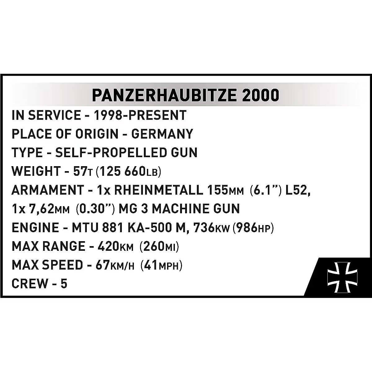 Description - Panzerhaubitze 2000 The Panzerhaubitze 2000 is one of the most advanced artillery systems in the world. Thanks to its cutting-edge technology, range, and precision, the PzH 2000 plays a key role in modern combat operations, providing effective fire support. It is a symbol of modern artillery and a testament to the advanced engineering of the German defense industry. We proudly present this legendary self-propelled howitzer, developed in cooperation with the Deutsches Panzermuseum in Munster. Built from over a thousand pieces, this model captures all the essential features of the original. It includes a working tracked chassis, a rotating turret, and a movable barrel of the powerful 155 mm howitzerjust a few of its many highlights. The set also features detailed camouflage and all structural markings faithfully recreated using printed elements, including registration numbers and ventilation grilles. The brick-built PzH 2000 comes with opening hatches and a movable support frame for stabilizing the massive gun barrel. Mounted on the turret is the onboard MG3 machine gun. The Panzerhaubitze 2000 is a must-have for any Armed Forces collector or enthusiast of modern armored and military technology. Development of the PzH 2000 began in the 1980s as part of the Bundeswehrs artillery modernization program. The aim was to create a modern self-propelled howitzer to replace older models like the M109. Prototypes were tested in the early 1990s, and promising results led to the decision to begin serial production. The PzH 2000 entered service with the Bundeswehr in 1998 and has since been adopted by several other countries including the Netherlands, Italy, Greece, Lithuania, and Croatia. The PzH 2000 is known for its high rate of fire, long range, and advanced fire control system, making it a highly effective battlefield support tool. Its ability to fire rapid salvos and use precision targeting systems allows it to strike targets swiftly and accurately. The PzH 2000 has been deployed in various international missions, including NATO operations in Afghanistan, where its advanced artillery capabilities proved invaluable in demanding combat conditions. These vehicles are currently also in active use in the conflict in Ukraine. 1006 high-quality elements Made in the EU by a company with over 35 years of tradition Meets safety standards for children's products Fully compatible with other brands of construction bricks Durable prints usedno stickers Clear and intuitive instruction manual based on drawings and icons 1:35 scale
