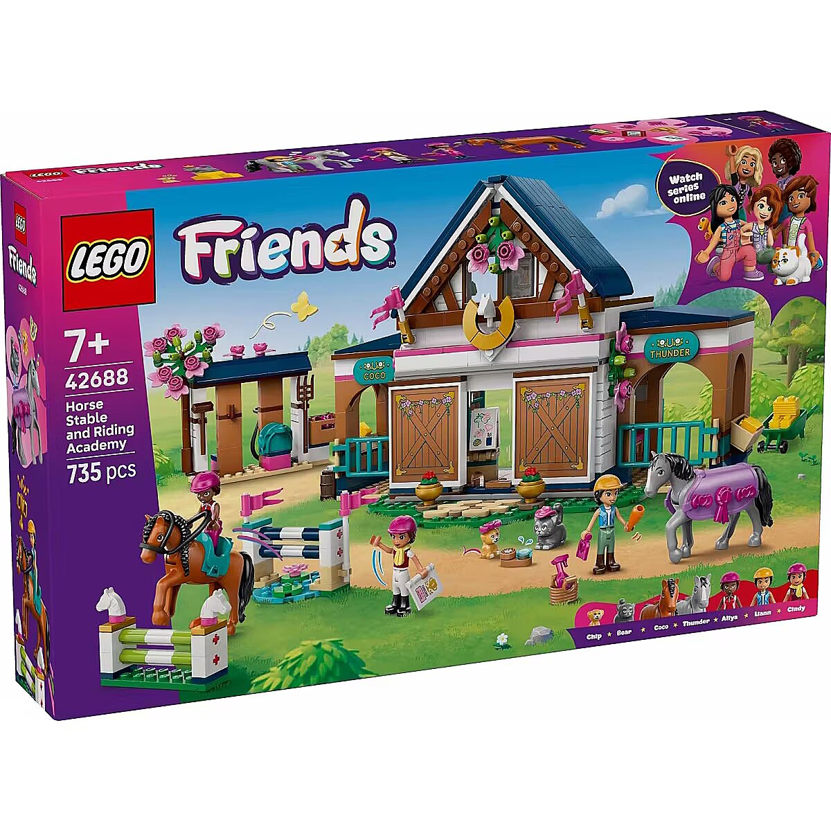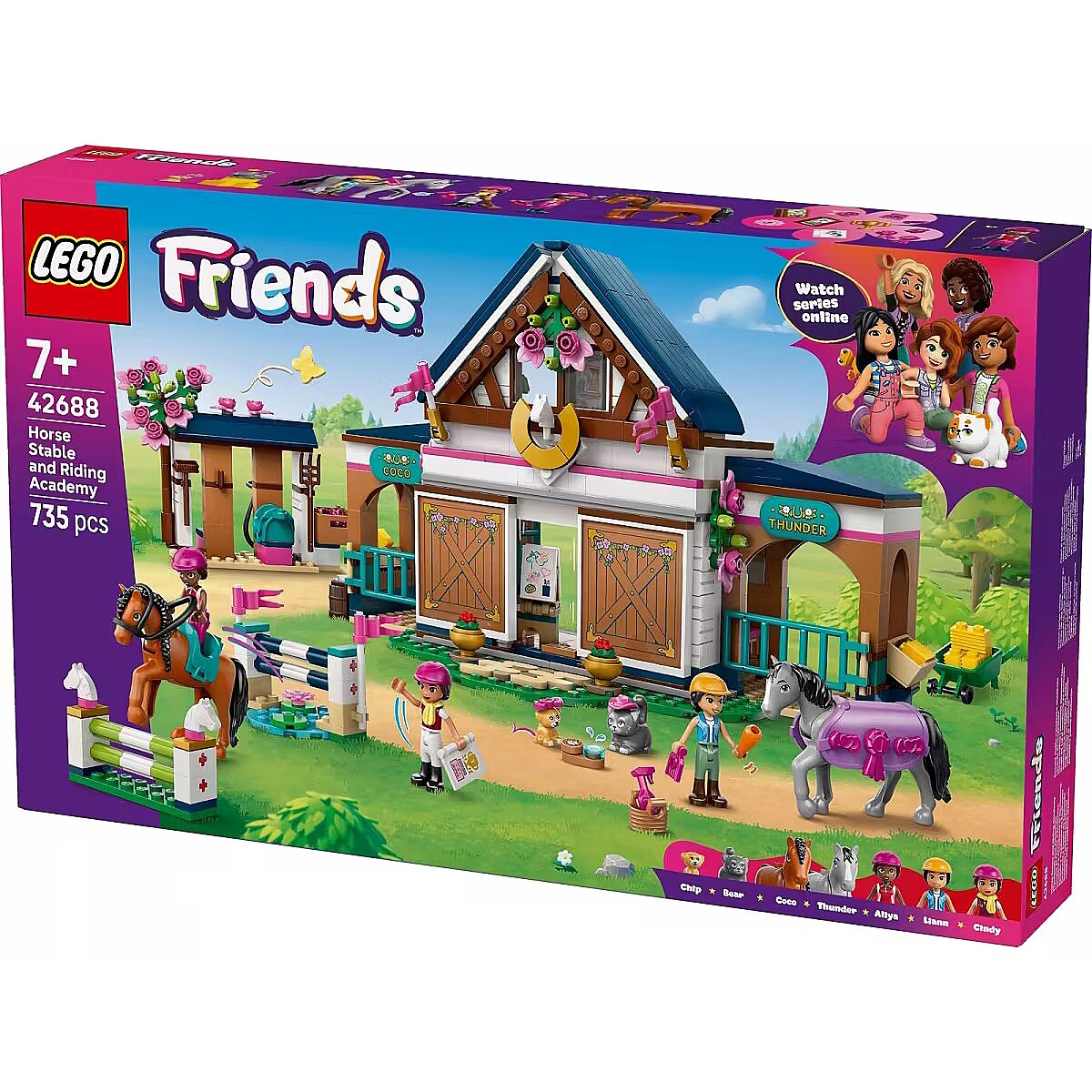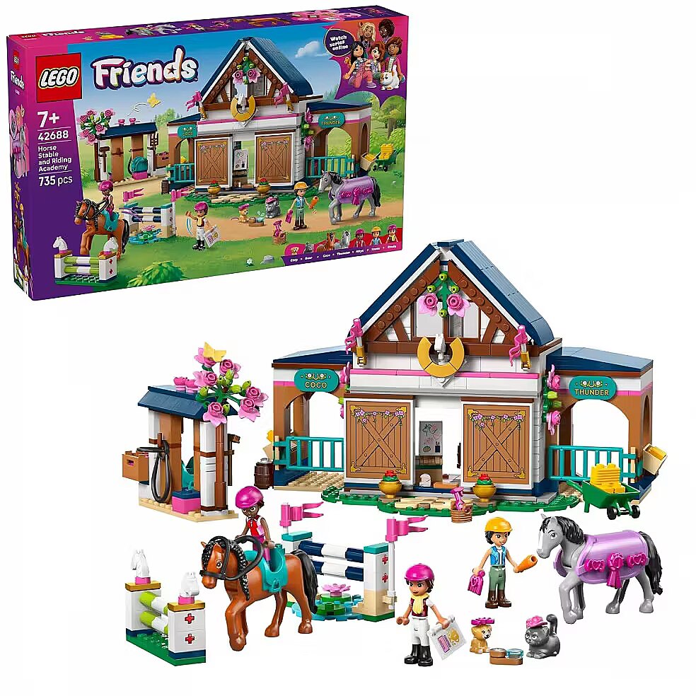 Description - Klocki Friends 42688 Stadnina i szkółka jeździecka Girls and boys aged seven and up will have lots of fun discovering the LEGO Friends Horse Stable and Riding School (42688). Act out every stage of horse care as you watch Liann and Aliya during lessons with instructor Cindy. Saddle up the two horses and jump over obstacles. Try your hand at different tasks, such as transporting hay in a wheelbarrow or grooming and feeding the horses. After a busy day, settle down to sleep in the cozy beds above the stable. This role-play toy comes with lots of accessories, so kids can set off on a new adventure every time they play. The set includes a horse blanket, obstacles, a wheelbarrow, hay crates, a carrot, a dry-erase board, trophies, books, beds, and many other elements. This set makes a great gift for girls and boys who love animal figures and horse-themed toys. The LEGO Builder app guides kids through an intuitive building experience. They can zoom in and rotate sets using 3D instructions, save their sets, and track their building progress. The set consists of 735 pieces.