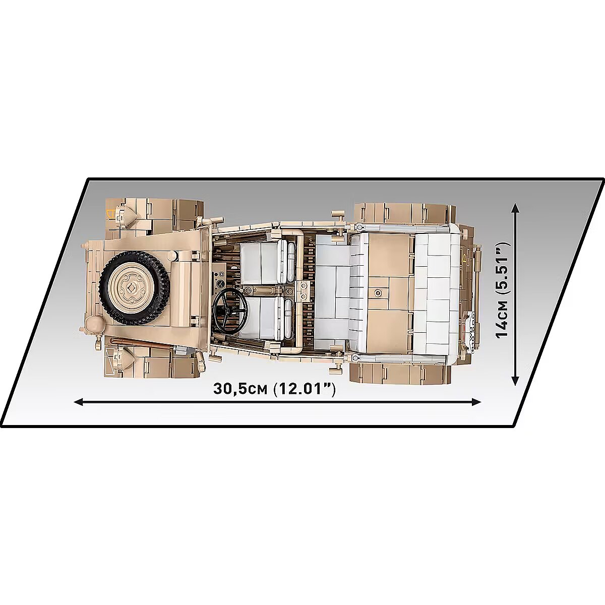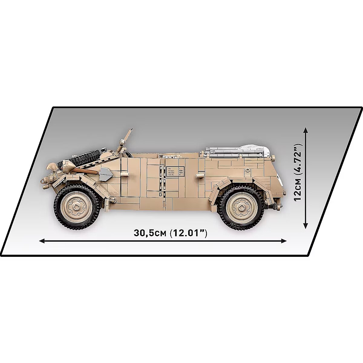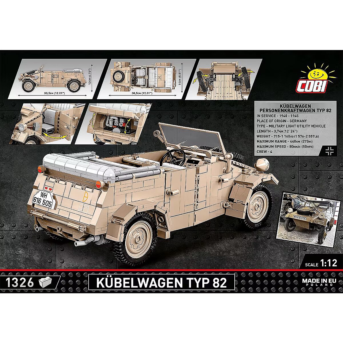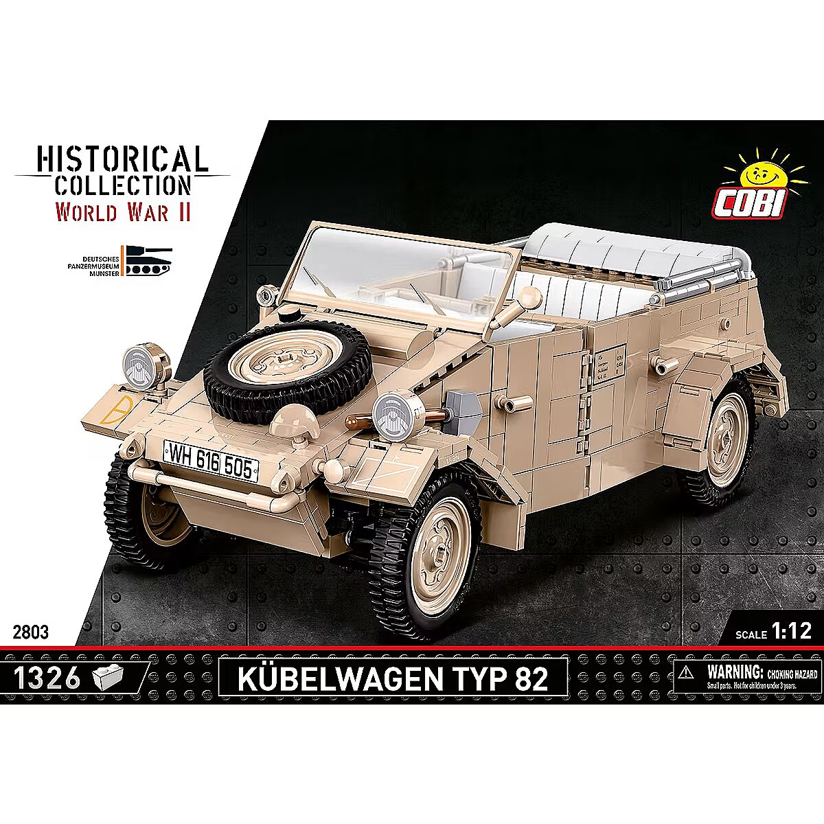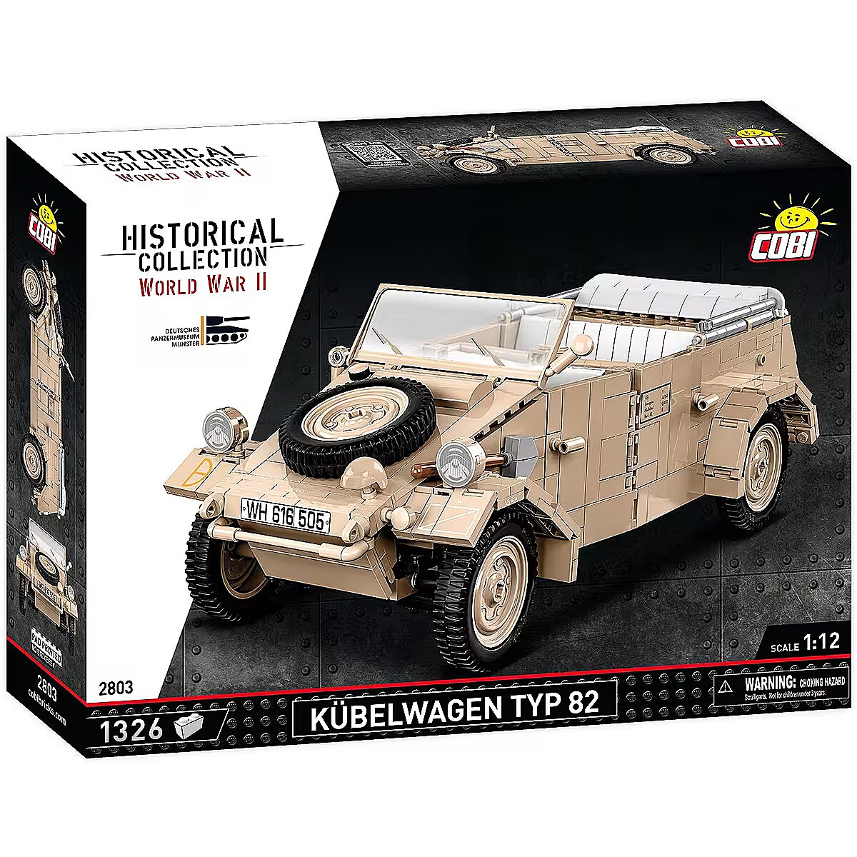 Description - Now you can become the owner of the iconic German off-road car Kübelwagen TYP 82 in a version made of COBI construction blocks! This is our first WWII large scale 1:12 vehicle. It was designed based on a museum piece located in the Deutsches Panzermuseum Munster (Germany). It's huge, VERY detailed, and looks downright impressive when paired with the upcoming even bigger legendary Tiger 131 from The Tank Museum! With 1,326 pieces and generous dimensions, this set (#2803) is in a class of its own. When completed the Kübelwagen is 30.5cm long. Attention is drawn to the carefully reproduced interior, excellent external design and completely new elements designed specifically for the needs of such a large set. The interior of the car is detailed in every way, including the steering wheel, seats, knobs, switches and engine compartment containing additional tools! The exterior also raises the bar in terms of the accuracy of proportions and detail that only a set of this size can deliver. This includes an exclusive window, opening doors, access to the trunk and engine compartment, equipment elements and turning wheels that can be moved with the steering wheel. Our 1:28 scale models are considered very detailed. However, it is the 1:12 scale and 1530 elements that allow us to show the true capabilities of the COBI construction block system. The Kübelwagen represents a new level of design, photorealism, impressive size and precision. In this case, the number of blocks definitely matters! The Kübelwagen TYP 82 set was developed in cooperation with the Deutsches Panzermuseum Munster (Germany). We hope that both collectors and fans of COBI will have as much fun building and displaying this car as we had designing and creating it. For all those who love militaria, military technology and history, this is an opportunity to bring home a BIG piece of the story. Build history, piece by piece, with COBI! The Kübelwagen Type 82 was a German military off-road vehicle produced during World War II. It was created as a response to the Wehrmacht's need for an easy-to-maintain, economical and reliable vehicle for use on a variety of terrain. In the period 1940-1945, more than 50,000 of these vehicles were produced. It was mainly employed as an all-terrain, transport, sanitary and reconnaissance vehicle and as a platform for mounting light weapons. After World War II, some of the surviving Kübelwagens continued to be used by various countries as well as being used as civilian vehicles. Thanks to its functionality, lightness and reliability, the Kübelwagen has become a classic symbol of an off-road vehicle and is still valued by motoring enthusiasts around the world. 1326 high-quality elements Manufactured in the EU by a company with over 20 years of tradition The blocks meet the safety standards of products for children Fully compatible with other brands of construction blocks Blocks with prints do not scratch or smear and do not fade during play or under the influence of temperature Clear and intuitive instructions based on illustrations and step-by-step directions 100% prints, no stickers Dedicated elements Realistic appearance Many hours of building Access to the interior Working steering wheel and swivel wheels Model developed in cooperation with the Deutsches Panzermuseum Münster Large scale 1:12