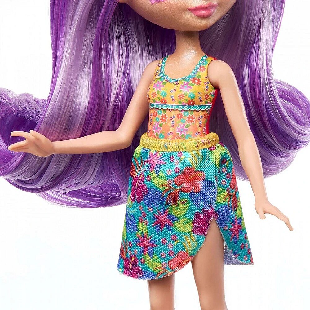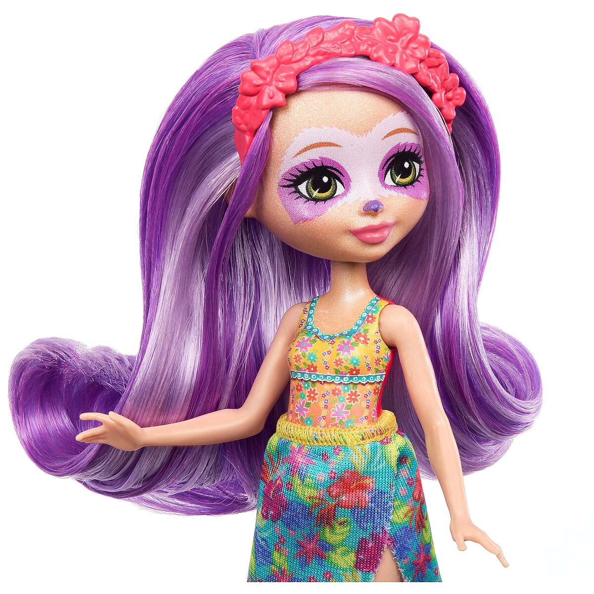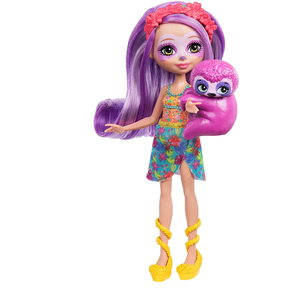 LongDesc - The Enchantimals doll collection celebrates a group of lovable friends who share a special bond with their animal best friends. Sabindra Sloth doll and her attachable animal friend, Tang, are ready for a day of fun in the sun at Sunshine Beach! Sabindra has super colourful hair, a beachy top, and removable skirt. Bestie Tang is always by her side! Kids will love playing out the special Enchantimals bond these best friends share and will want to collect them all!