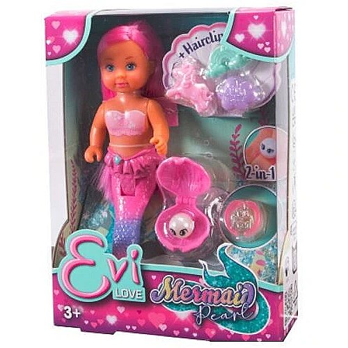 Description - DOLL FOR COLLECTING AND DRESSING UP: Evi LOVE doll is Steffi LOVE's sweet little sister, she has amazing long hair, countless hobbies, loves animals and is perfectly dressed for every occasion. EVI AS A PEARL MERMAID: the doll as a mermaid has amazing long, pink hair, which can be styled with the attached cloud, rainbow and unicorn-shaped hairpins. MAGIC PEARL Evi has discovered a shiny pearl in a shell, which can be inserted into the included ring and thus serves as wonderful jewelry for children SUPPORTS THE DEVELOPMENT OF A CHILD'S PASSION: Evi sets help shape the imagination and develop a sense of responsibility and care in toddlers, play gives the opportunity to discover hobbies and pursue passions. SIZE AND PURPOSE: the Evi doll is 12 cm; available in 2 color versions: cream and burgundy, random shipping, toy for children from 3 years. The underwater world is full of mysterious creatures, especially beautiful creature is Evi LOVE Pearl Mermaid. Mystical mermaid with pink hair and purple fish tail will charm every curious baby. Evi LOVE sets allow children to develop imagination and create their own stories. Children can take on the role of a queen, princess or other fairy tale character, recalling magical moments in their room. Evi Love sets support emotional development of children. Evi Love are 12-centimeter dolls in many thematic versions, thanks to which playing with them provides new experiences every time. In the world of Evi Love reign love, kindness, mutual respect and joy of creating adventures. Ideas for joint fun with your child can be found at www.swiatevi.pl.
