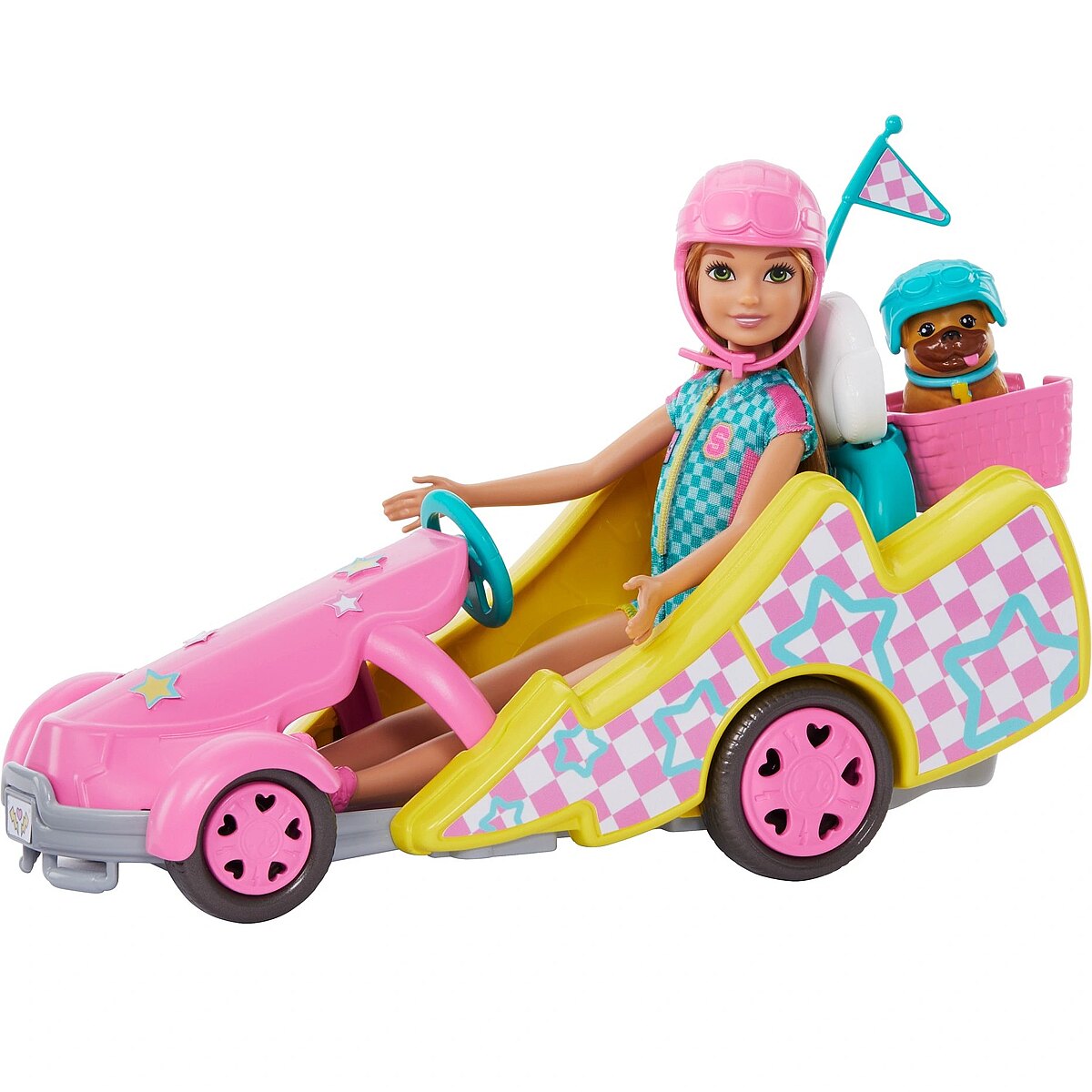 LongSummaryDescription - Barbie Stacie Racer Doll with Go-Kart Toy Car, Dog, Accessories, & Sticker Sheet. Doll type: Fashion doll, Doll's gender: Female, Recommended age (min): 3 yr(s), Suggested gender: Boy/Girl. Height: 138.9 mm, Weight: 340 g. Material: Fabric, Plastic, Product colour: Multicolour