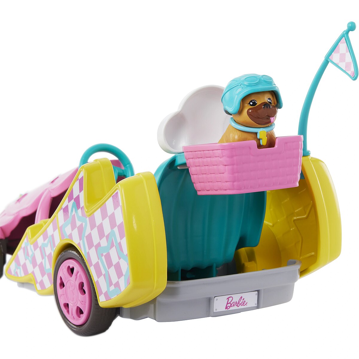 LongDesc - Smoke the tracks with Stacie doll and her Go-Kart! With rolling wheels, checkered deco, a removable flag, and attachable puppy basket this vehicle looks like it zoomed right out of the animated movie, Barbie and Stacie to the Rescue. There's also a sticker sheet so kids can customize their go-kart. Stacie doll wears her racing outfit and is ready to hit the pedal to the metal. Don't forget her helmet (there's one for her pup passenger, too)! Doll cannot stand alone. Colours and decorations may vary.