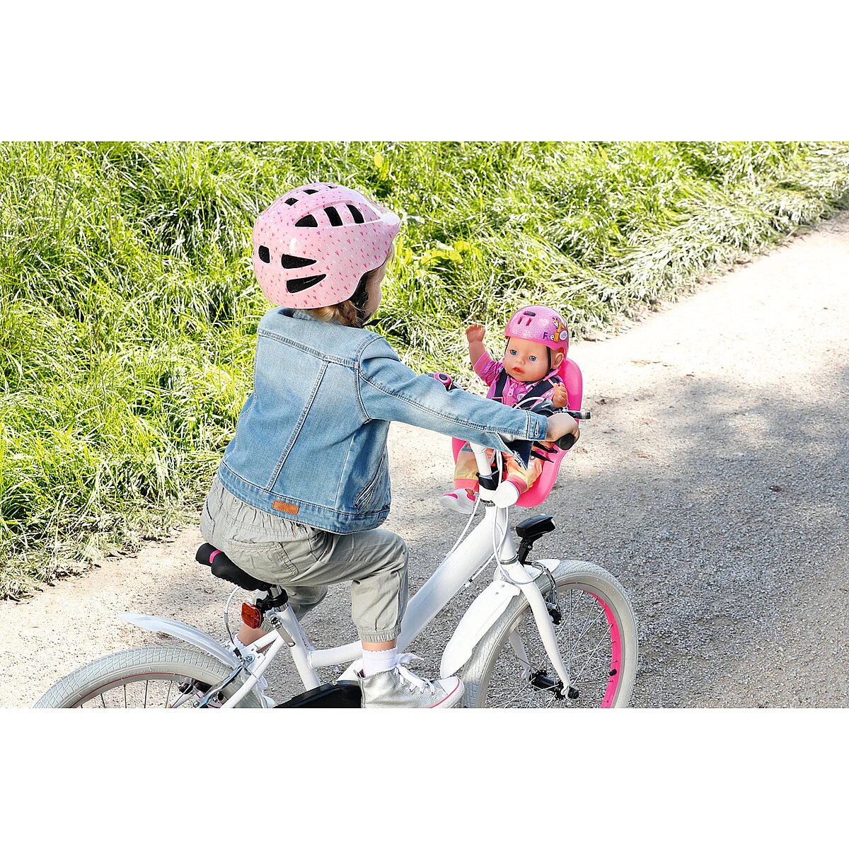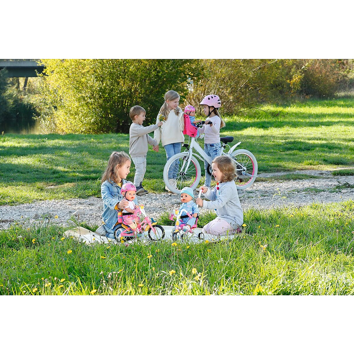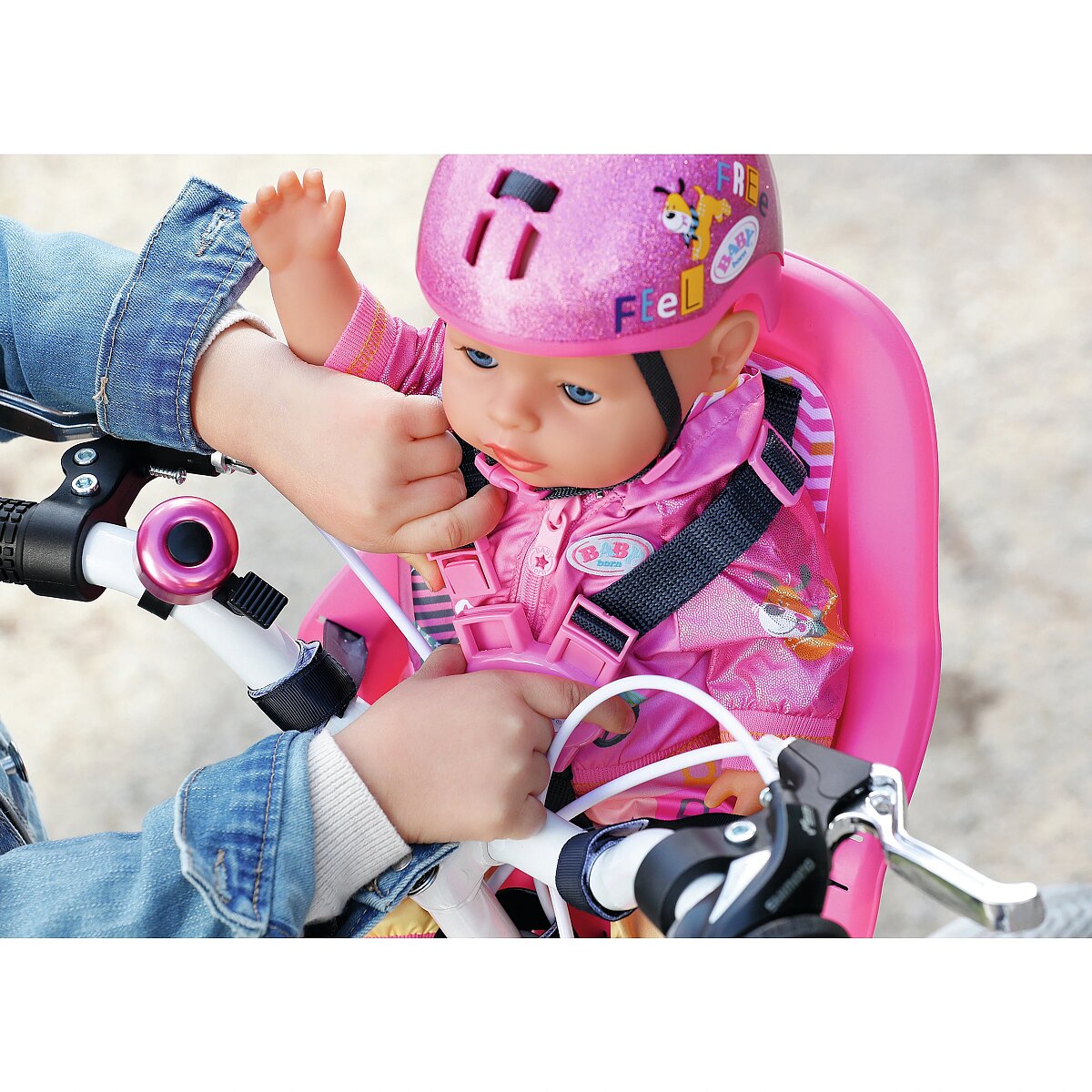 LongDesc - BABY born can now also go on a bike ride. Simply attach the seat to the bike using the harness system, put BABY born in, buckle up and off you go! But BABY born is not the only one who can enjoy bike rides: BABY born Bear, Sister and Little can also go for a ride.