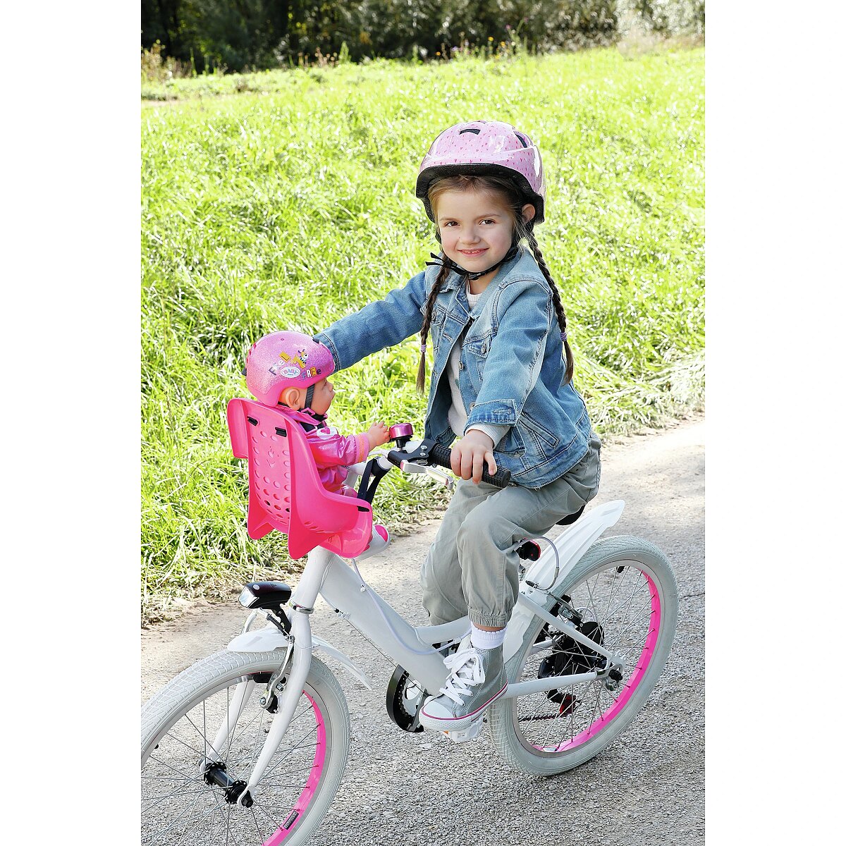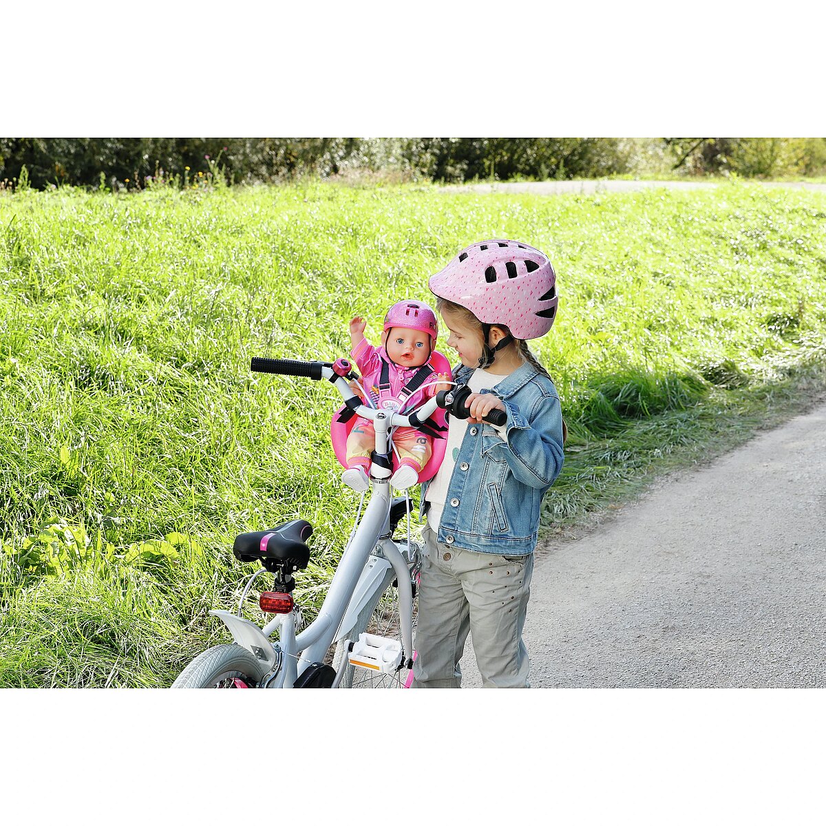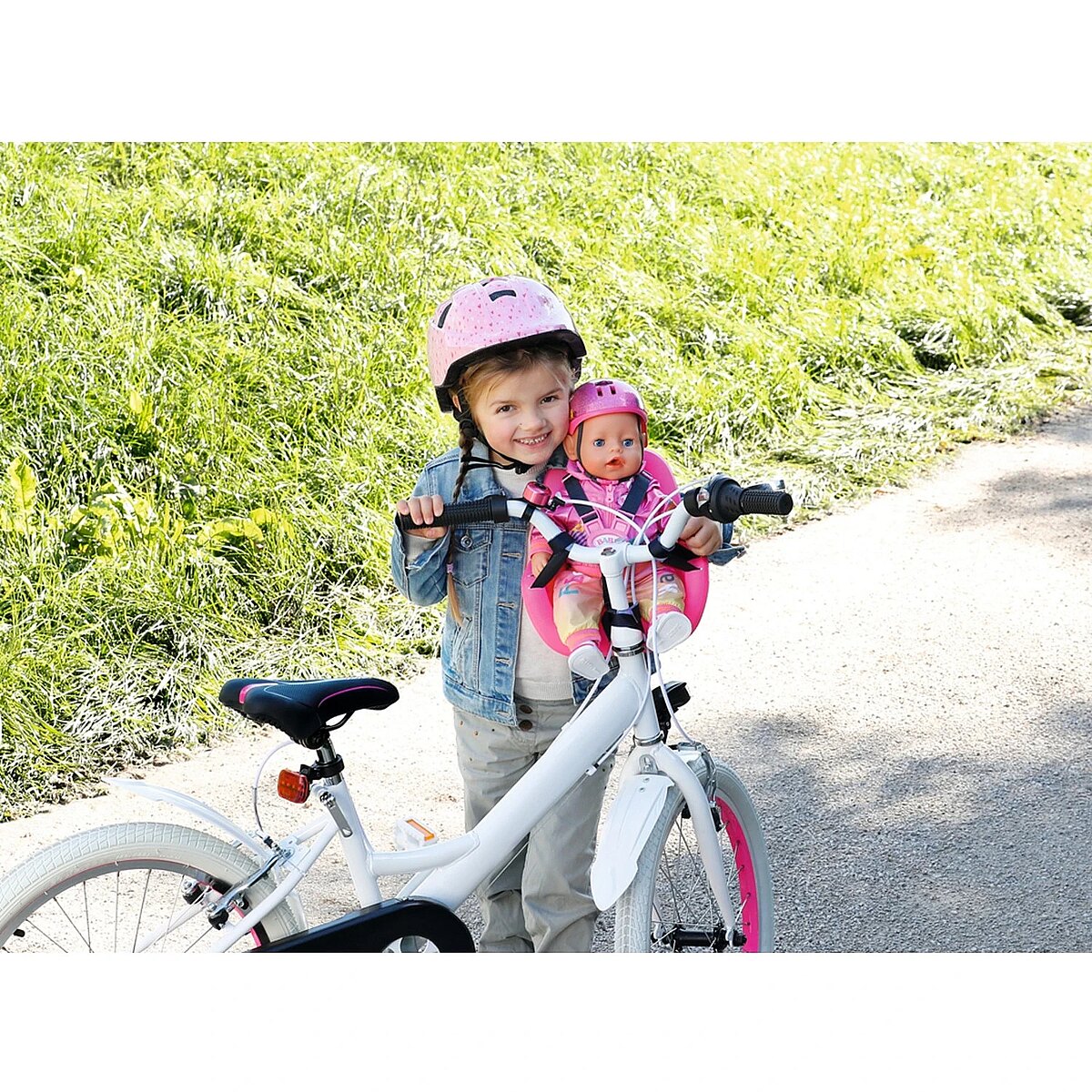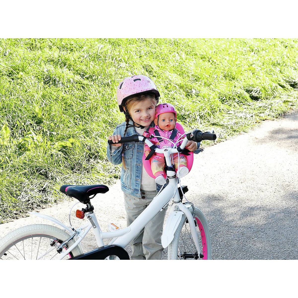 LongDesc - BABY born can now also go on a bike ride. Simply attach the seat to the bike using the harness system, put BABY born in, buckle up and off you go! But BABY born is not the only one who can enjoy bike rides: BABY born Bear, Sister and Little can also go for a ride.
