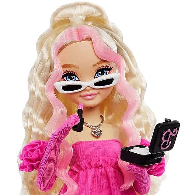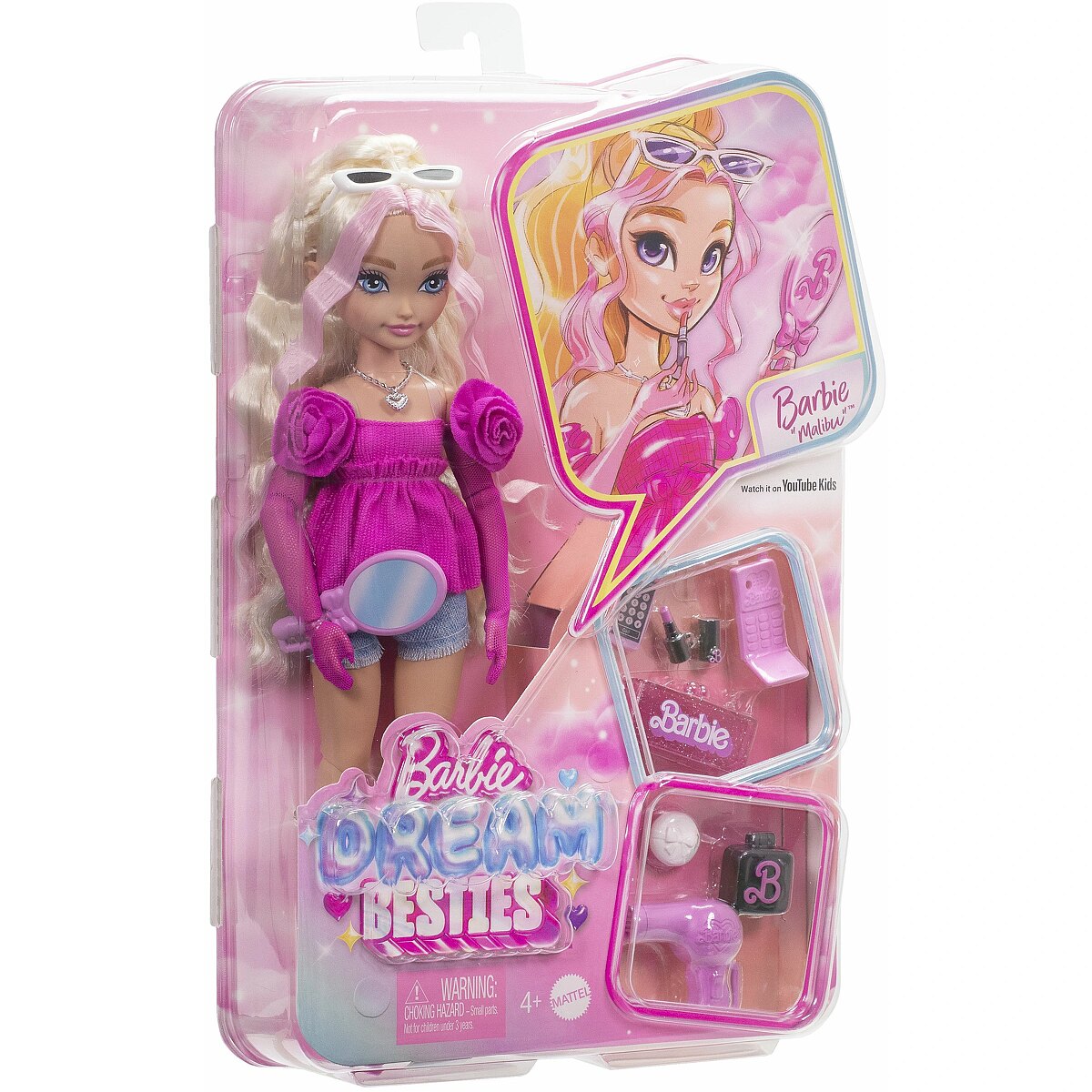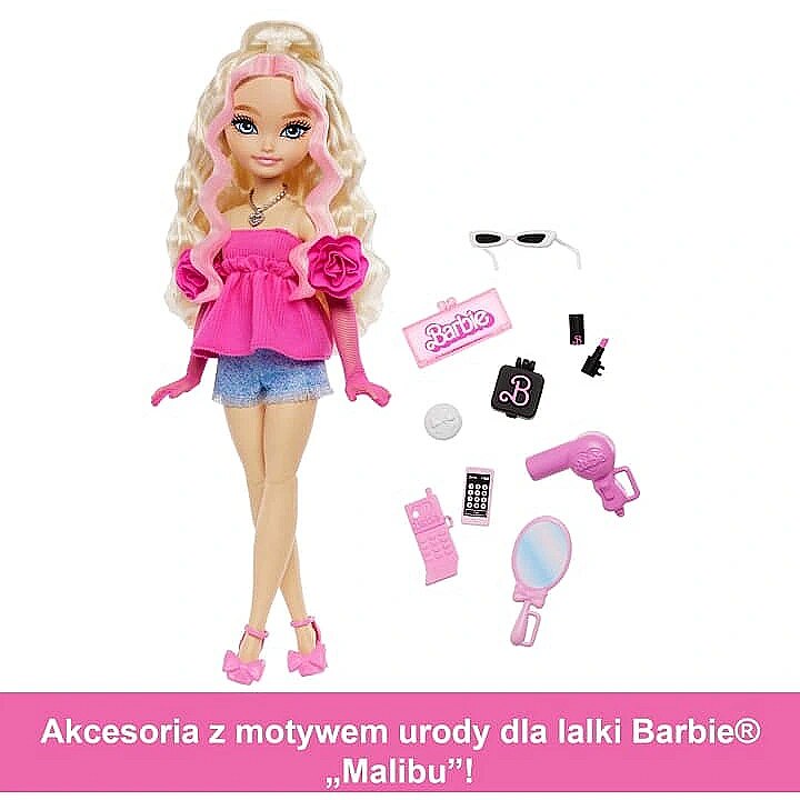 Packaging content - Packaging content - Includes 1 Barbie Dream Besties Barbie 'Malibu' doll wearing a pink top, pink gloves, and pink shoes, 1 clutch, 1 sunglasses, 1 lipstick, 1 blow dryer, 1 hand mirror, and 4 other accessories. Doll cannot stand alone. Colours and decorations may vary.