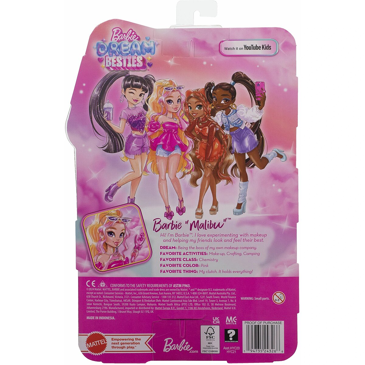 ShortSummaryDescription - Barbie Dream Besties “Malibu” Fashion Doll with 8 Makeup & Hair Themed Accessories, Fashion doll, Female, 4 yr(s), Boy/Girl, 298 mm, 170 g