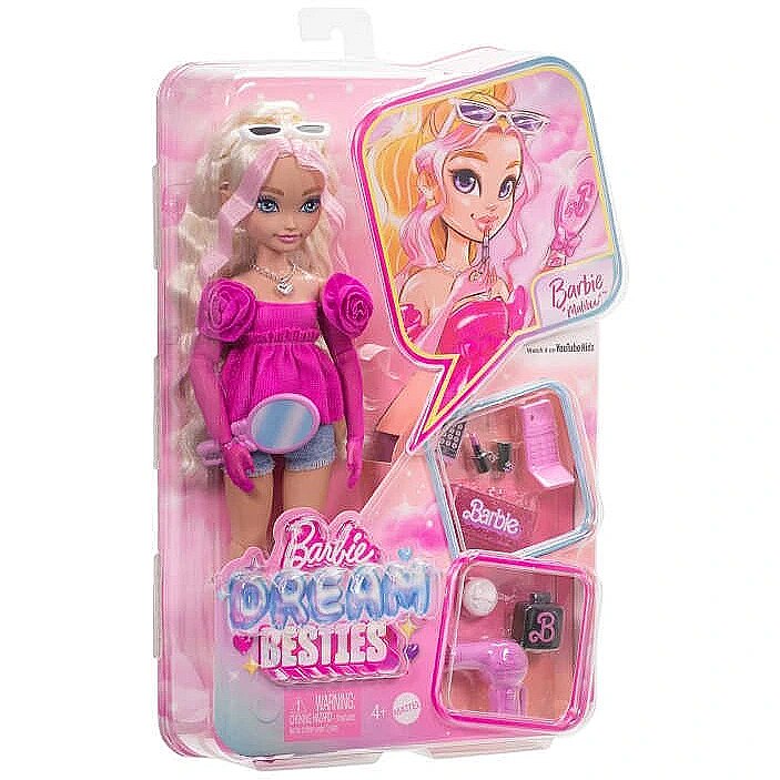 LongDesc - The Barbie Dream Besties dolls encourage kids to share their unique talents with the world, just like Barbie 'Malibu'! Barbie 'Malibu' has dreams of owning her own makeup company help her chase her dreams with 11 different beauty-themed accessories, including a hairdryer, mirror and lipstick! The fashion doll also has long blonde, wavy hair for styling fun. The Barbie Dream Besties dolls inspire kids ages 4 years old and up to live out their dreams. Doll cannot stand alone. Colours and decorations may vary.