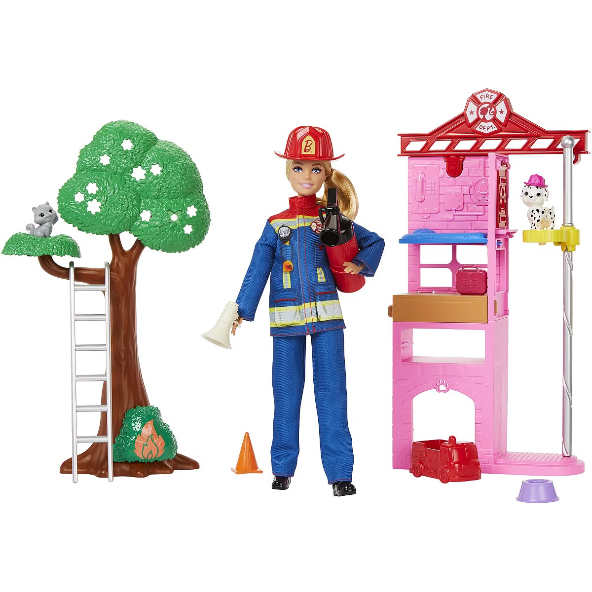LongDesc - Barbie firefighter doll lets kids bring their inner heroes out with a fire station playset and more than 10 pieces to help save the day. Play out the rescue of a kitten in a tree or fight a fire with interactive pieces like a colour-change fire piece, a tree with peg-holes and a fire extinguisher squirt toy -- cold water puts out the fire! Wearing her uniform and carrying a bullhorn, Barbie firefighter doll is ready to head out from the station with her pet Dalmatian by her side -- the puppy can ride down the firepole and take its small firetruck to the rescue for role-play fun. Kids 3 years old and up will love the endless possibilities for heroic expression and storytelling dreams! Doll cannot stand alone. Colours and decorations may vary.