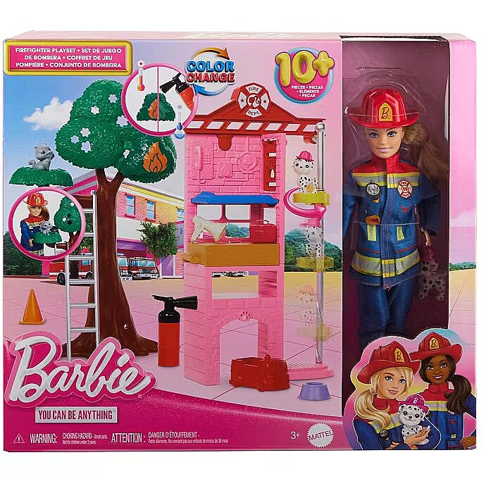 Packaging content - Packaging content - Incudes 1 Barbie doll wearing a 2-piece firefighter uniform, hat and shoes, plus fire station playset, 2 pet figures, 1 tree, 1 colour-change fire piece, 1 ladder and 8 additional accessories. Doll cannot stand alone. Colours and decorations may vary.