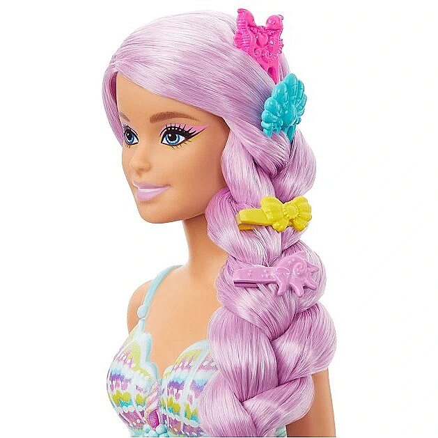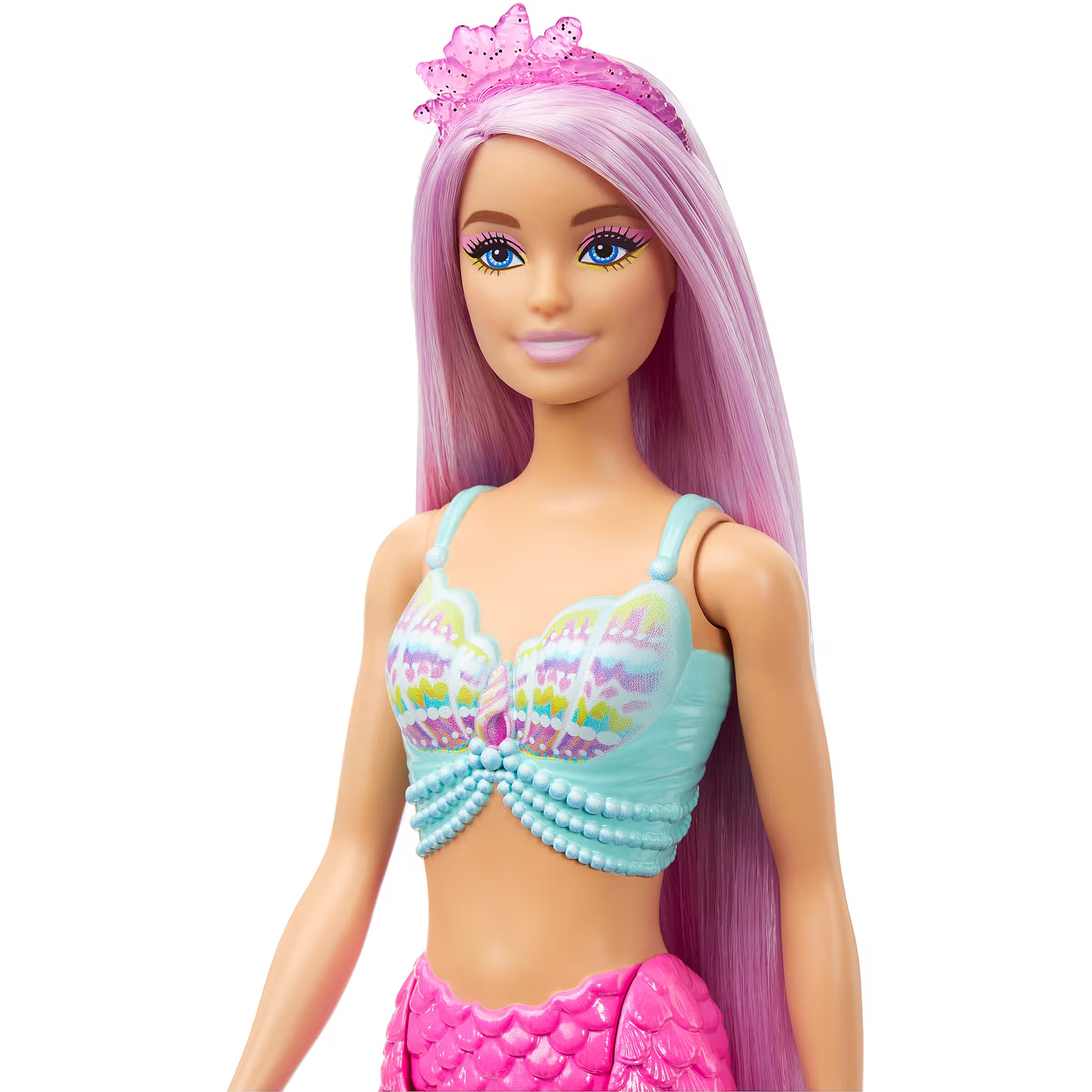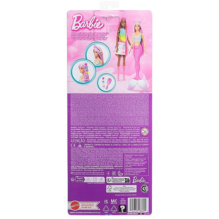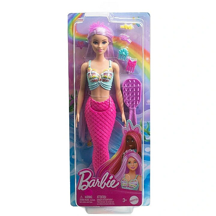 LongDesc - This fantastical mermaid Barbie doll rocks extra-long and colourful pink hair! Kids can style her hair with the included accessories, then brush out and repeat for endless play. Enchanting elements like an ocean-inspired headband and bodice lend this Barbie mermaid doll an extra dash of magic. She will inspire hours of dress-up play and imaginative fun for kids ages 3 years old and up! Doll cannot swim or stand alone. Colours and decorations may vary.