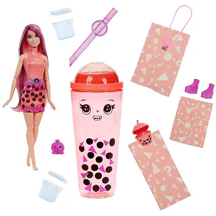 LongDesc - Barbie Pop Reveal Bubble Tea Series dolls offer a sensory unboxing experience with eight surprises! Unscrew the lid with the Slime and poke through the film with the straw for squishy fun. Peel the film on the cup to reveal a bubble tea-scented Barbie doll and eight more surprises! Which doll will you reveal? There's Taro Milk, Berry Bliss, Green Tea or Mango Mochi. Continue unboxing to discover two reusable ice cubes that pop open to reveal a skirt and pair of shoes. Mystery bags reveal a straw, a purse and a squishy, scented matching pet! Discover more wow with colour-change transformations on Barbie doll's face. Kids will want to collect them all! Each doll sold separately, subject to availability. Dolls cannot stand alone. Colours and decorations may vary.