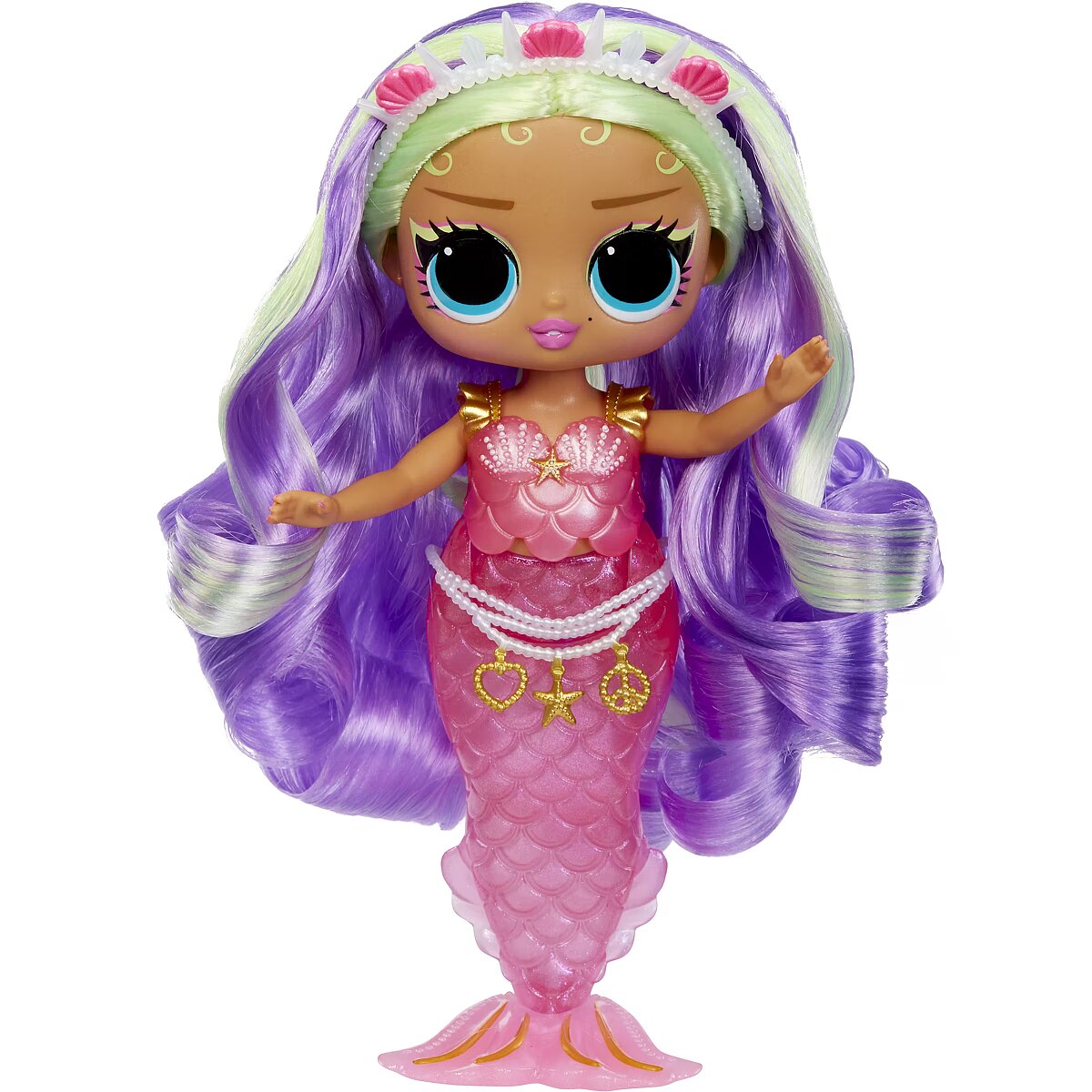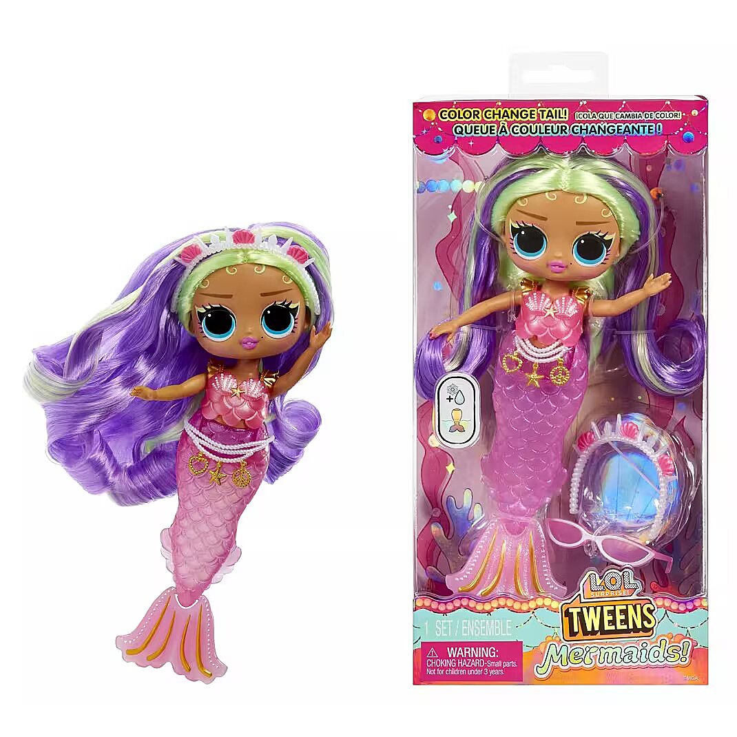 LongDesc - I'm in Be Tween, with underwater style and colorful surprises like you've never seen! Look out world, cuz we mermaids are going to make a splash!Get ready to dive into an enchanting world of magical mermaid fun with the all-new L.O.L. Surprise Tweens Mermaid Cleo Cove™ fashion doll with dazzling accessories to unbox! Perfect for bath time and imaginative play, Cleo Cove™ brings a splash of excitement with her beautiful color-changing tail and mesmerizing fin that can move back and forth! Dip your Tweens Mermaid doll into cold water and watch as her tail transforms colors from magenta to deep purple, creating a magical underwater experience! Can you guess what her light pink fin changes colors to? Don’t forget to style your doll with her charming accessories including her sea shades, sea shell tiara, and cute pearl belt! She has stunning features, gorgeous hair, her own fashionable mermaid look, and comes articulated for tons of posing opportunities, including sitting as she bends at her waist! She can even stand on her fin, making styling your doll even easier with greater stability! Discover what’s inside each box including a fabulous L.O.L. Surprise Tweens Mermaid doll, glasses, a headband, and a belt to complement the doll’s tail! Collect all 4 glamorous L.O.L. Surprise Tweens Mermaid fashion dolls: Cleo Cove™, Lola Waves™, Lana Marine™, and Serena Finn™ for a complete set of endless mermaid fun! L.O.L. Surprise fashion dolls with stylish hair, outfits and many detailed accessory pieces make a perfect toy for kids, including 4 years old and up for imaginative pretend play! As gifts for any special occasion, dolls provide hours of social play with siblings and friends! From MGA Entertainment, creators of L.O.L. Surprise fashion and collectible dolls, Rainbow High™ fashion dolls, Na Na Na Surprise dolls, Bratz® fashion dolls, MGA's Dream Ella™, MGA's Glitter Babyz™, Lalaloopsy™, Baby Born® Surprise baby dolls and collectibles, Little Tikes® kids toys and many other favorite brands.