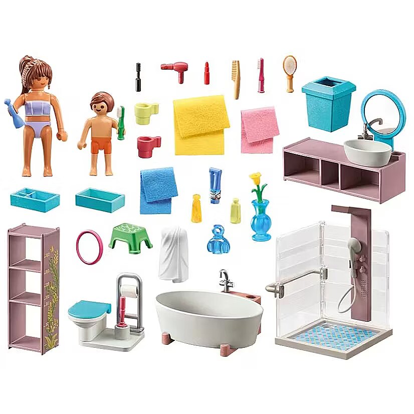 Description -  Fun in the bathing oasis: PLAYMOBIL bathroom made from sustainable materials, featuring two PLAYMOBIL figures, shower, bathtub, and plenty of accessories for detailed role-playing.