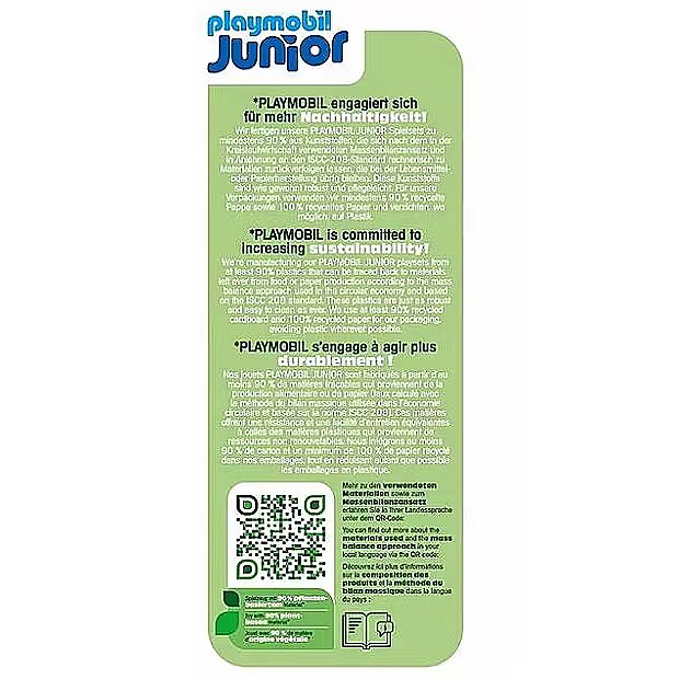 The packaging for PLAYMOBIL JUNIOR uses cardboard made from at least 90% and paper made from 100% recycled materials. Plastic is avoided wherever possible.