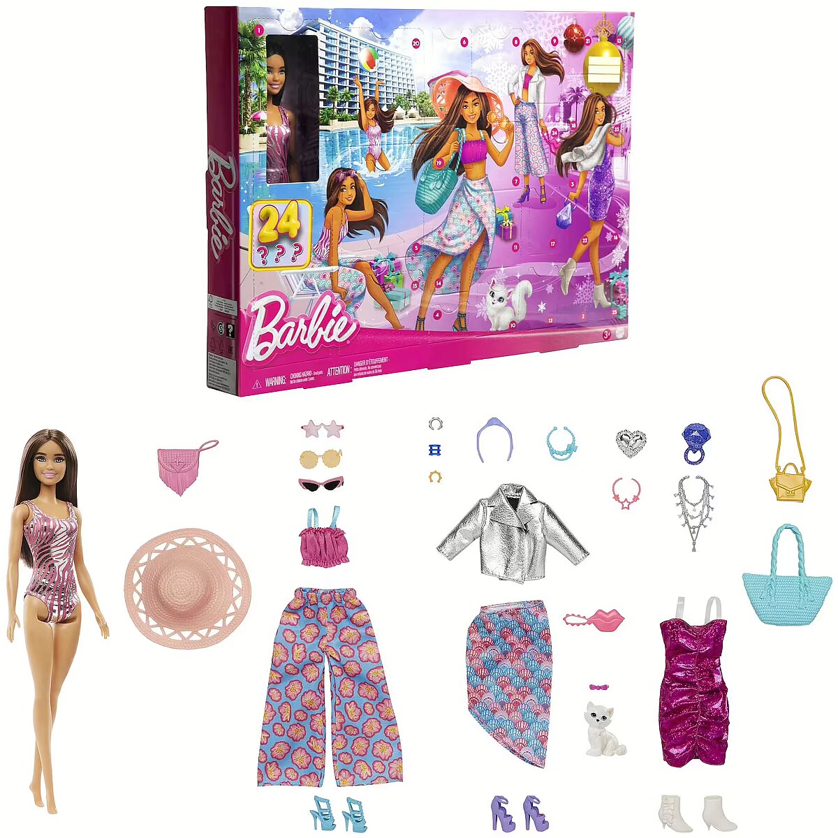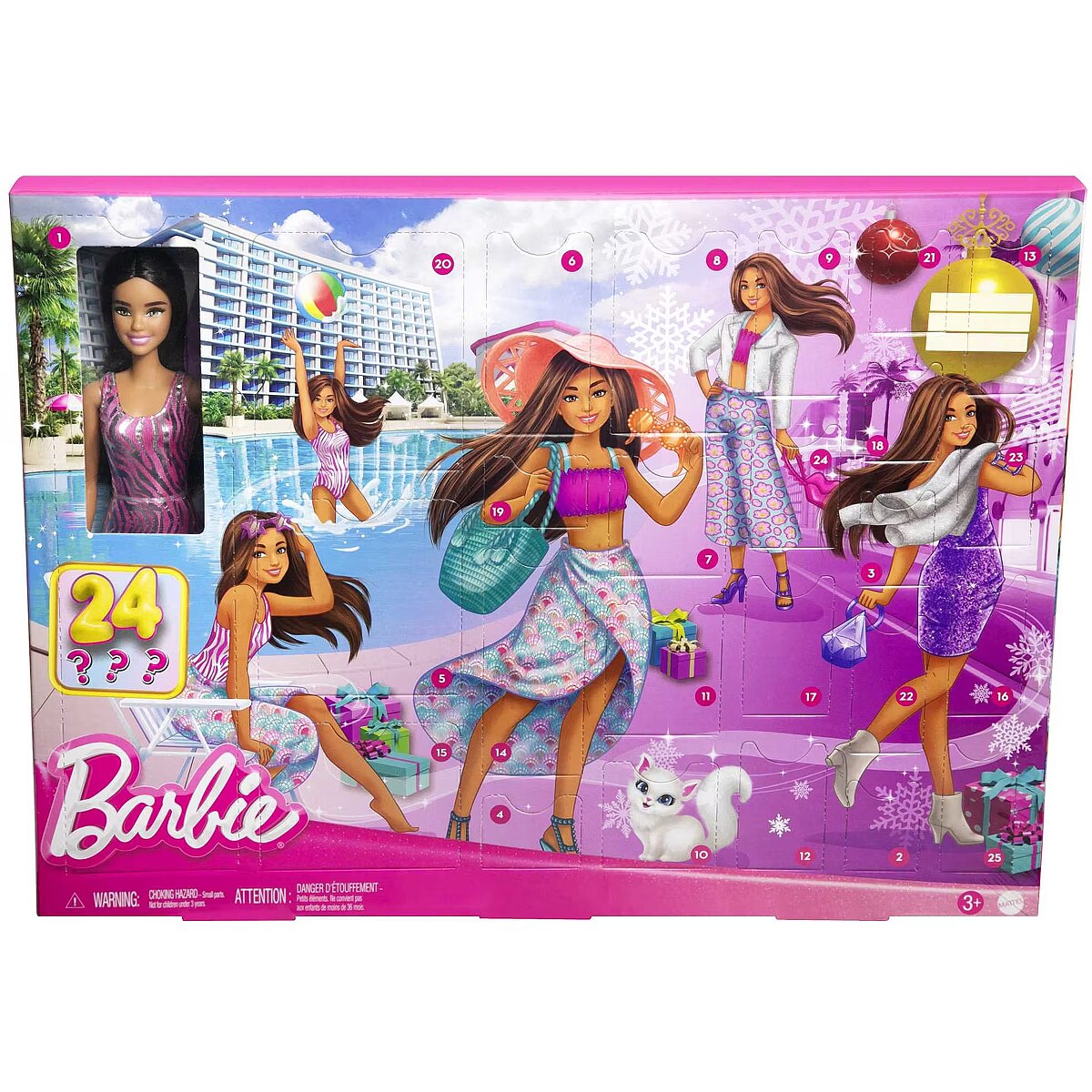 Description - With this fashionable Barbie Advent Calendar, Barbie doll is always perfectly dressed for day and night! It includes 24 elegant surprises so kids can always give their doll a new look and express their sense of style. The fun starts with unboxing and doesn't end with the glamorous outfits: this Barbie set is the perfect gift for kids aged 3 and up. The doll cannot stand on its own. Color and pattern may vary. What's better than a gift? 24 gifts! This gorgeous Barbie Advent Calendar includes 24 surprises that create stories with unique day and night outfits. Barbie doll has straight, brown hair and wears a metallic pink swimsuit with a zebra print that transforms into a tank top when paired with the included pants or skirt! Children can open the doors daily or discover the surprises right away. The set includes fashionable outfits like a silver blazer, a ruffled crop top, and a sparkly bodycon dress. Combine accessories add a unique touch! Use sunglasses, handbags, jewelry, shoes, and more to create incredibly cute and distinctive outfits. There's even a kitten for added fun! Whether for Christmas or a birthday, this Barbie Advent Calendar is a versatile gift that always opens up new play possibilities with 24 fashionable surprises.