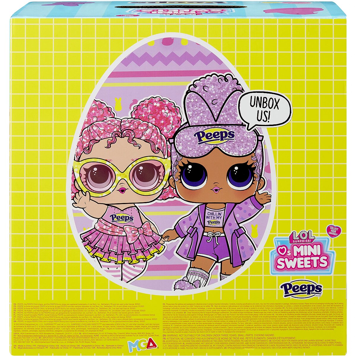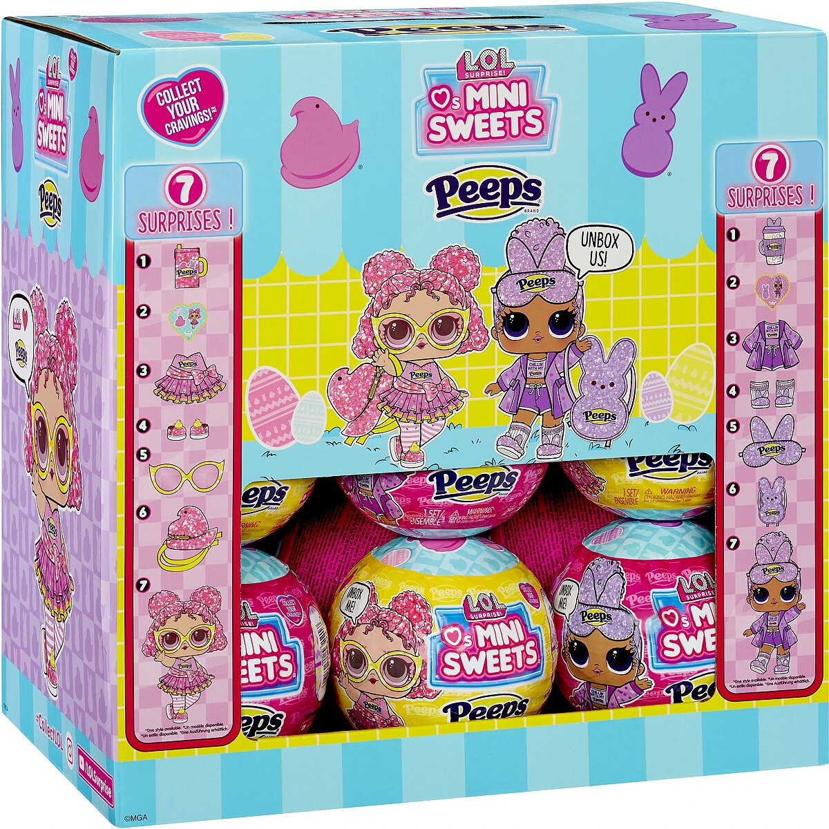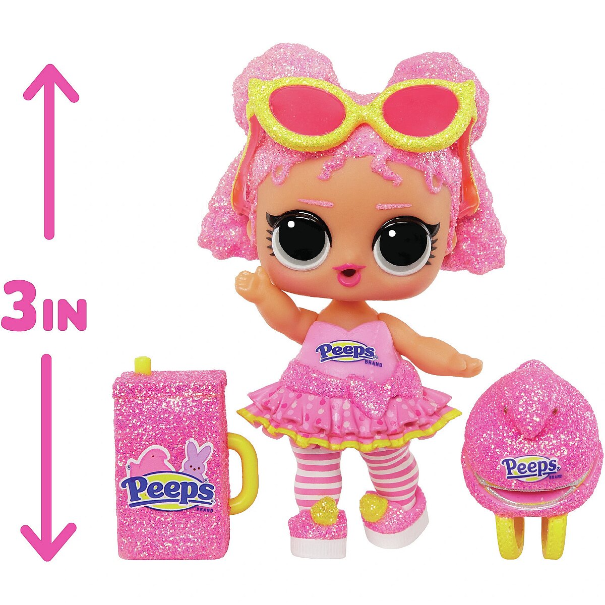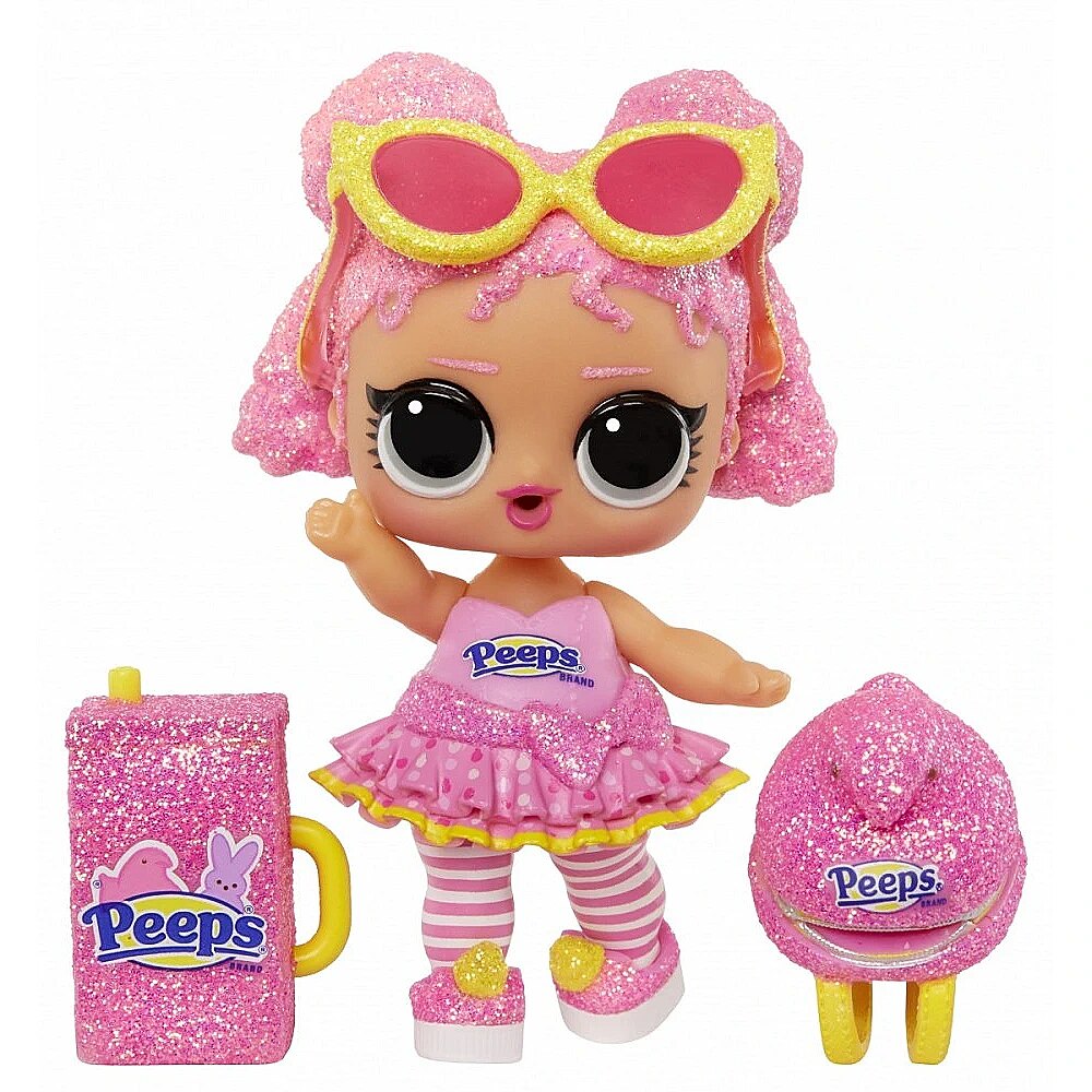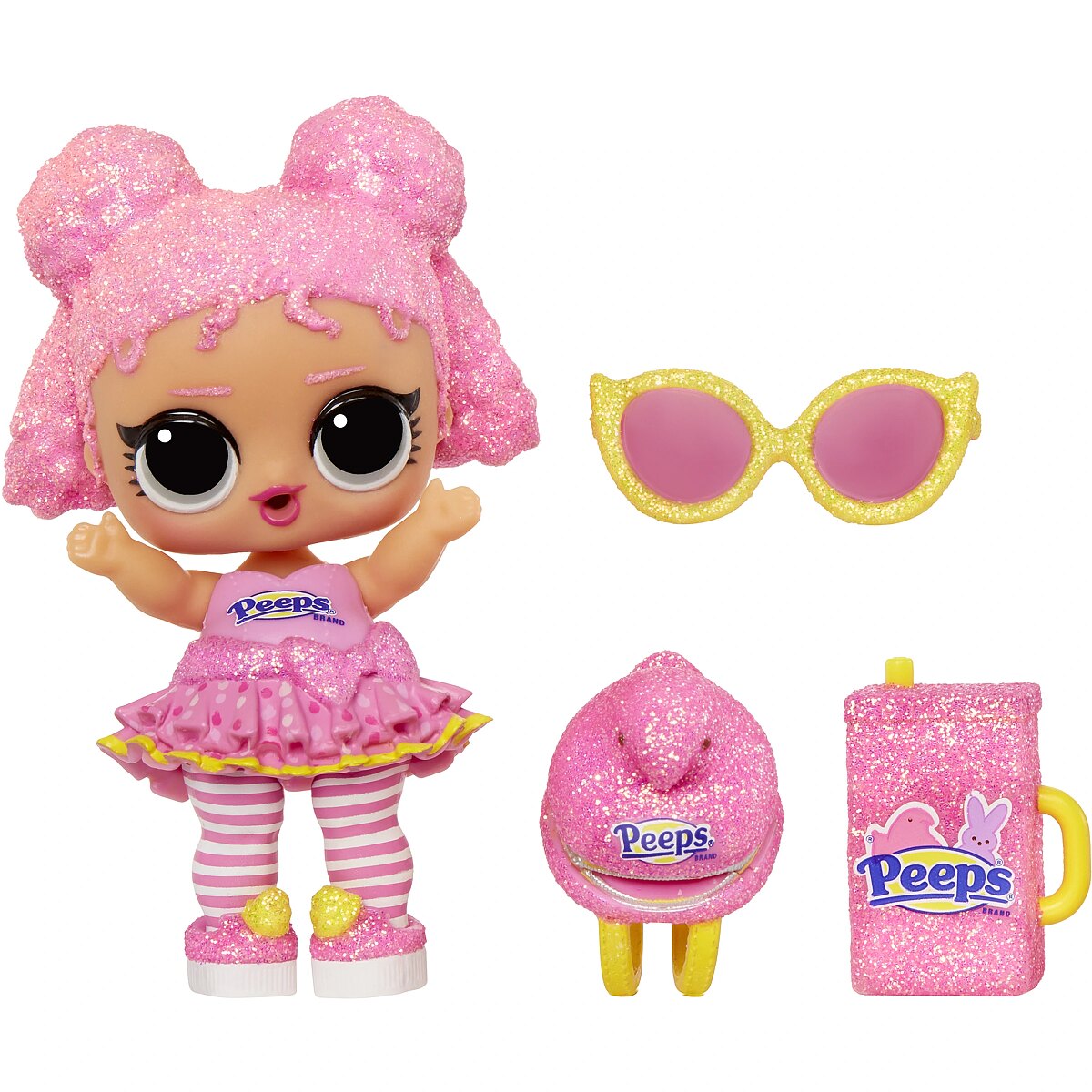 LongDesc - Introducing limited edition LOL Surprise! Loves Mini Sweets – Peeps Tots! LOL Surprise has partnered with iconic candy brand Peeps to bring you the most outrageously, cute spring ever. Fluff Chick has unique style with shimmering, sparkly pink details like her ruffle dress, chick backpack, and chick styled shoes that match your favorite Peeps treats! Unbox 7 surprises and celebrate spring with Fluff Chick’s adorable personality and style! Collect both LOL Surprise! Loves Mini Sweets Peeps Cozy Bunny and LOL Surprise! Loves Mini Sweets Peeps Fluff Chick! Both Cozy Bunny and Fluff Chick are hopping into spring with exciting goodies to share.Includes 7 surprises: (1) L.O.L. Surprise! Loves Mini Sweets Peeps Tots doll; (2) Fashion; (3) Shoes; (4) Bottle; (5) Accessory; (6) Accessory; (7) Sticker. LOL Surprise collectible dolls with stylish hair, fun to dress outfits and many detailed accessory pieces make a perfect toy and playset for kids! As birthday gifts and gifts for any special occasion, dolls provide hours of social play with siblings and friends! From MGA Entertainment, creators of LOL Surprise fashion and collectible dolls, Rainbow High fashion dolls, Na Na Na Surprise dolls, Bratz fashion dolls, MGA's Dream Ella fashion dolls, MGA's Glitter Babyz baby dolls, Lalaloopsy, Poopsie Surprise girls dolls, Baby Born Surprise Baby Dolls and Collectibles, Little Tikes kids toys and many other favorite brands.