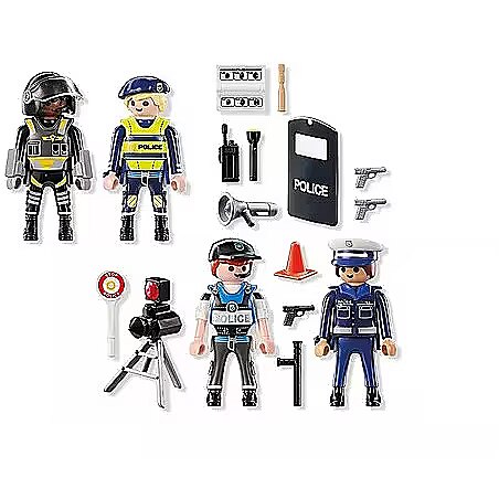 Zanurz się w pełne akcji policyjne przygody z tym wyjątkowym zestawem figurek policjantów PLAYMOBIL! Dzięki czterem funkcjonariuszom i wielu realistycznym akcesoriom, takim jak kabury, megafon i tarcza policyjna, możliwości pomysłowej zabawy będą nieograniczone. Stwórz swoim funkcjonariuszom niesamowite misje i kryminalne zagadki używając dołączonych akcesorii, takich jak migacz radarowy i latarka.