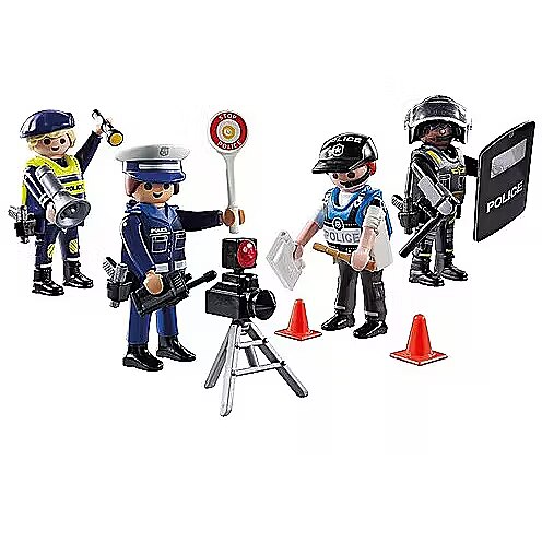 Accessories included - 1 x Mężczyzna w kasku policyjnym 2 x Mężczyzna w czapce policyjnej 1 x Kobieta w czapce policyjnej 3 x Kabury z pistoletami 1 x Tarcza policyjna 1 x Policyjna pałka wielofunkcyjna 1 x Kamizelka ochronna jednostki specjalnej 1 x Kielnia policyjna 1 x Przenośny radiotelefon 1 x Przenośny radar 1 x Kamizelka policyjna 1 x Pudełko z farbą i pędzlem 1 x Latarka 1 x Megafon 2 x Pachołki drogowe