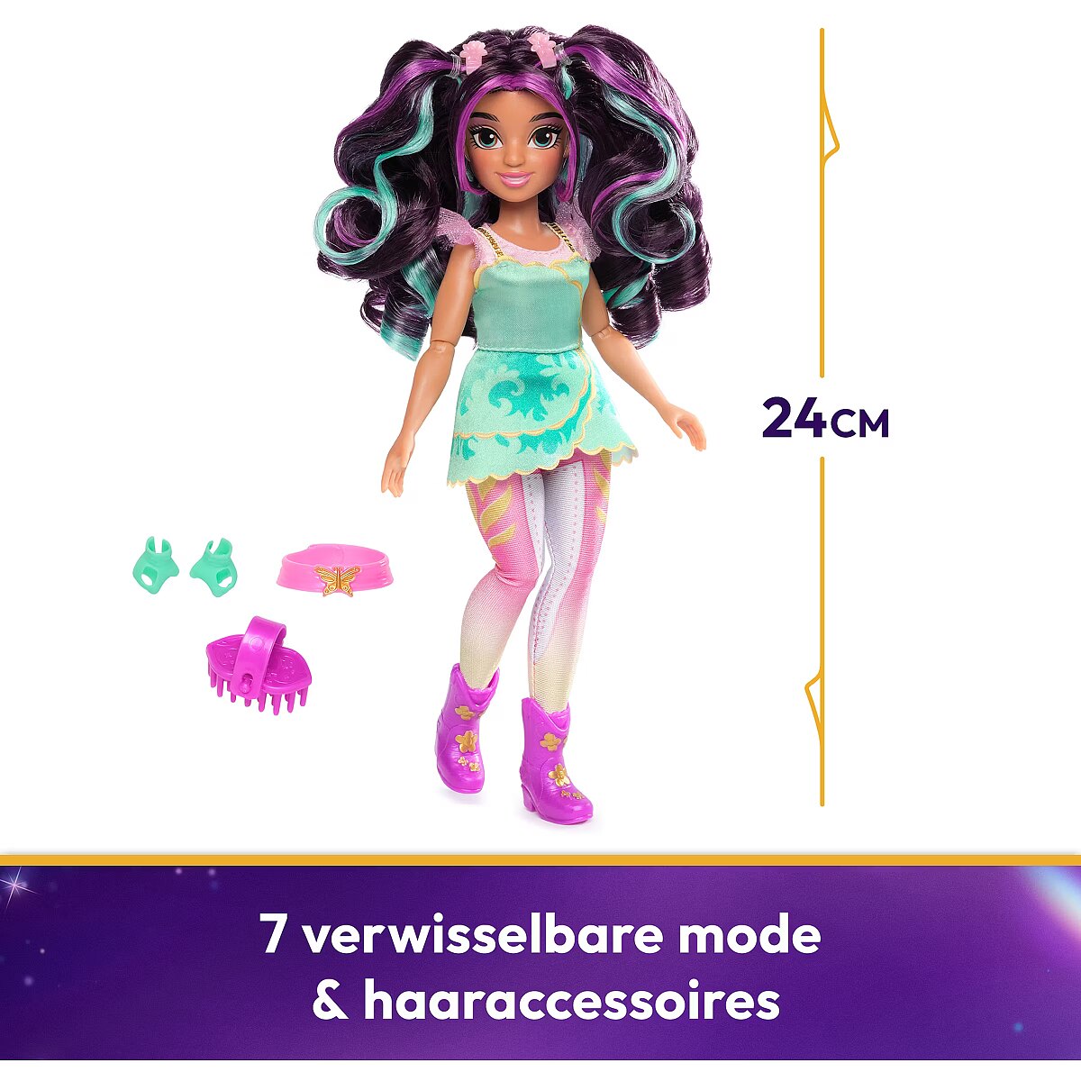 LongDesc - Create enchanting Unicorn Academy adventures at home with Sophia, Ava, and Isabel fashion dolls. Inspired by the NETFLIX animated show and best-selling book series where friendship reins, these 9.5-inch dolls for girls bring the characters to life. Beautifully detailed from head to toe, Ava’s bubbly personality comes through in her highlighted hair (styling accessory included) and her signature unicorn rider outfit: pink and teal petal dress, ombre pants with Plant Magic markings, floral boots and hair clips, gloves, and butterfly belt doll accessories. With 9 points of articulation, pose Ava as you protect Unicorn Island and its magic, and ride into adventure with her unicorn, Leaf (sold separately). The magical bonds between Unicorn Academy students and their unicorns will spark endless imaginative storytelling. For more ways to experience Unicorn Academy with your favorite characters, look for Sophia and Isabel dolls and their unicorns, Rainbow Light-up Wildstar and River (each sold separately) and expand your world. For kids who enjoy unicorns and horse toys, dolls & accessories, doll house play, collectibles, plush toys and more, Unicorn Academy toys are fun birthday gifts for girls or gifts for any occasion. Bring home the magic of Unicorn Academy with the Ava Doll.Includes: 1 Doll, 7 Removable Fashion Pieces, 1 Hair Styling Tool