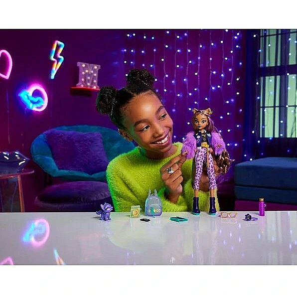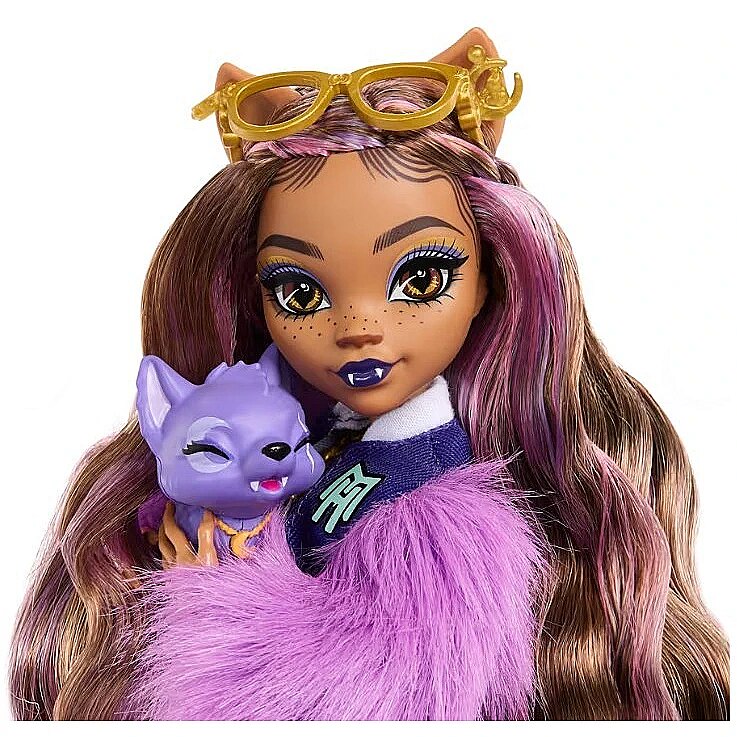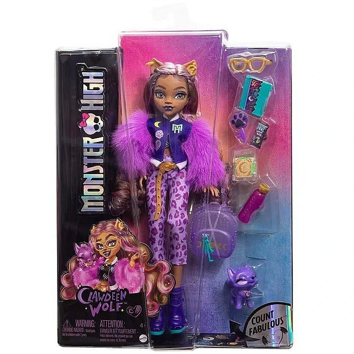 LongDesc - This Monster High doll makes quite an iclawnic werewolf! Clawdeen Wolf shows off her furrocious fashion sense in a head-to-toe purple lurk. Her creeptastic canine Crescent is ready to join in on the fun, too! With her poseable body and spooktacular storytelling accessories, Clawdeen Wolf doll is a perfect gift for kids 4 years old and up. Fully articulated. Doll cannot stand alone. Colours and decorations may vary.