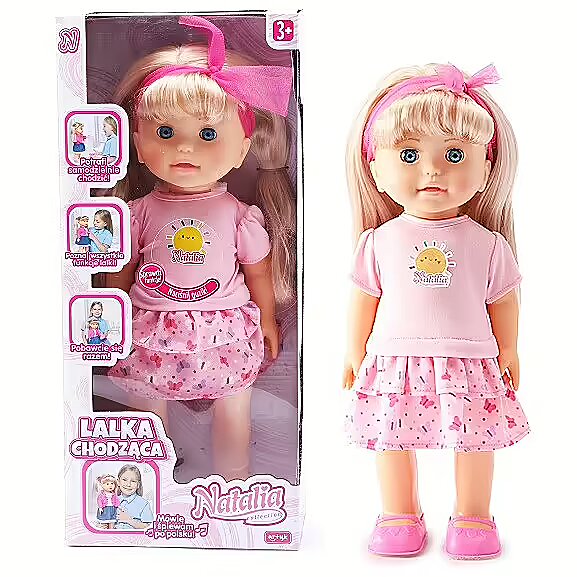 Description - Lalka Natalia chodząca 40 cm Po klaśnięciu 2 x w dłonie lalka zacznie chodzić Po naciśnięciu na brzuszek będzie śpiewać i mówić Mówi 7 fraz Śpiewa 3 piosenki: autobus, śmiej się w głos, raz dwa trzy czy wiesz ty Zamyka oczy Funkcja try-me Wszystkie funkcje aktywne po przestawieniu przełącznika na pleckach