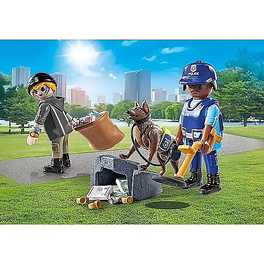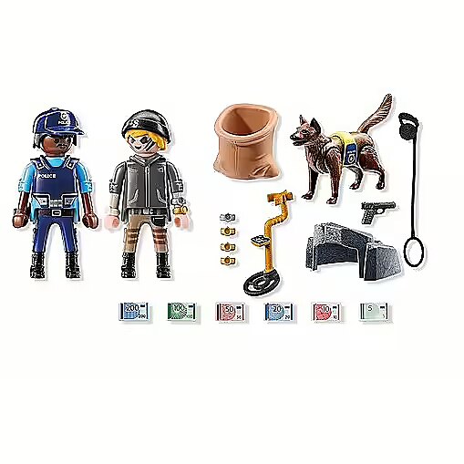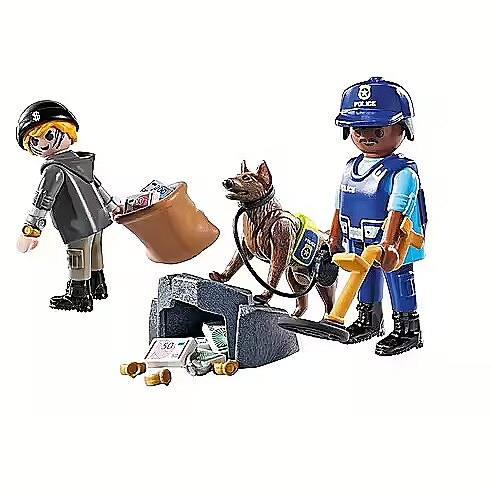 Dołącz do pościgu z tym pełnym akcji zestawem PLAYMOBIL! Przebiegły złodziej ukrywa swój łup w skalistych wzgórzach, ale za pomocą wykrywacza metalu oraz z tropiącym psem policyjnym napewno uda się złapać złoczyńcę. Dzięki akcesoriom, takim jak koc policyjny psa, kabury i czapki, zestaw jest pełen realistycznych detali, aby tworzyć kreatywną zabawę. Każda akcja jest pełna emocji, a znalezienie łupów przynosi każdemu ogromną satysfakcję.