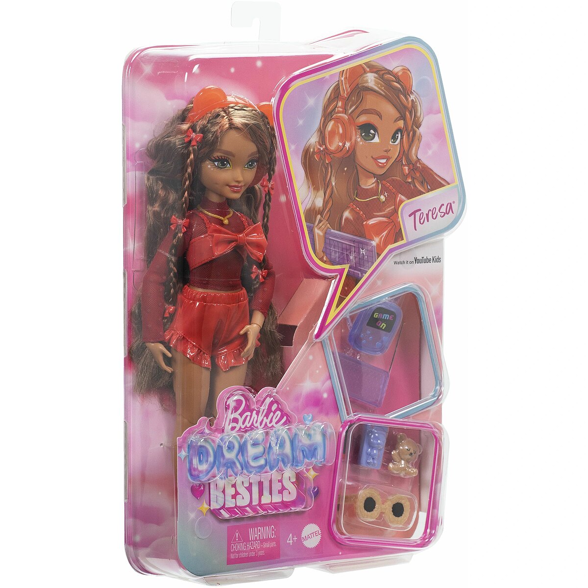 LongSummaryDescription - Barbie Dream Besties Teresa Fashion Doll with Video Game Themed Accessories, 10 Piece Count. Doll type: Fashion doll, Doll's gender: Female, Recommended age (min): 4 yr(s), Suggested gender: Boy/Girl. Height: 298 mm, Weight: 170 g. Material: Fabric, Plastic, Product colour: Multicolour