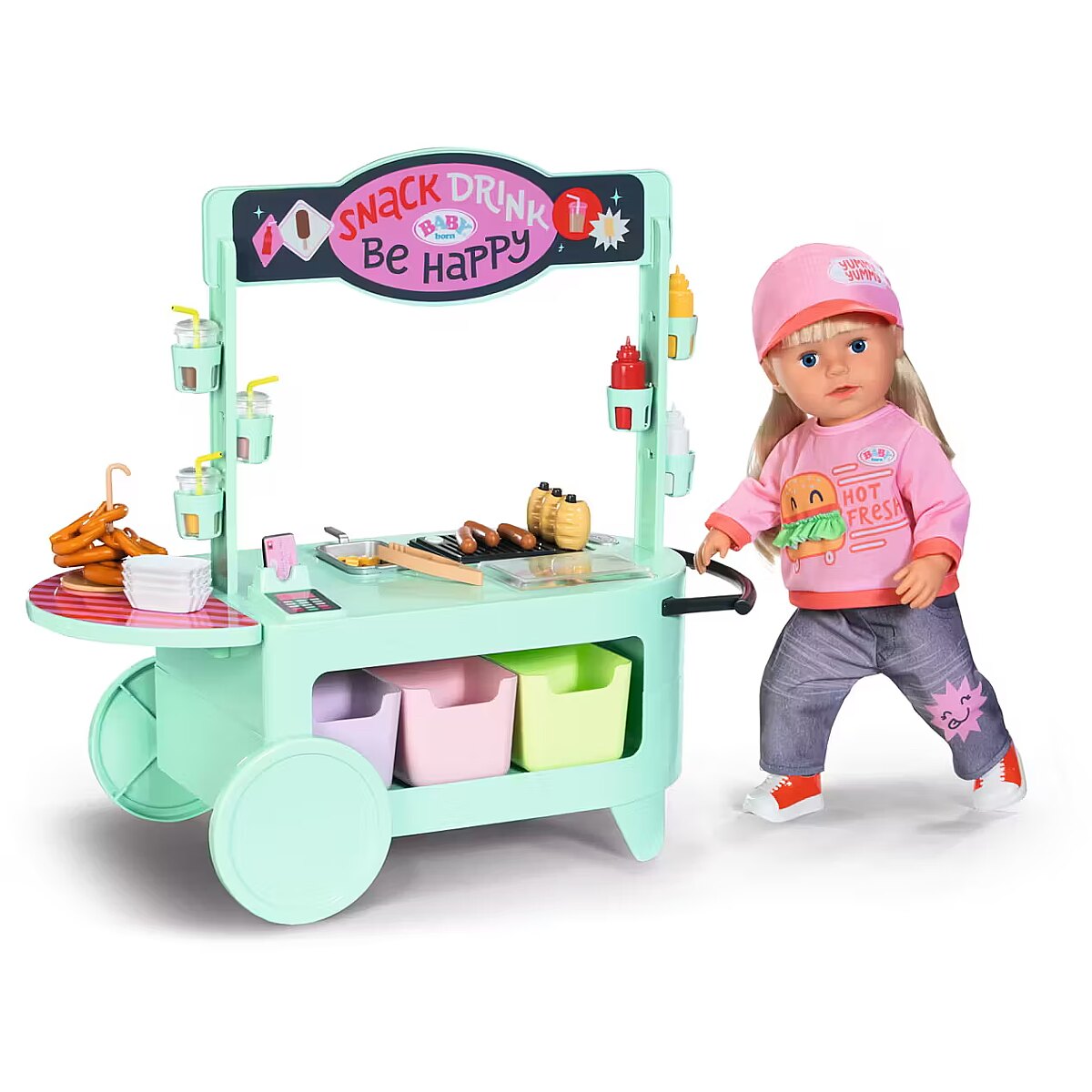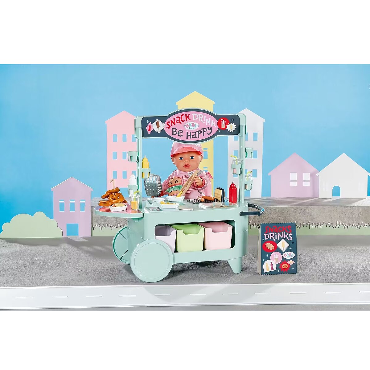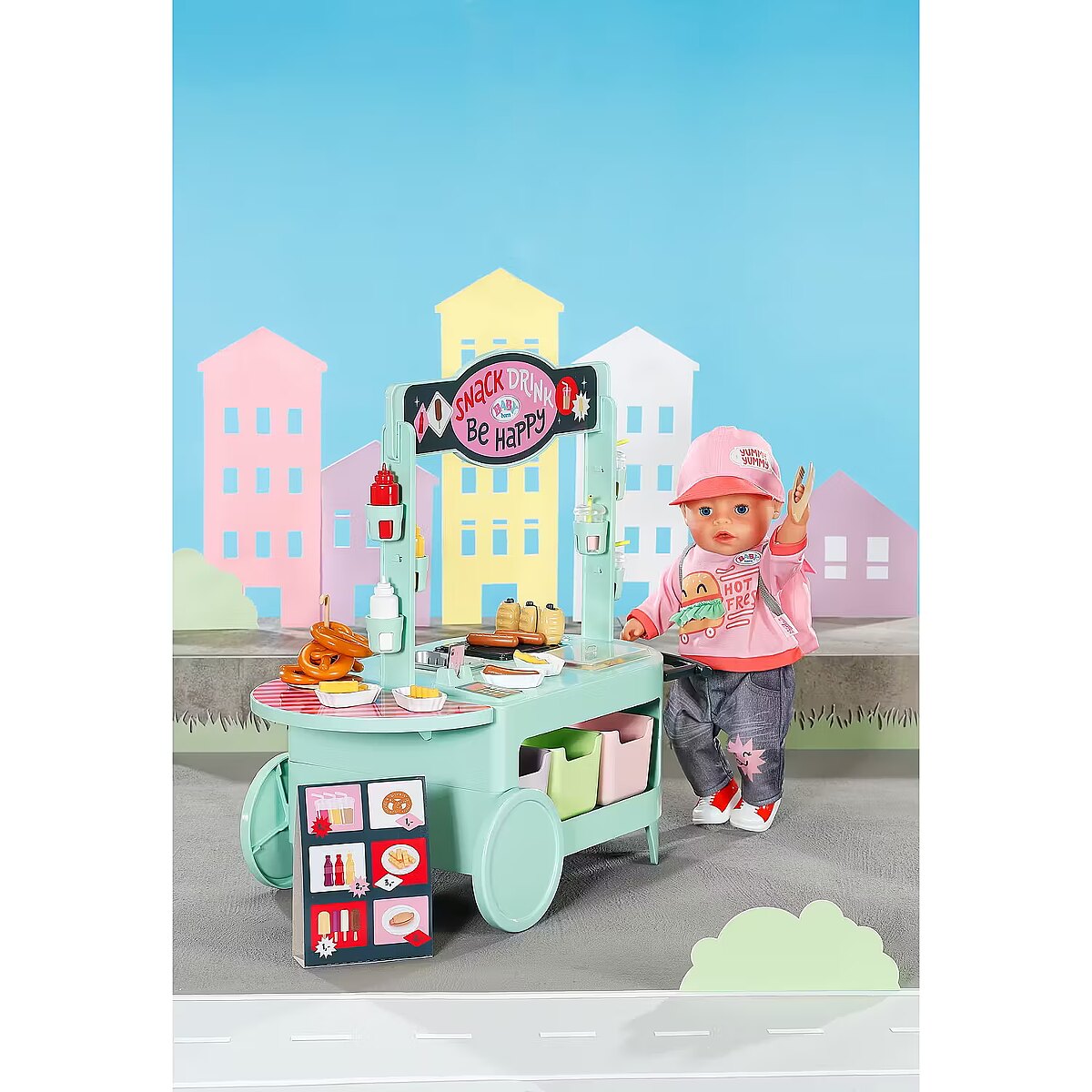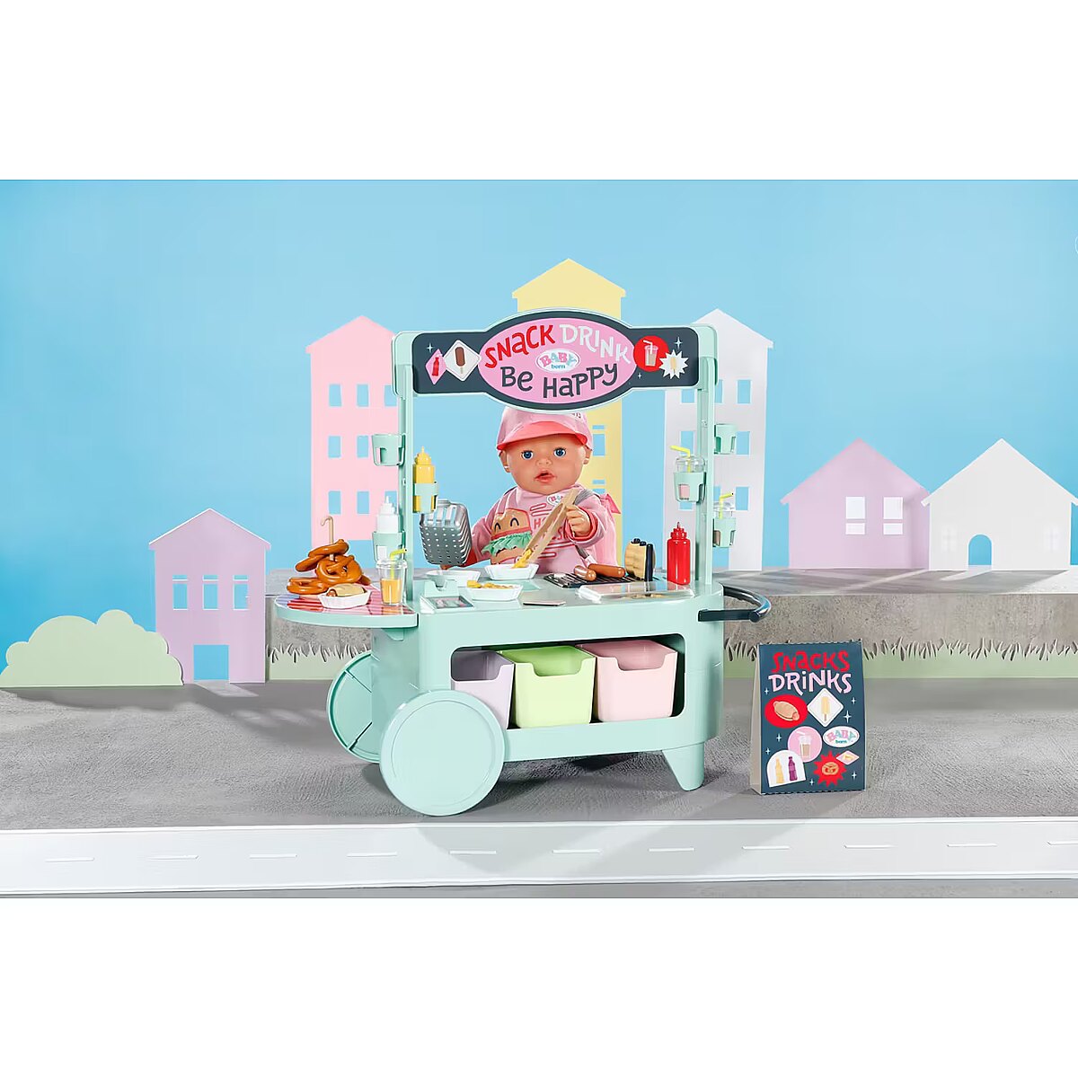 LongDesc - Can you hear the barbecue sizzling? The snack shop is open! To a cheerful melody, BABY born arrives with the trolley on moving wheels. In her luggage: a huge selection of 25 different fast food treats: Pretzels, sausages, mustard, ketchup, chips, mayonnaise, smoothies and even ice cream. The equipment for preparation is also included: barbecue tongs, frying basket, storage boxes, bottle holders and snack trays for serving.Children experience various food stalls and food trucks at fairgrounds, funfairs or city festivals, so the snack shop also brings the popular, classic play worlds of food preparation and sales into the BABY born world - in a modern way.