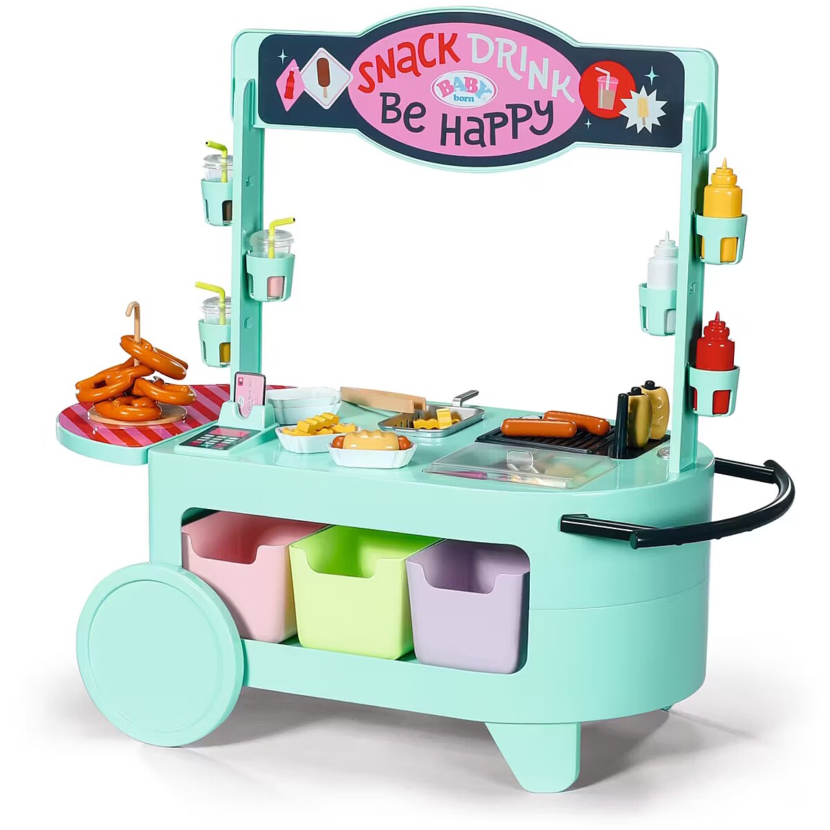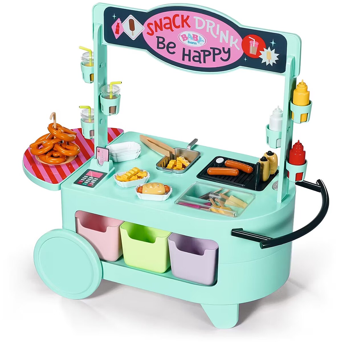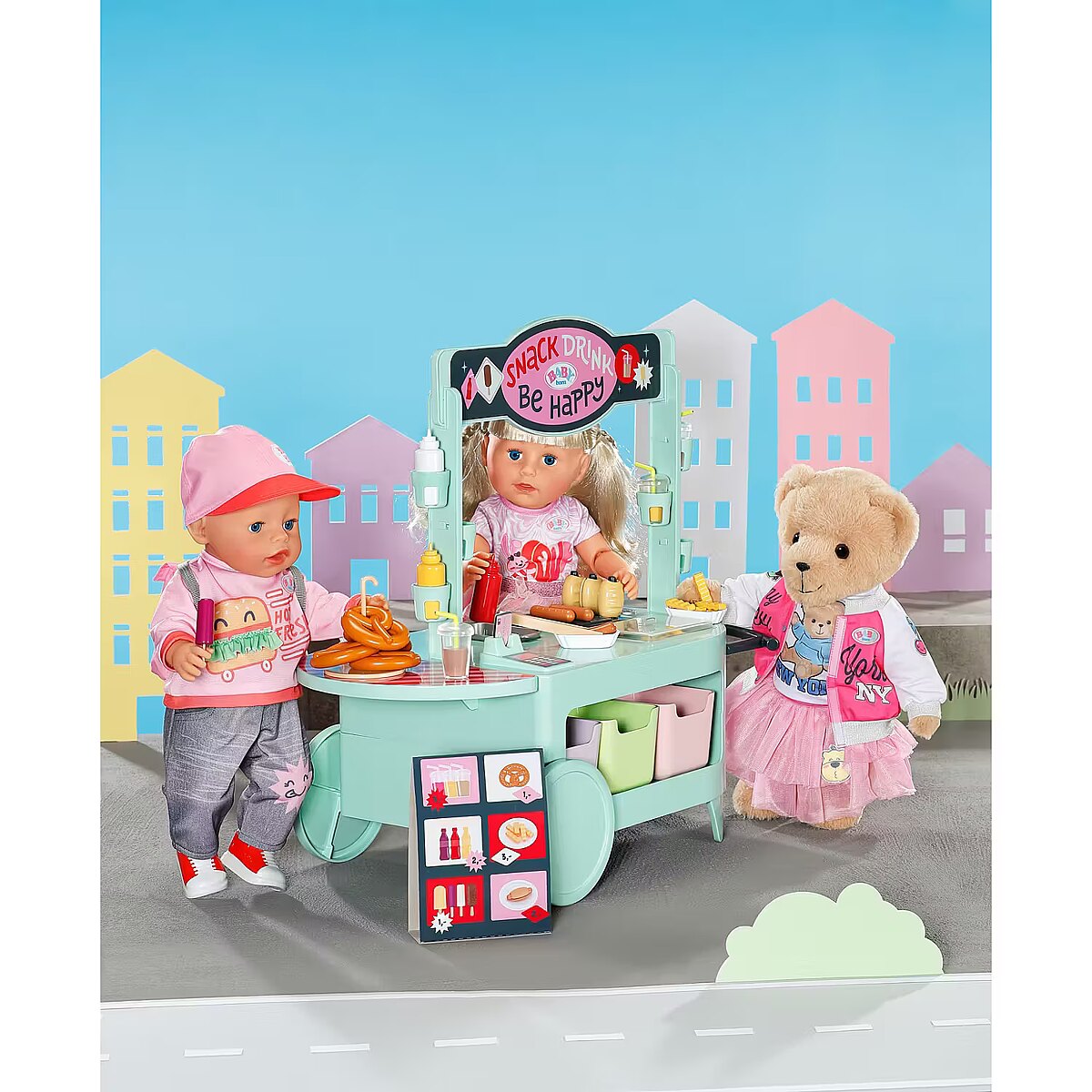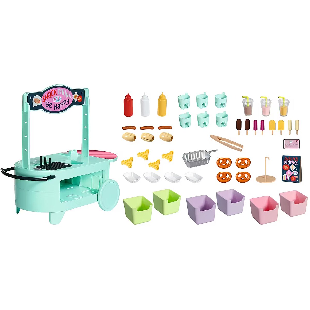 LongDesc - Can you hear the barbecue sizzling? The snack shop is open! To a cheerful melody, BABY born arrives with the trolley on moving wheels. In her luggage: a huge selection of 25 different fast food treats: Pretzels, sausages, mustard, ketchup, chips, mayonnaise, smoothies and even ice cream. The equipment for preparation is also included: barbecue tongs, frying basket, storage boxes, bottle holders and snack trays for serving.Children experience various food stalls and food trucks at fairgrounds, funfairs or city festivals, so the snack shop also brings the popular, classic play worlds of food preparation and sales into the BABY born world - in a modern way.