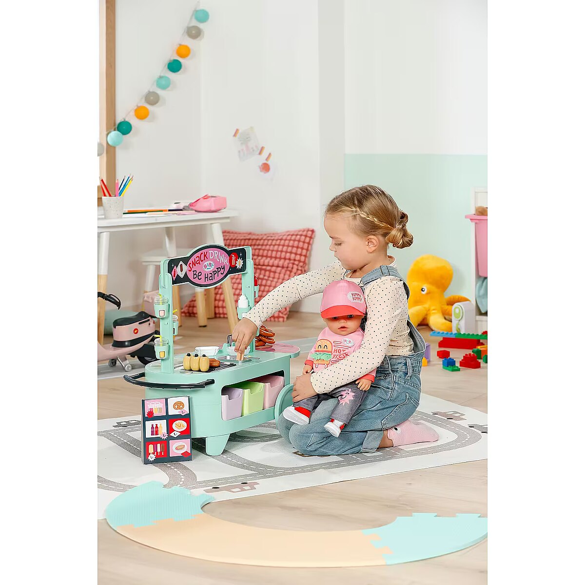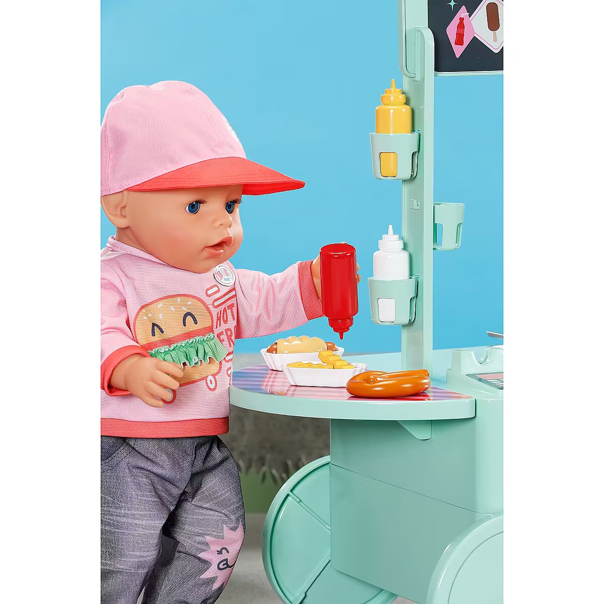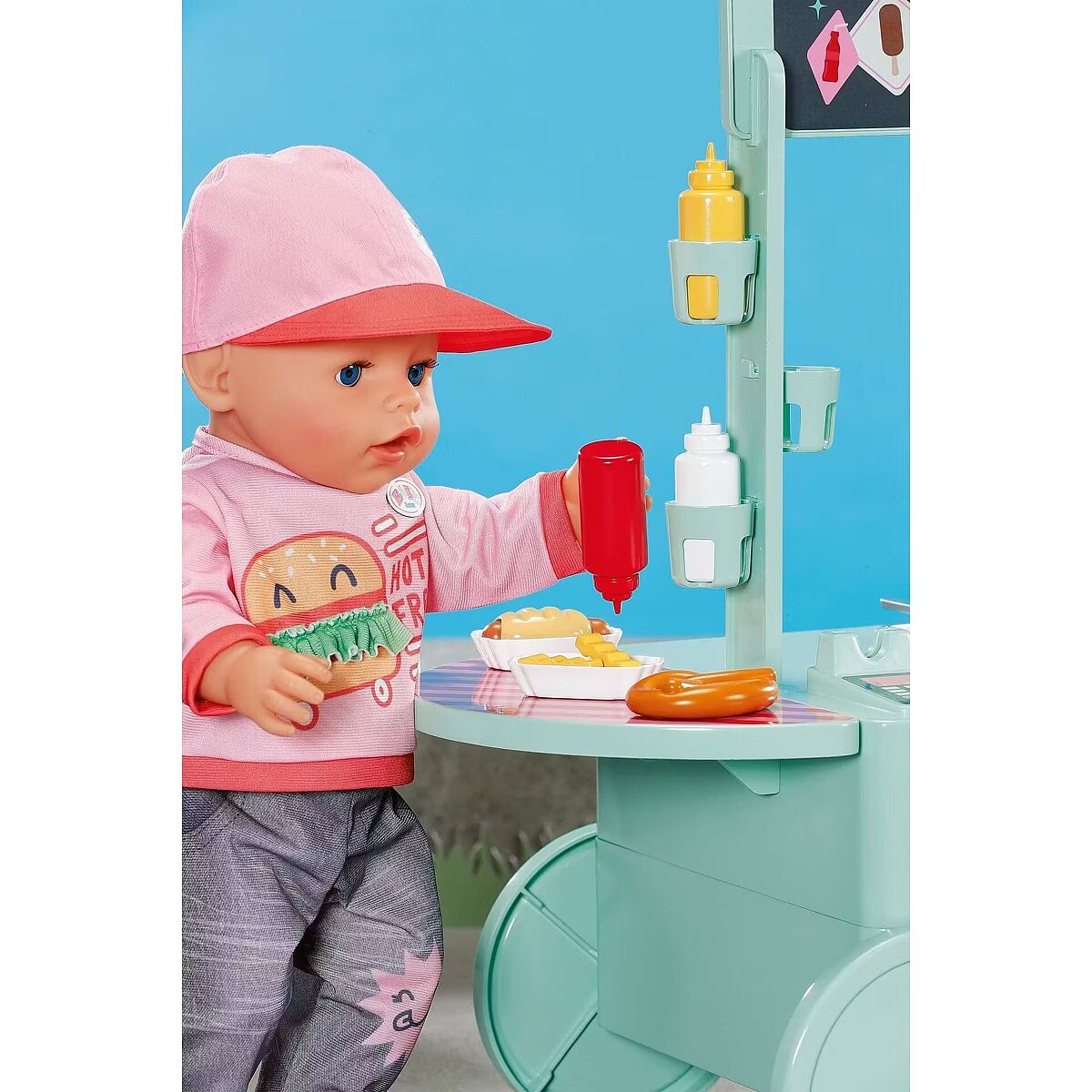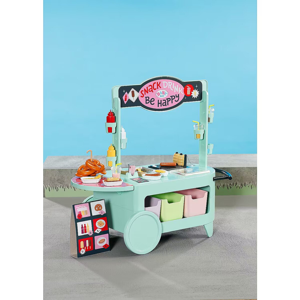 LongDesc - Can you hear the barbecue sizzling? The snack shop is open! To a cheerful melody, BABY born arrives with the trolley on moving wheels. In her luggage: a huge selection of 25 different fast food treats: Pretzels, sausages, mustard, ketchup, chips, mayonnaise, smoothies and even ice cream. The equipment for preparation is also included: barbecue tongs, frying basket, storage boxes, bottle holders and snack trays for serving.Children experience various food stalls and food trucks at fairgrounds, funfairs or city festivals, so the snack shop also brings the popular, classic play worlds of food preparation and sales into the BABY born world - in a modern way.