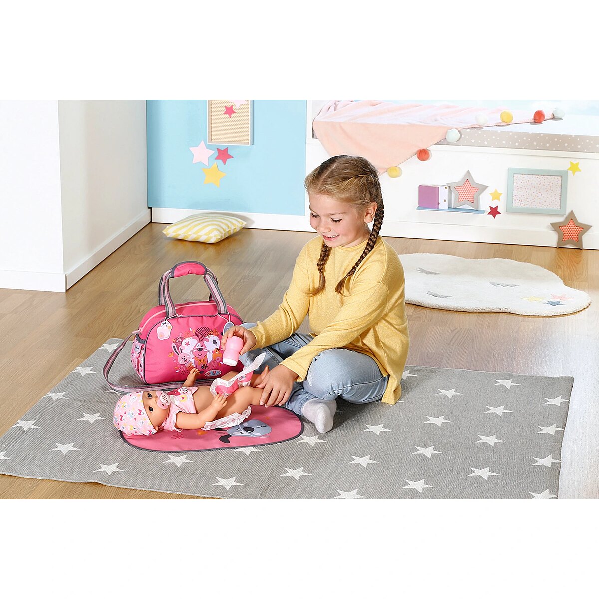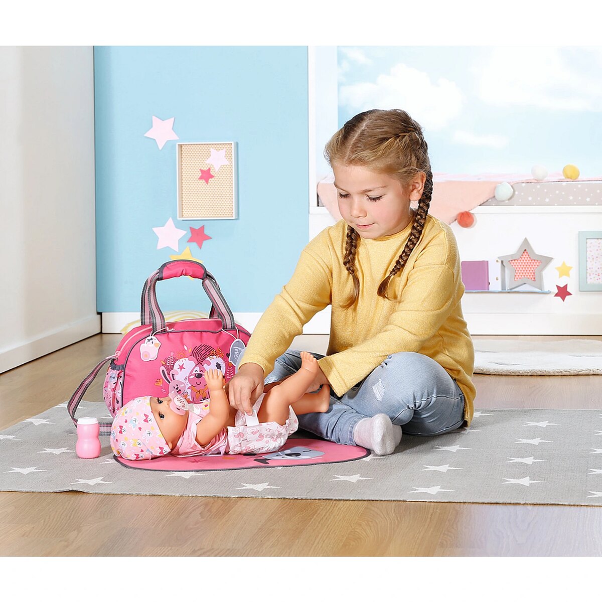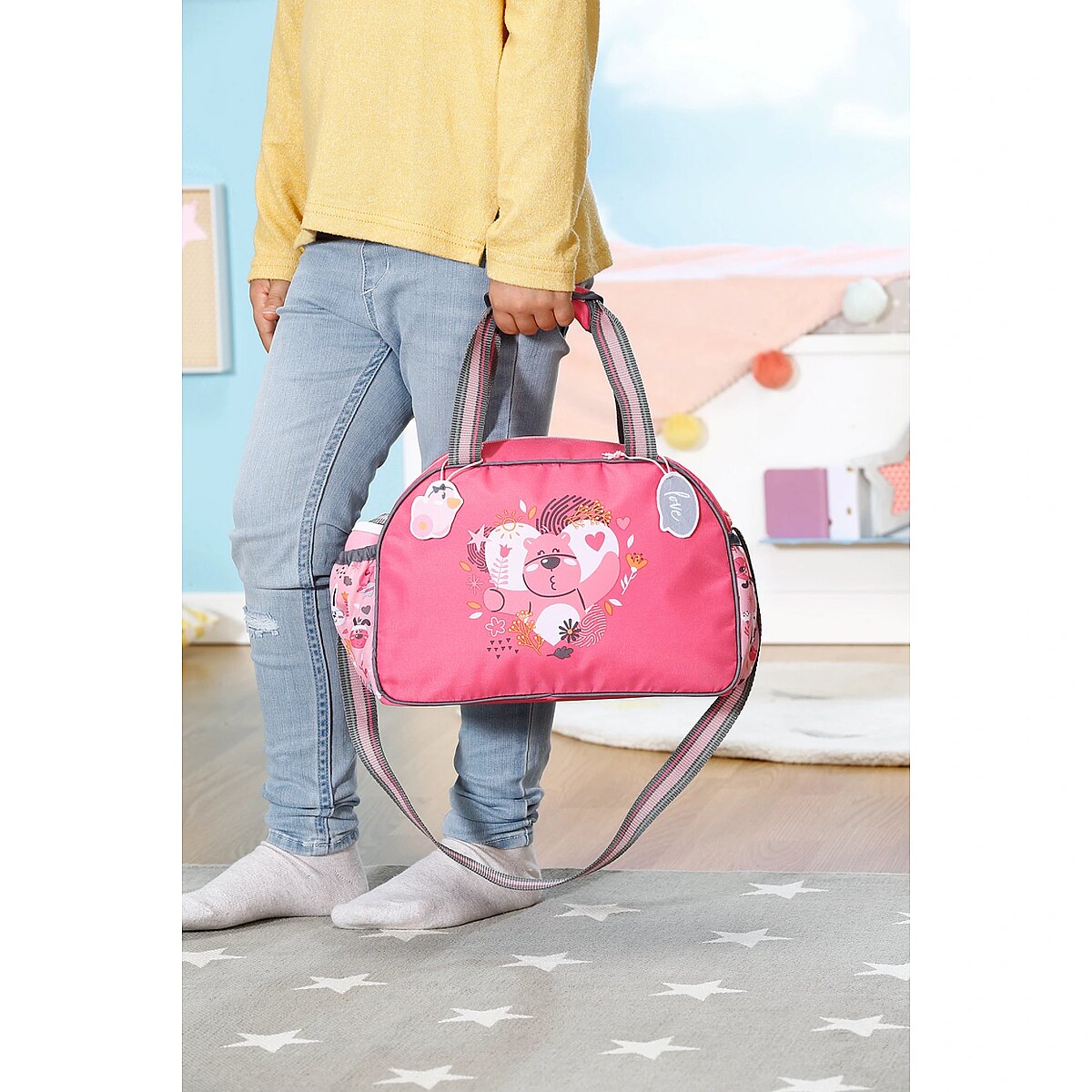 Description - BABY born Torba na pieluchy z akcesoriami BABY born cieszy się na każde wyjście, podobnie jak jej przyjaciele - zwierzątka, których wizerunki widnieją na przewijaku. Uuuups z tej ekscytacji właśnie zrobiła siusiu. Jakie to szczęście, że pod ręką zawsze jest przewijak. Jet w nim wszystko, czego potrzebuje dziecko: mata do przewijania, pieluszka i pojemnik z pudrem. Jest także miejsce na butelkę z napojem, rozkład jazdy autobusów i zebrane po drodze skarby. Przewijak można komfortowo przenosić trzymając w ręku lub wieszając na ramieniu. Do pasków doczepiono urocze zawieszki, którymi BABY born może się bawić podczas przewijania. Wysokiej jakości akcesoria do oryginalnych lalek BABY born. Dla ciekawszej, różnorodnej i niekończącej się zabawy. Odpowiednie dla lalek w rozmiarze 36 cm i 43 cm.