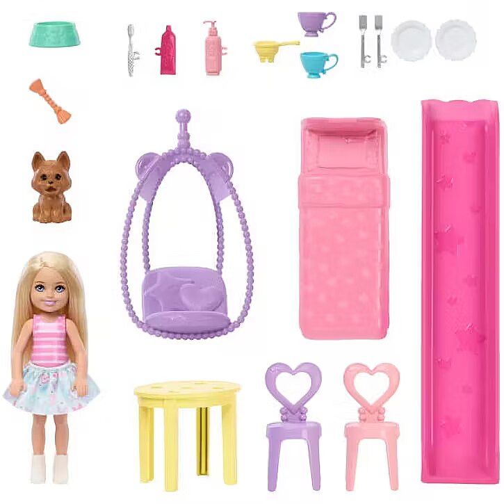Description - Rozgość się w Rozkładanym domku Chelsea! Ten uroczy domek dla lalek otwiera się i przekształca w duży zestaw z ponad pięcioma obszarami zabawy! Lalka Chelsea i jej piesek mogą odpoczywać na wiszącym fotelu w salonie, gotować w kuchni z otwieranym piecykiem, słodko drzemać w sypialni, szaleć na zjeżdżalni i dbać o higienę w łazience. Rozkładany domek dla lalek jest w pełni umeblowany dzięki takim akcesoriom jak łóżeczko, wiszący fotel, stół i krzesła, przybory kuchenne, szczoteczka do zębów, pasta do zębów i miseczka dla pieska. Dzieci mogą wymyślać nieskończenie wiele przygód z Chelsea w jej uroczym domku! Kolory i elementy dekoracyjne mogą się różnić. Rozkładany domek Chelsea przekształca się z małego domku w duży, w którym znajdziesz ponad 5 obszarów zabawy! Dzieci zachwycą się tą transformacją, podczas której wymiary domku rosną z 21,5 × 23,5 cm do 43 × 33 cm! W zestawie są różnorodne akcesoria, lalka Chelsea i piesek, z którymi możesz odgrywać mnóstwo momentów pełnych przyjaźni. Przyjaciele mogą odpoczywać w salonie, gotować w kuchni z otwieranym piecykiem, słodko drzemać w sypialni, szaleć na zjeżdżalni i dbać o higienę w łazience. W zestawie z domkiem są też mebelki dla lalek, w tym łóżeczko, wiszący fotel oraz stół i serduszkowe krzesła. Wzbogacaj wymyślane opowieści mniejszymi akcesoriami, takimi jak talerze, widelce, butelka mydła, szczoteczka do zębów oraz miseczka i zabawka dla pieska. Poczuj się jak w domu, otwierając drzwi z mniejszym otworem dla pieska! Dzieci w wieku od 3 lat mogą wymyślać mnóstwo przytulnych domowych opowieści z lalką Chelsea i jej Rozkładanym domkiem!