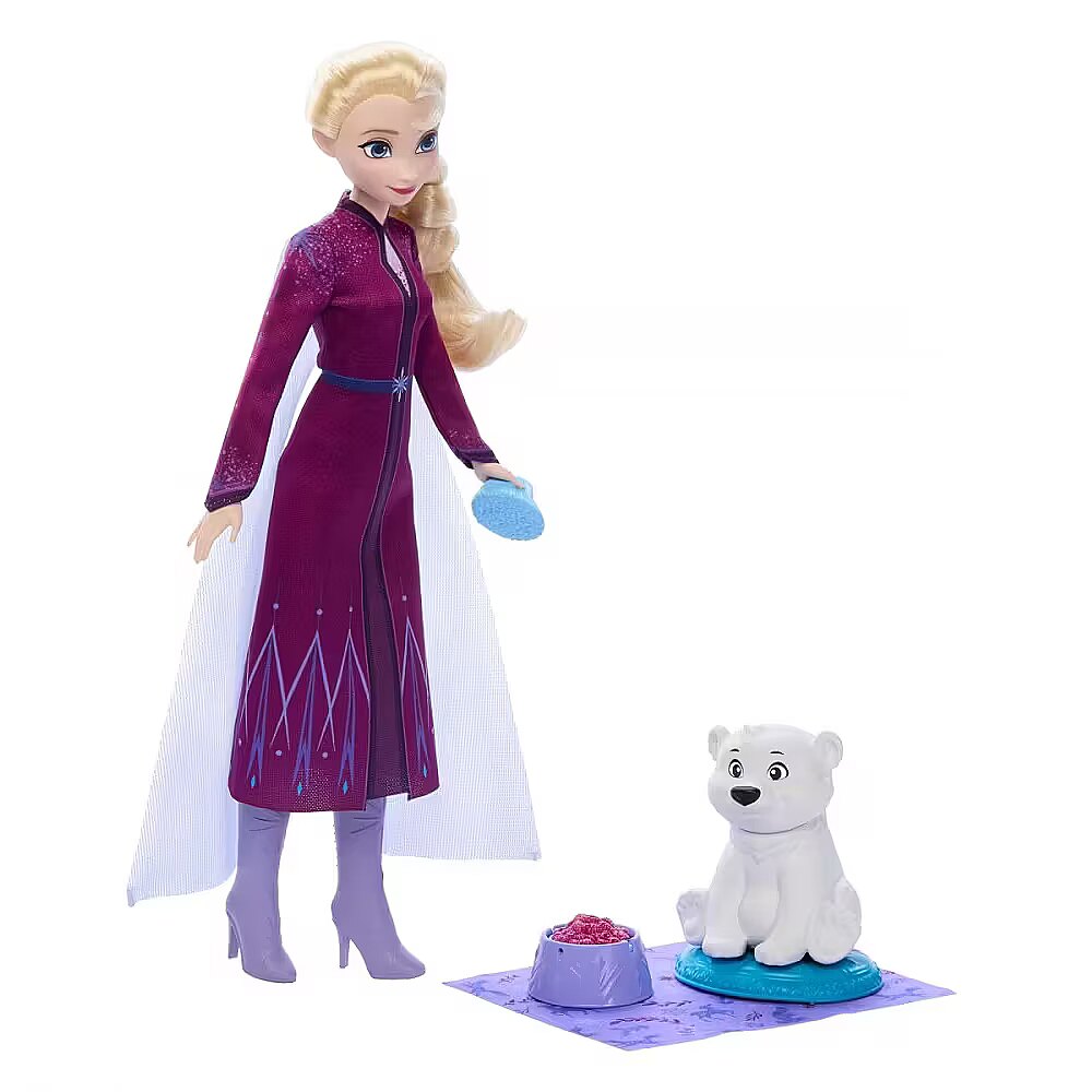 LongDesc - A magical Winter Wonderland brings Elsa and an adorable polar bear cub together! Inspired by Disney Frozen and the Animals of Arendelle: Lost and Found short-form videos, this animal-nurturing set includes fashion doll Elsa in a removable fashion, a cute polar bear figure and four accessories to care for the cub: a blanket, an animal bed, a brush and a bowl that flips from food to water. Doll cannot stand alone. Colours and decorations may vary.