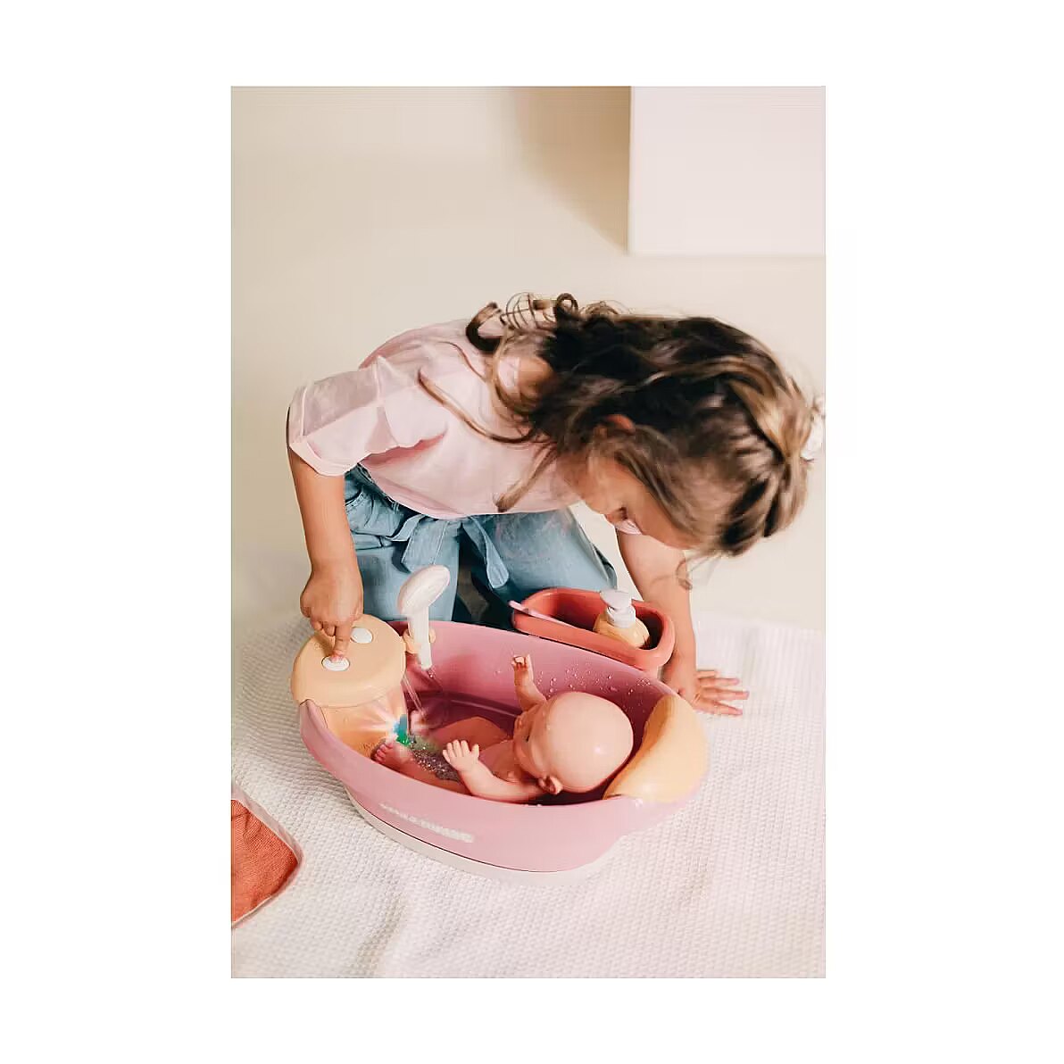 Description - Smoby Baby Nurse Balneo Bath All your favourite dolls will feel right at home in the Smoby Baby Nurse doll bathtub! While they take a nice, warm bath, bubbles rise to the top and a great light effect with different colours provides variety. After washing, they can be rinsed off quickly, as real water flows out of the automatic shower head at the touch of a button. The bath has an electronic module with 2 functions: Water jet with closed circuit and bubbles with light. The headrest ensures that your little one lies comfortably even during longer bathing sessions. The storage area offers enough space to store the accessories supplied: Cotton towelling bath towel, a shampoo bottle with pump function and a whale thermometer. The thermometer is heat-sensitive and changes colour when it comes into contact with water. Suitable for dolls up to 42 cm. Doll not included.