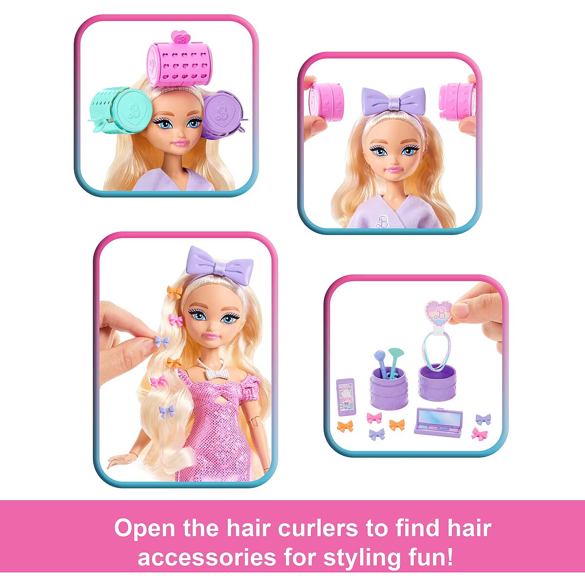 Accessories included - Lalka Barbie Dream Besties Barbie Malibu w szlafroku i kapciach 4 wałki do włosów Opaska na oczy 3 gumki do włosów Komórka Lampa pierścieniowa 4 akcesoria do makijażu Bransoletka Opaska do włosów z kokardką 6 spinek do włosów Sukienka Para bucików na obcasie