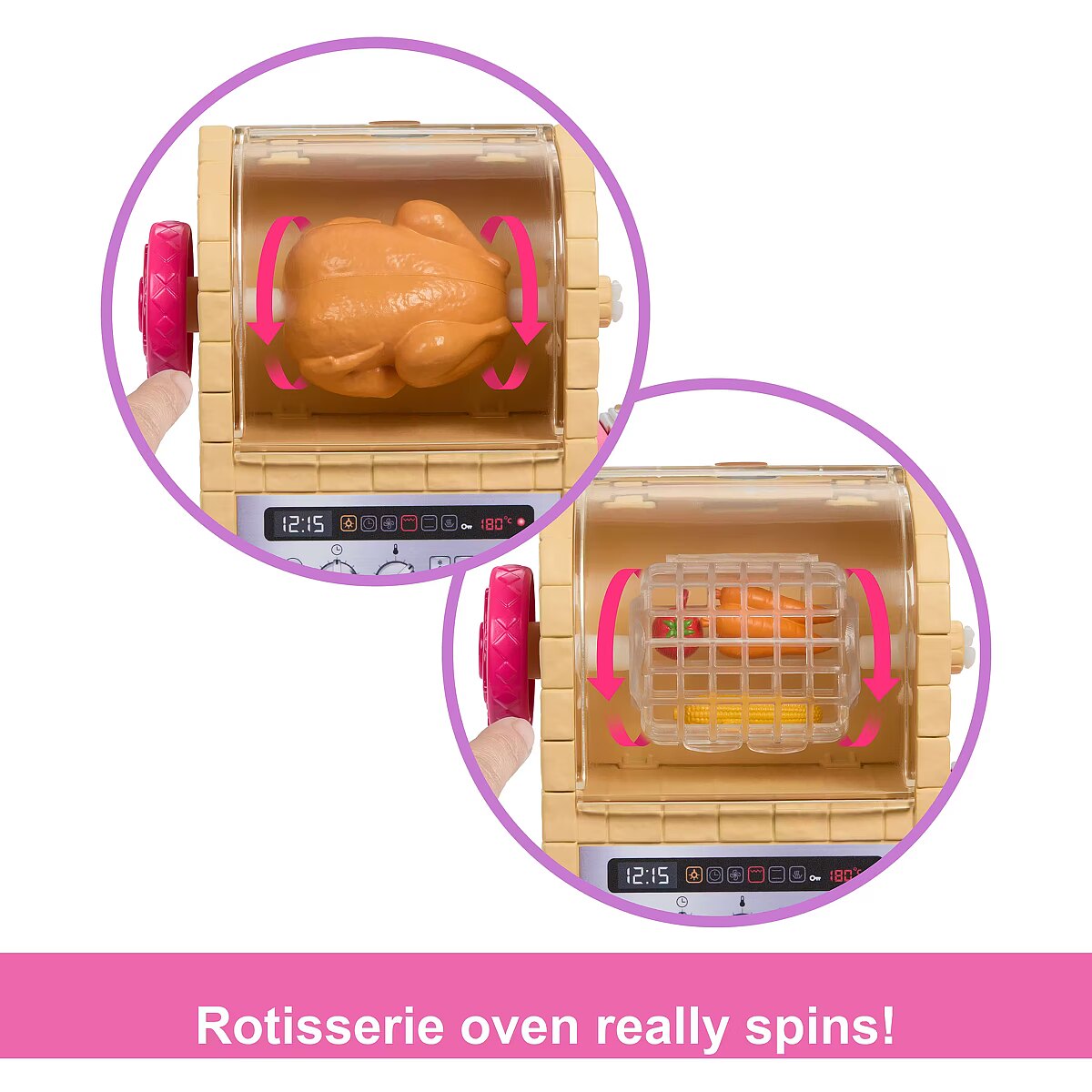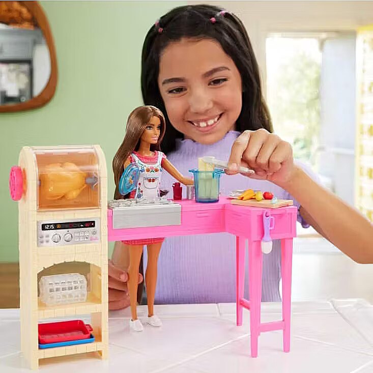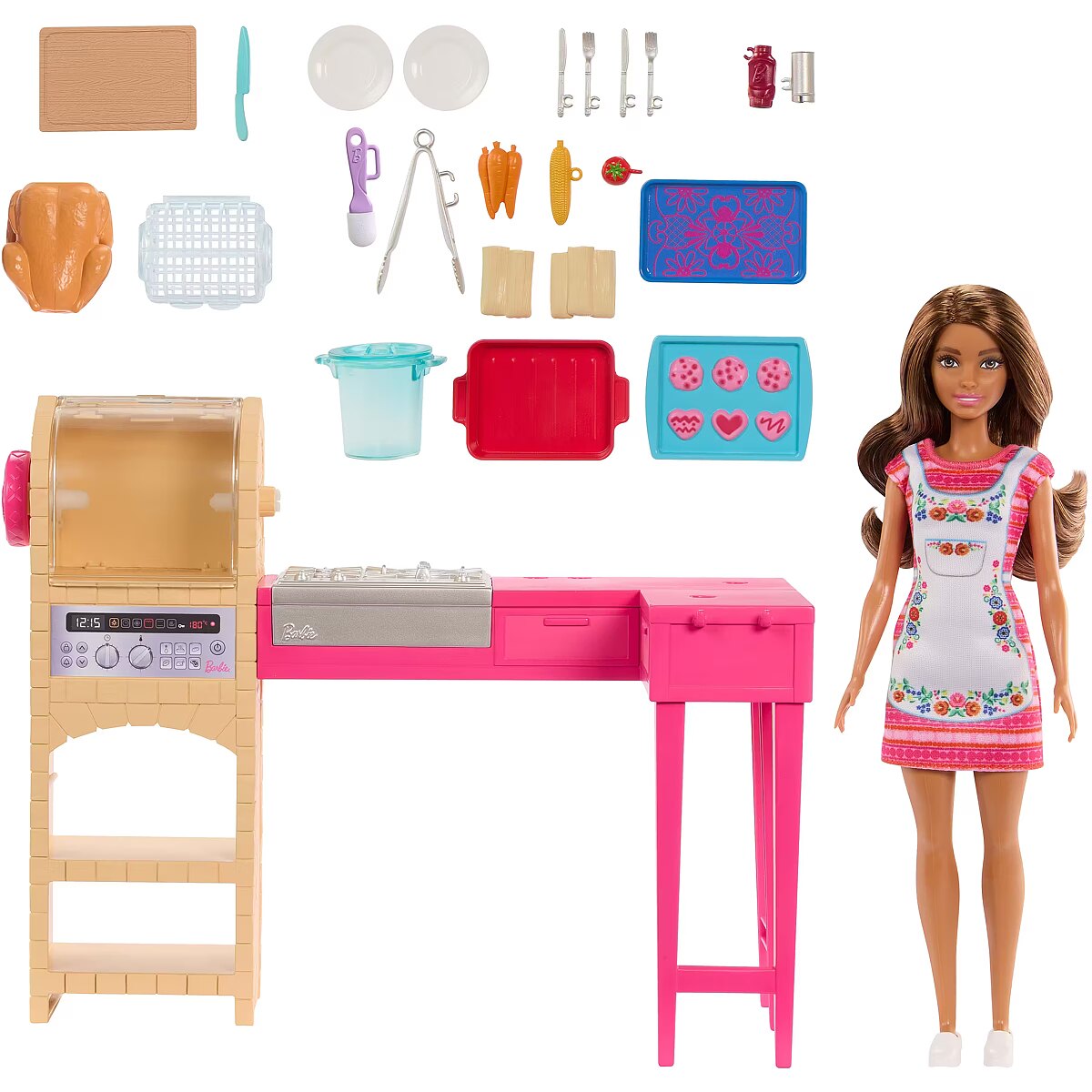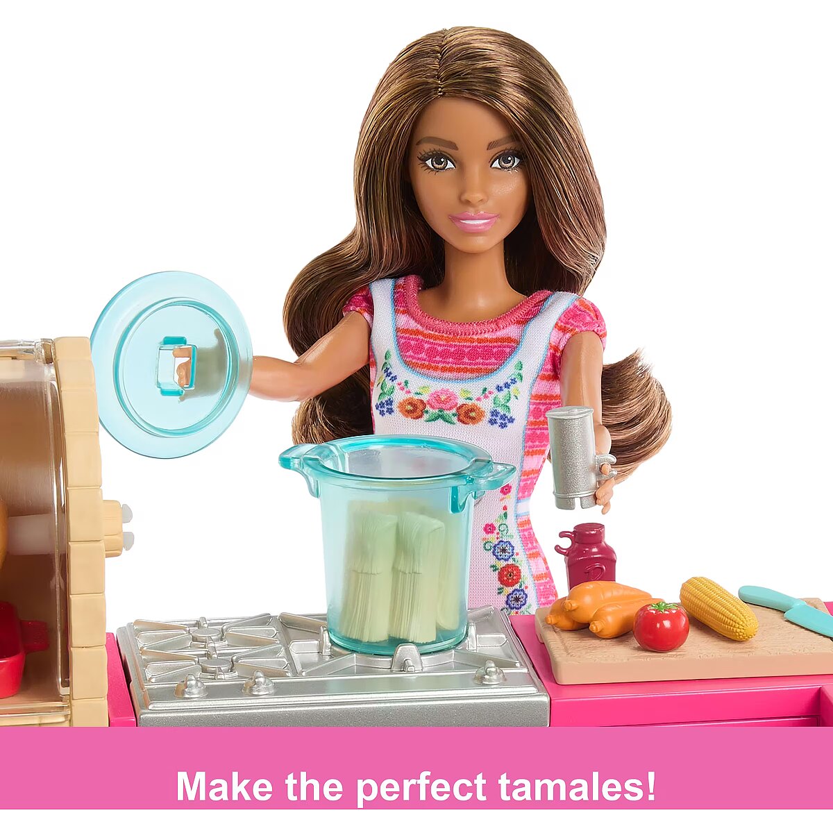 LongDesc - Imaginations can cook up all kinds of stories with this Barbie and Teresa Recipe for Friendship Teresa doll and kitchen playset with more than 20 accessories. Inspired by the movie, Teresa's recipes come to life with a kitchen furniture piece featuring a rotating rotisserie oven, tamales that fit in a pot and colour-change cookies. Young foodies will love the realistic play opportunities as they cook veggies and serve a 'yummy' meal. Teresa doll is dressed to chef wearing her signature look detailed with the apron gifted to her by her grandmother. Kids and fans ages 3 years and older will love recreating scenes and making up new recipes for adventure! Doll cannot stand alone. Colours and decorations may vary.