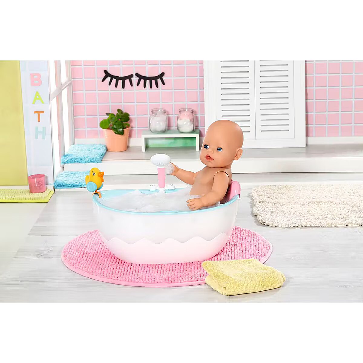 LongDesc - Take aim, fire, aaaand… GOT YOU! Brother is really wet now. A bath duck like this is just perfect for water fights. You can position it anywhere along the edge of the bathtub, just like the heart-shaped pillow. The tub is water-blue on the inside and white with an embedded wave shape on the outside. If you press the light switch next to the shower, the outer shell of the bathtub lights up in alternating colours. The shower button activates the pink and white shower. If the bathtub is empty, you can hear splashing and the typical watery sounds. If the bathtub was filled with water beforehand, the water now runs through the shower head, which can be tilted towards the bathtub so that no water drips outside the tub. You can also take out the hose in order to give BABY born a good wash or to soak Brother a little bit more. - High-quality accessories for the BABY born branded doll.- For enhanced, diverse and long-lasting fun through play.- Suitable for dolls in the sizes 36 cm and 43 cm.- Requires batteries (not included). BABY born Bath Bathtub with light and sound effects. Includes pillow and squirting duck.