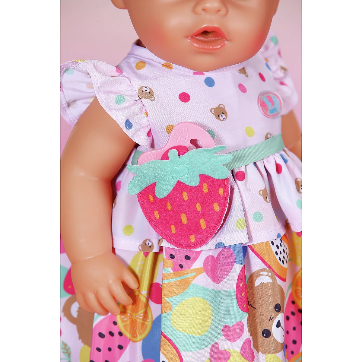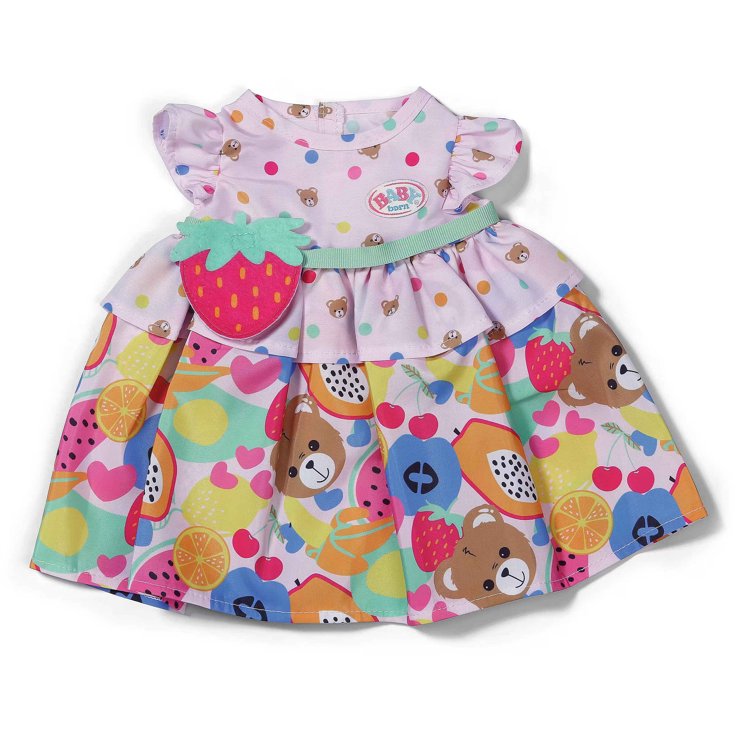 Description - BABY born Fruit Dress - uroczy strój z paskiem w kształcie truskawki dla lalek 43 cm - kolorowa sukienka z owocowym motywem i falbankami, która doda lalce wyjątkowego uroku. Do zestawu dołączony jest zabawny pasek z klamrą w kształcie truskawki, idealny do kreatywnego ubierania i stylizowania lalek. Strój pasuje do lalek o wysokości 43 cm, zapewniając komfort i radość z zabawy. Lalka nie jest dołączona.
