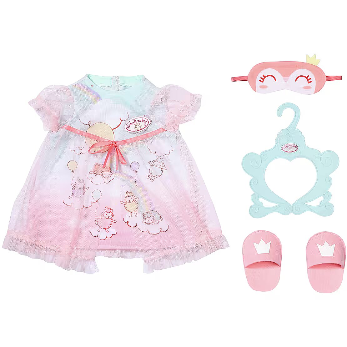 Description - "Peekaboo!" Baby Annabell nie chce jeszcze spać i bawi się w podglądanie swojej maski do spania! Oczy otwarte, oczy zamknięte, oczy otwarte, oczy zamknięte, oczy otwarte - ale teraz robi się już naprawdę późno. . . po prostu zdejmij te słodkie pantofelki a potem czas zamknąć oczy. W delikatnej koszulce nocnej z tiulową narzutką poczujesz się jak podczas snu na chmurach. Nadrukowane owce pokazują, jak to się robi. Słodkich snów! Oryginalne ubranka dla lalki Baby Annabell. Najwyższej jakości akcesoria pobudzają wyobraźnię i oferują nowe możliwości i bodźce do zabawy. Baby Annabell Słodkich snów Strój do spania 43cm z koszulą nocną, butami i maską do spania. W komplecie z wieszakiem na ubrania.