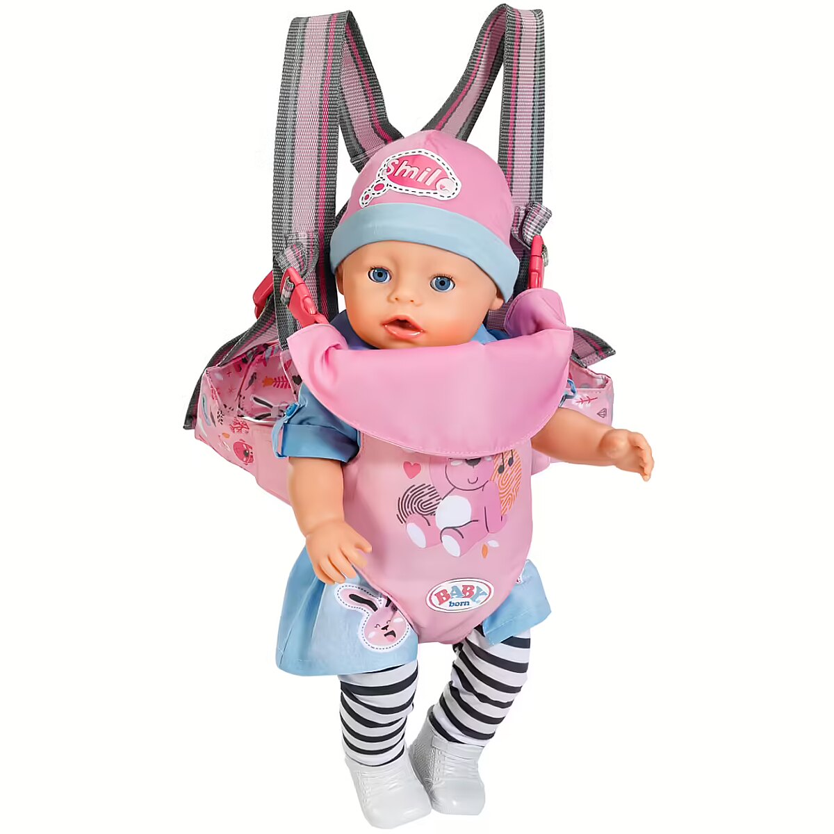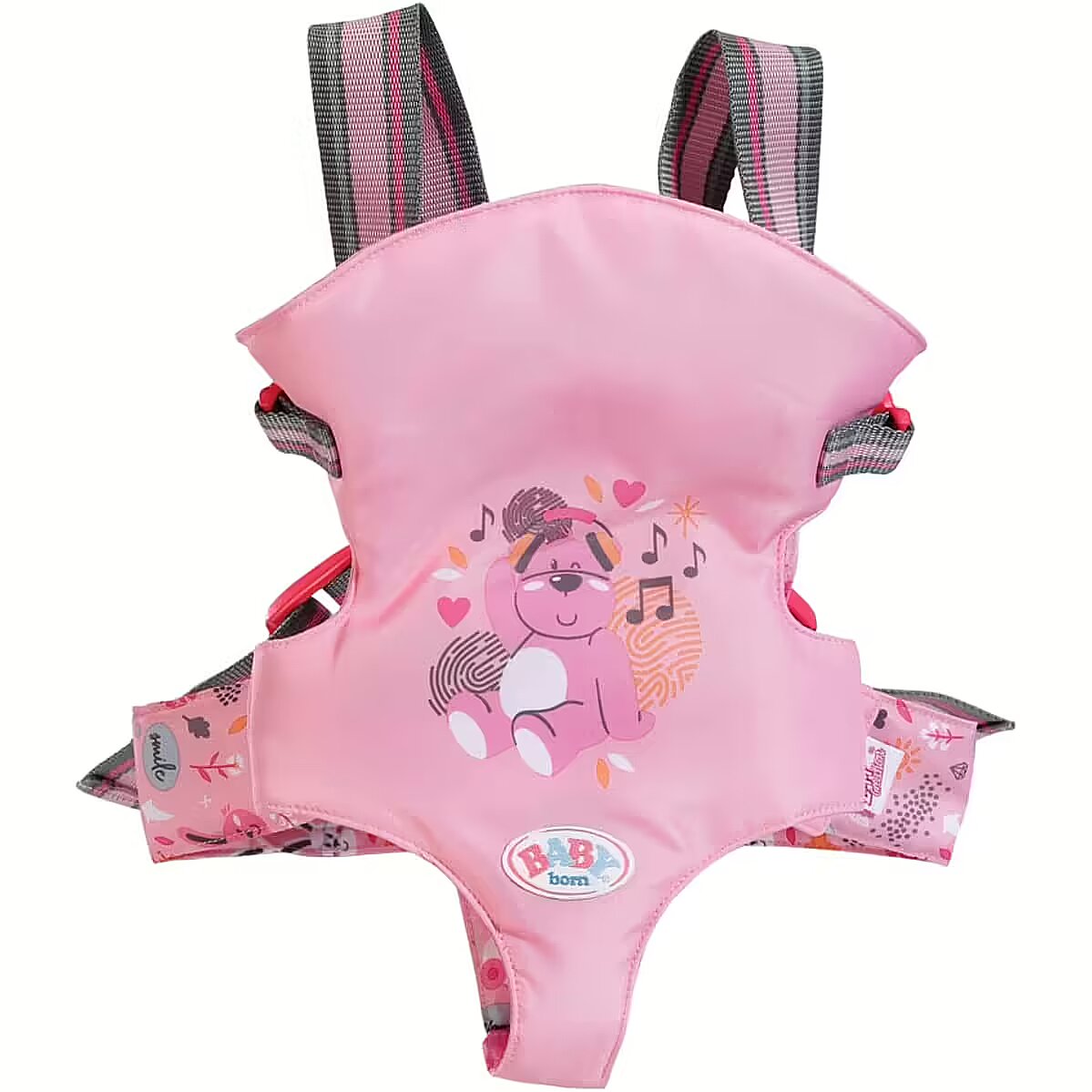 Technical_details - BABY born® baby carrier, doll accessories " Oh! Ah!...” BABY born can't stop pointing and kicking. There are so many great animals in the zoo. There she is, looking forward in her baby carrier and marveling at the goats, otters, deer & Co. In the cave with the bats she would rather sit backwards and be able to snuggle up to mum or dad. It's a bit spooky in the dark grotto. The inside and hip belt of the carrier are printed with cute graphics. B är Bruno sits just as relaxed on the pink outer fabric as BABY born on the inside. Thanks to the adjustable belt system, mom and dad can always take turns carrying it. Type: Doll Accessories EAN: 4001167832462 Manufacturer number: 832462 Series: BABY born® Age recommendation: from 36 months Target group: kindergarten children Warnings: Caution: Not suitable for children under 36 months! Warnings: Attention: Danger of suffocation due to small parts!