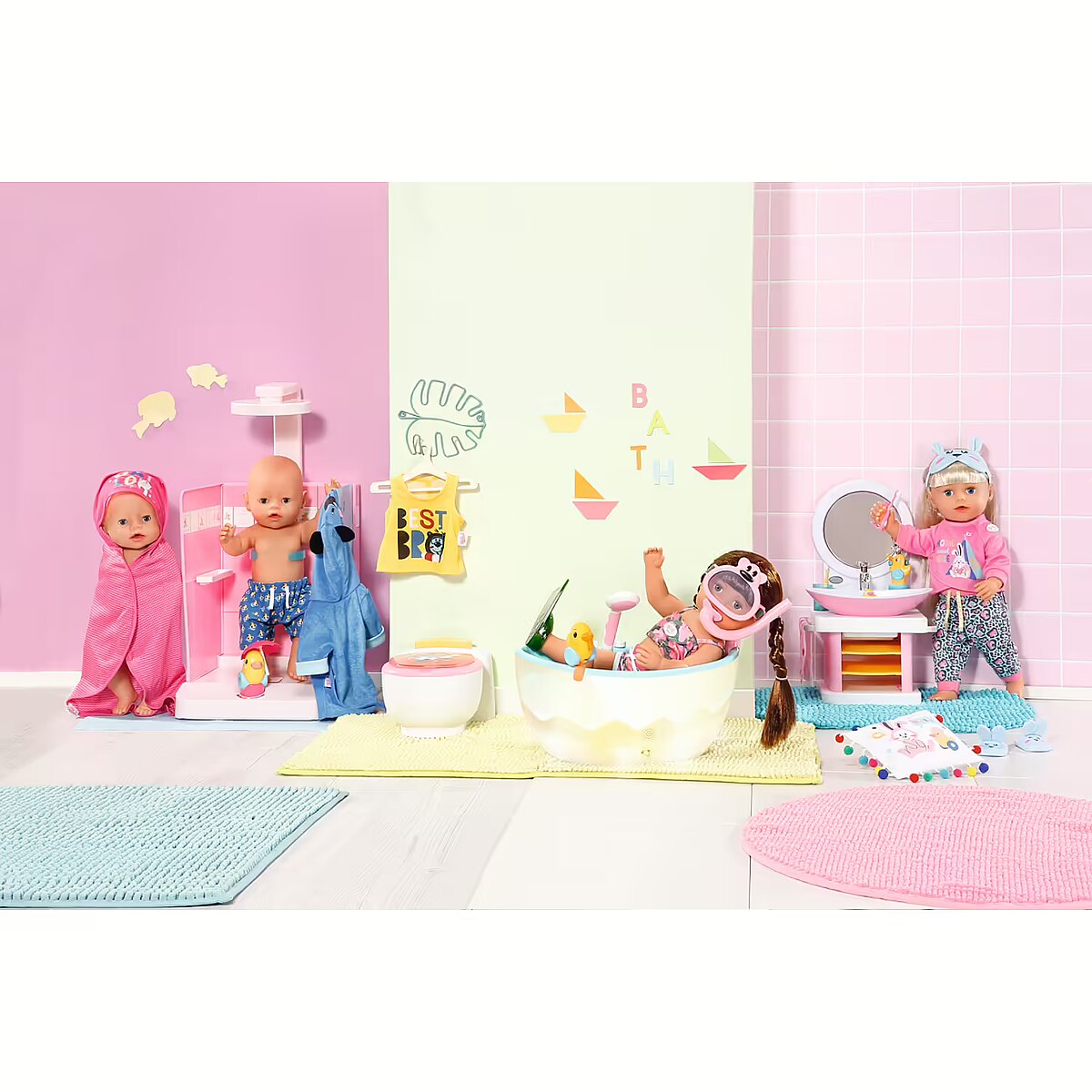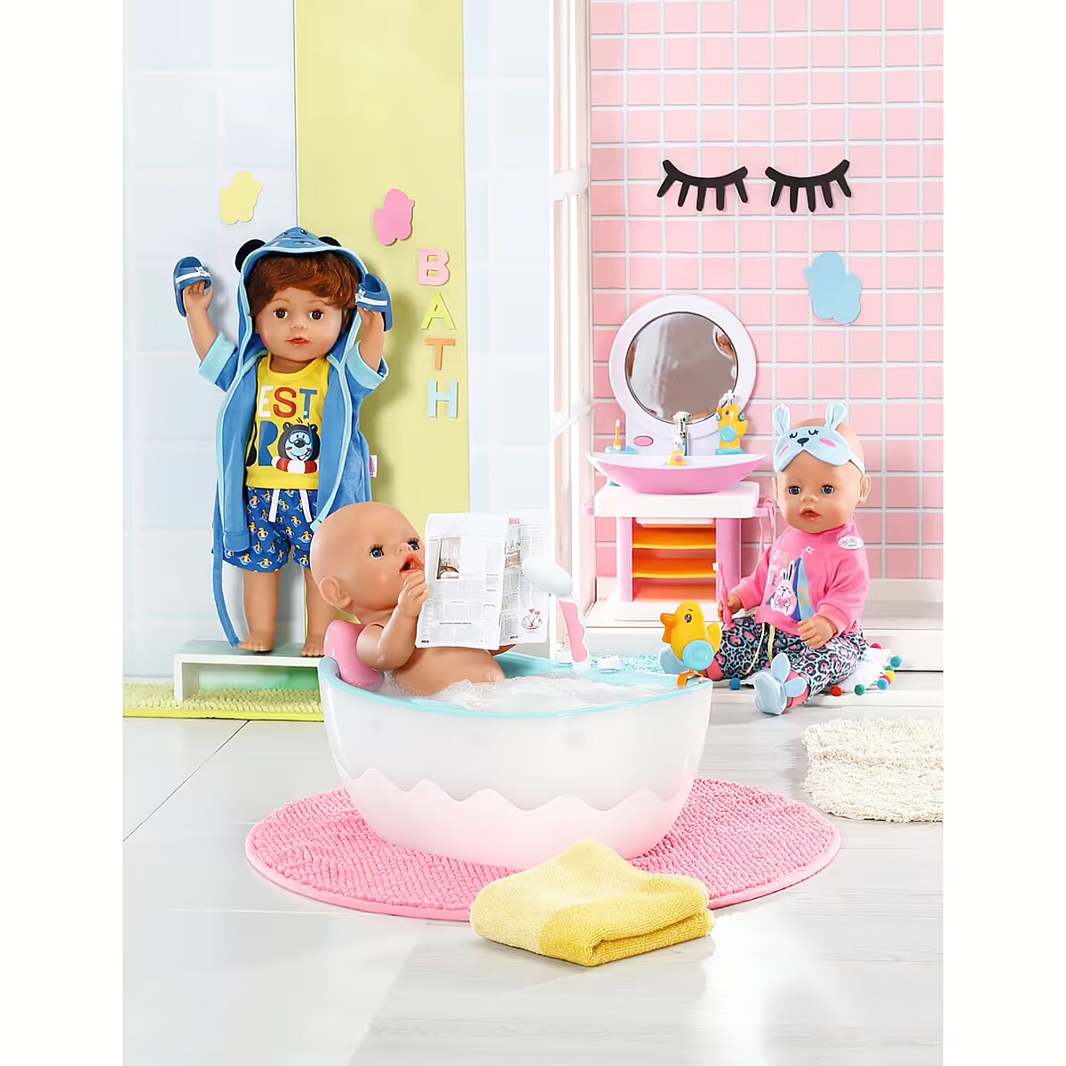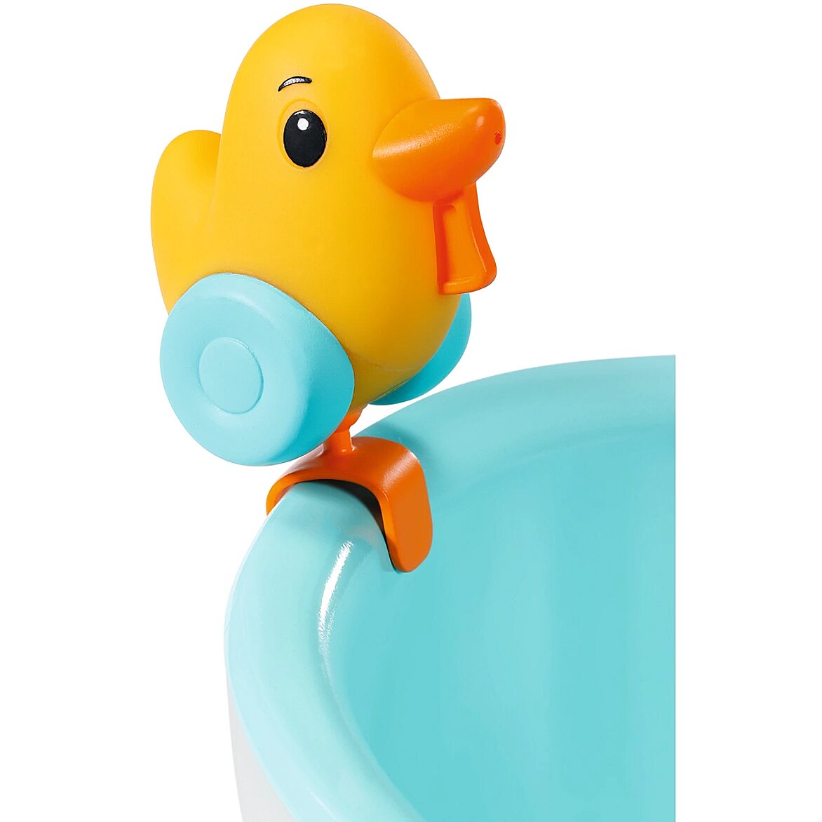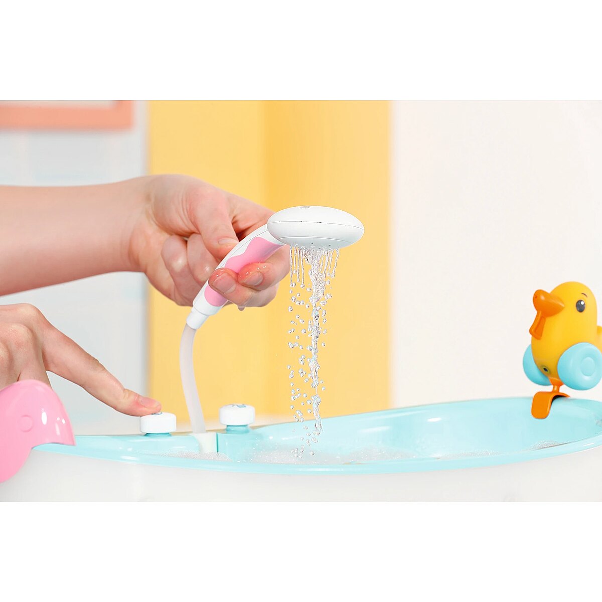 LongDesc - Take aim, fire, aaaand… GOT YOU! Brother is really wet now. A bath duck like this is just perfect for water fights. You can position it anywhere along the edge of the bathtub, just like the heart-shaped pillow. The tub is water-blue on the inside and white with an embedded wave shape on the outside. If you press the light switch next to the shower, the outer shell of the bathtub lights up in alternating colours. The shower button activates the pink and white shower. If the bathtub is empty, you can hear splashing and the typical watery sounds. If the bathtub was filled with water beforehand, the water now runs through the shower head, which can be tilted towards the bathtub so that no water drips outside the tub. You can also take out the hose in order to give BABY born a good wash or to soak Brother a little bit more. - High-quality accessories for the BABY born branded doll.- For enhanced, diverse and long-lasting fun through play.- Suitable for dolls in the sizes 36 cm and 43 cm.- Requires batteries (not included). BABY born Bath Bathtub with light and sound effects. Includes pillow and squirting duck.